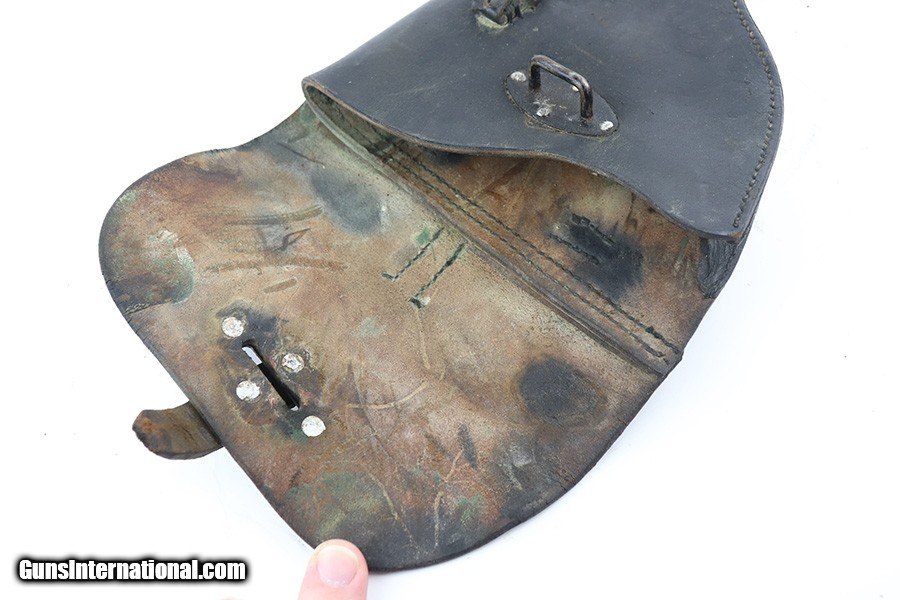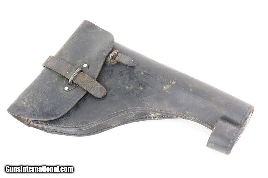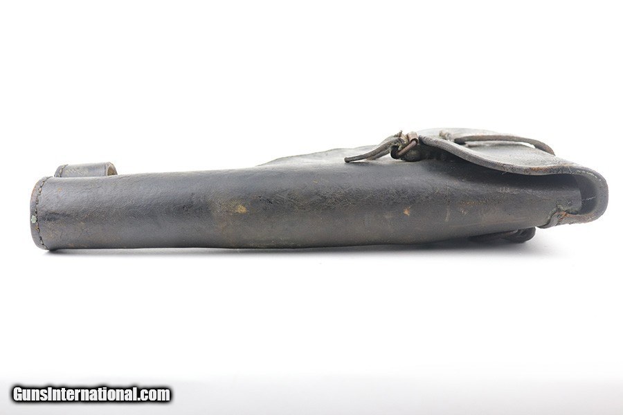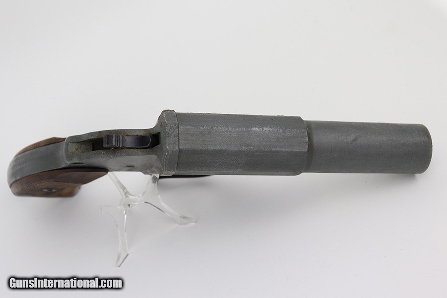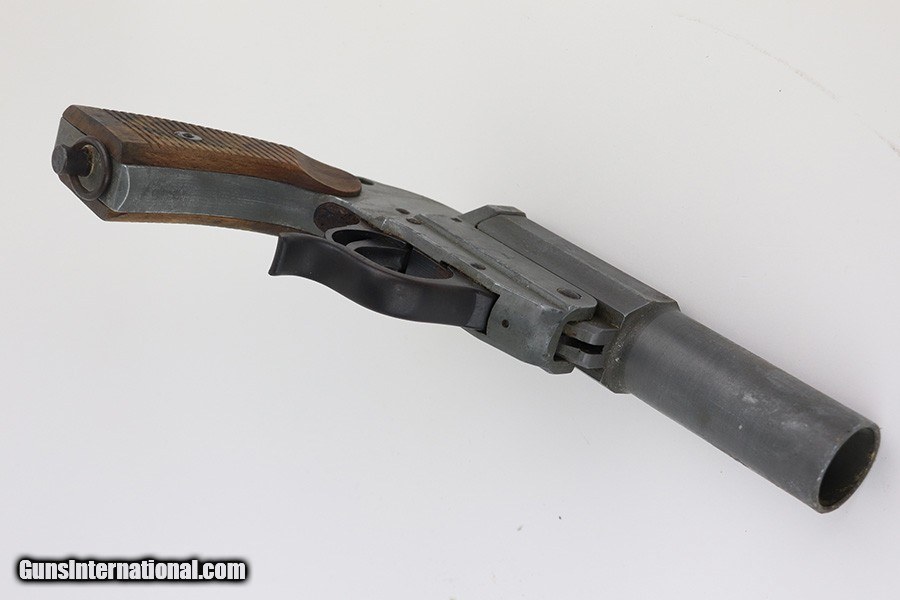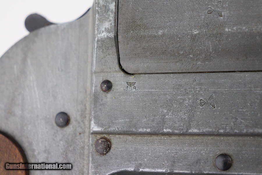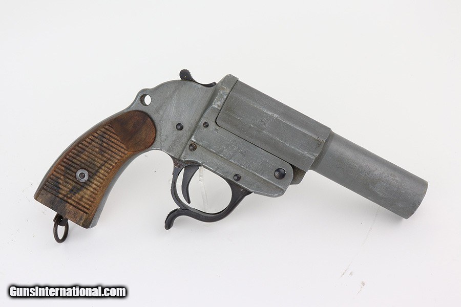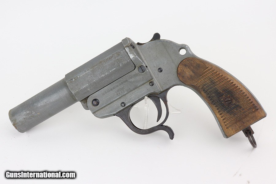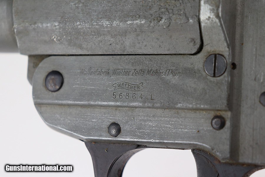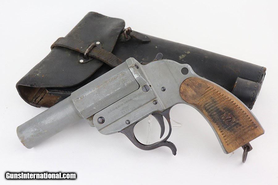 Description: This is a fairly scarce, late war Walther flare pistol from WW2. The pistol is made of zinc, and features wood grips. The right side of the pistol shows an eagle proof stamp which signifies black powder use only. The frame is also eagle 359 acceptance stamped. 6 inch barrel has a clean interior bore (no rifling). The exterior finish has some texture / rough areas around the barrel and edges of the frame. There's some surface rust on the interior and underside of the trigger guard. The wood grips are excellent. Comes with a post-war flare holster. SOLD Manufacturer: Walther Bore: 9/10 Condition: Good |
