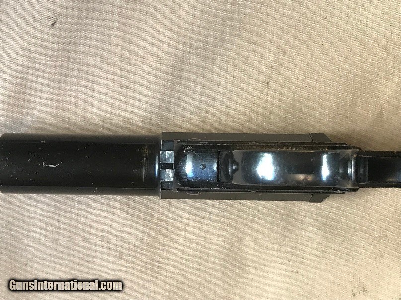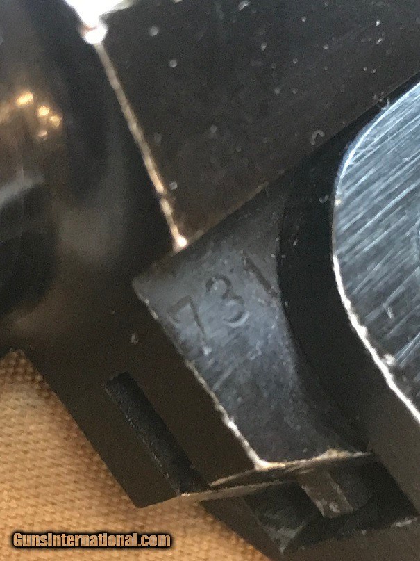 Description: Offered for sale is one (1) German Model 1934 Flare Pistol by Erma-Werke, Erfurt. The code stamp on this example is "ayf 42", 42 being the year of manufacture. The Model 1934 is made of Aluminum with steel internal parts. Surface is anodized black with this example retaining about 94-95% coverage. Bore is excellent. The barrel is tipped open by an unlocking lever just below the trigger guard. This Erma-Werke "ayf 42", has frame and barrel matching serial #7313h. #7313h example has the following features present: Wide spur hammer, grooves on the ejector cam (the release lever), housing for the locking lever spring, no cocking indicator, and the lanyard ring carrier is spherical. Should you have a copy of "German Flare Pistols and Signal Ammunition, by Dr. Lorent Scheit, refer to page 48. For sale only in Lower 48 states USA. Shipping $20. Payment by: Personal Check (must clear before shipping), Bank MO, USPS MO. No FFL is required on flare pistols. SOLD |