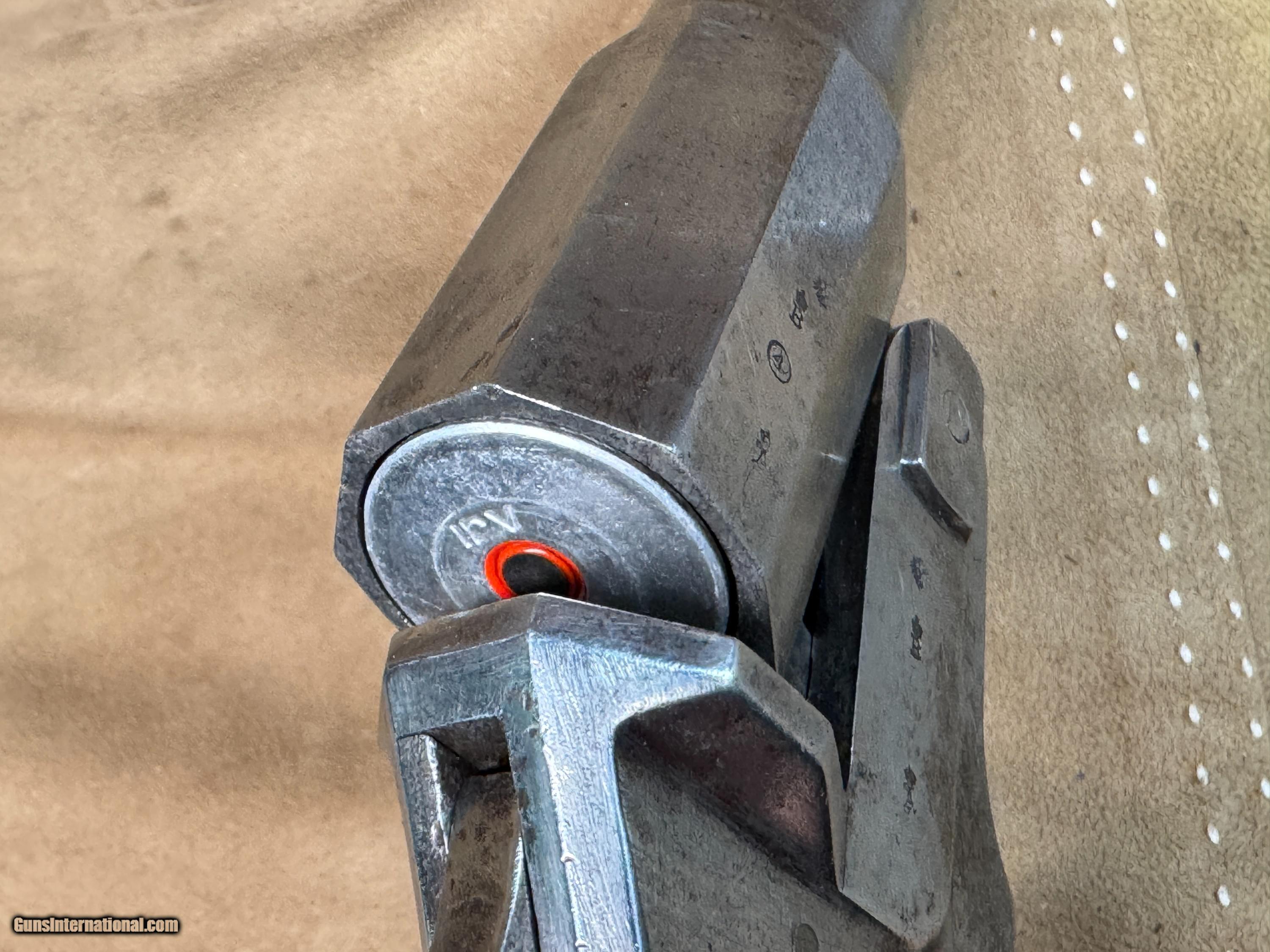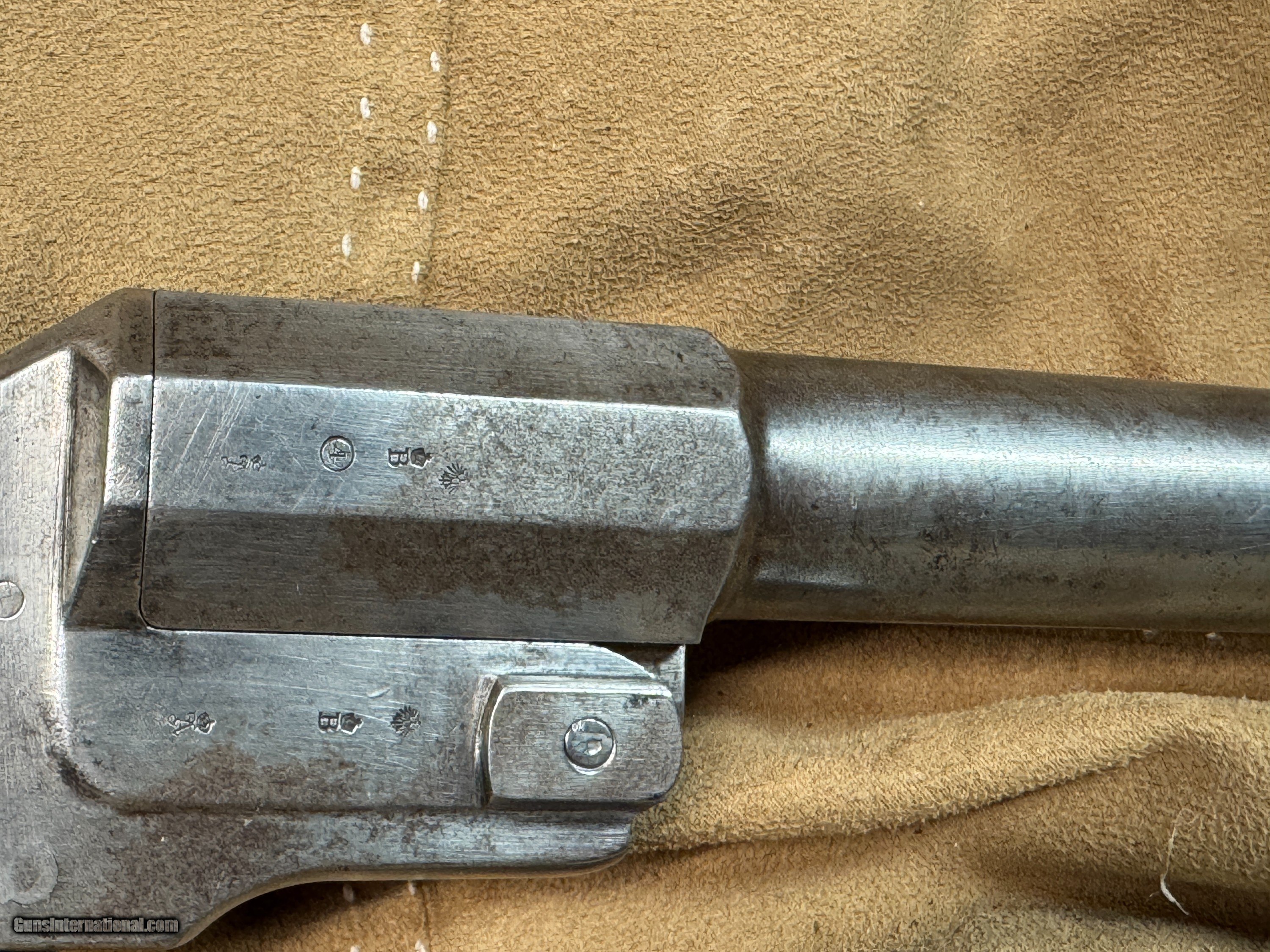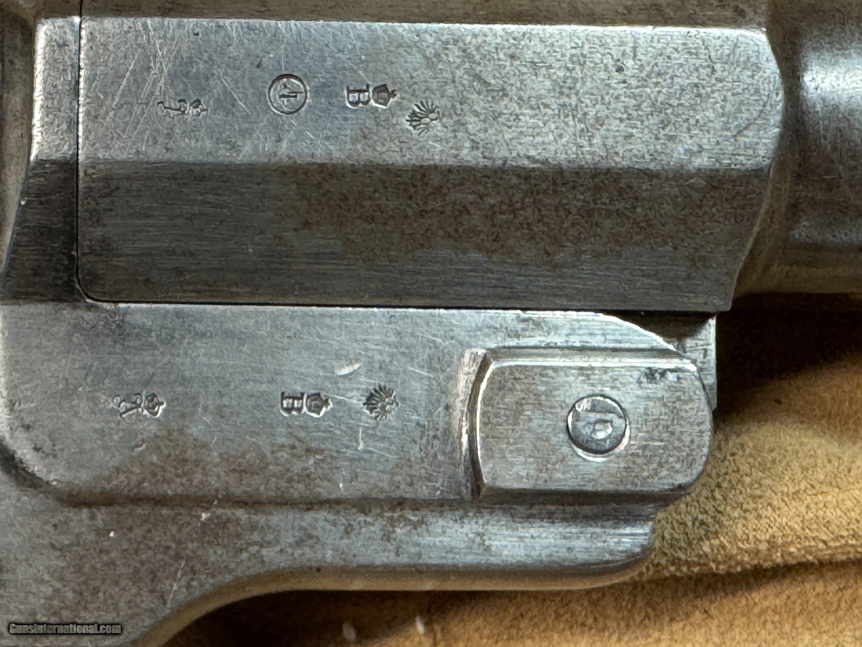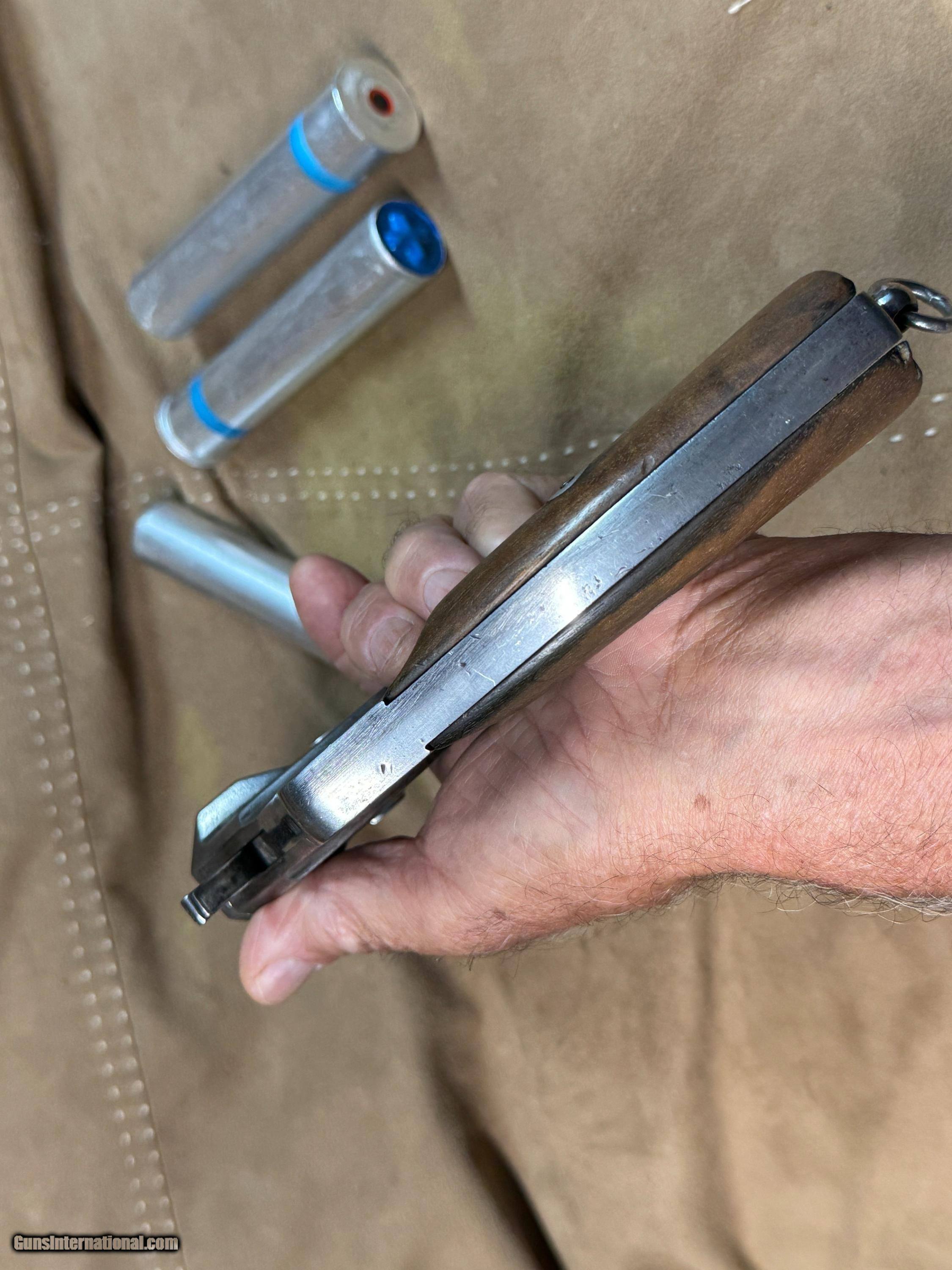 Description: Good looking gun all assembly numbers (60) match. The gun has a lot of proof and marke on one side. The other has CHR.F 16360 . Mechanically very solid. 3 live flares one of 4 was tested near hit the moon. This model was nickle plated seen on areas on the receiver.search as follows. These flares are near impossible to find. Im adding them to the listing rather than selling them seperately. Original German WWI Model 1894 Hebel Flare Pistol by Christoph Funk - Serial 16360 SOLD Antique: Yes |