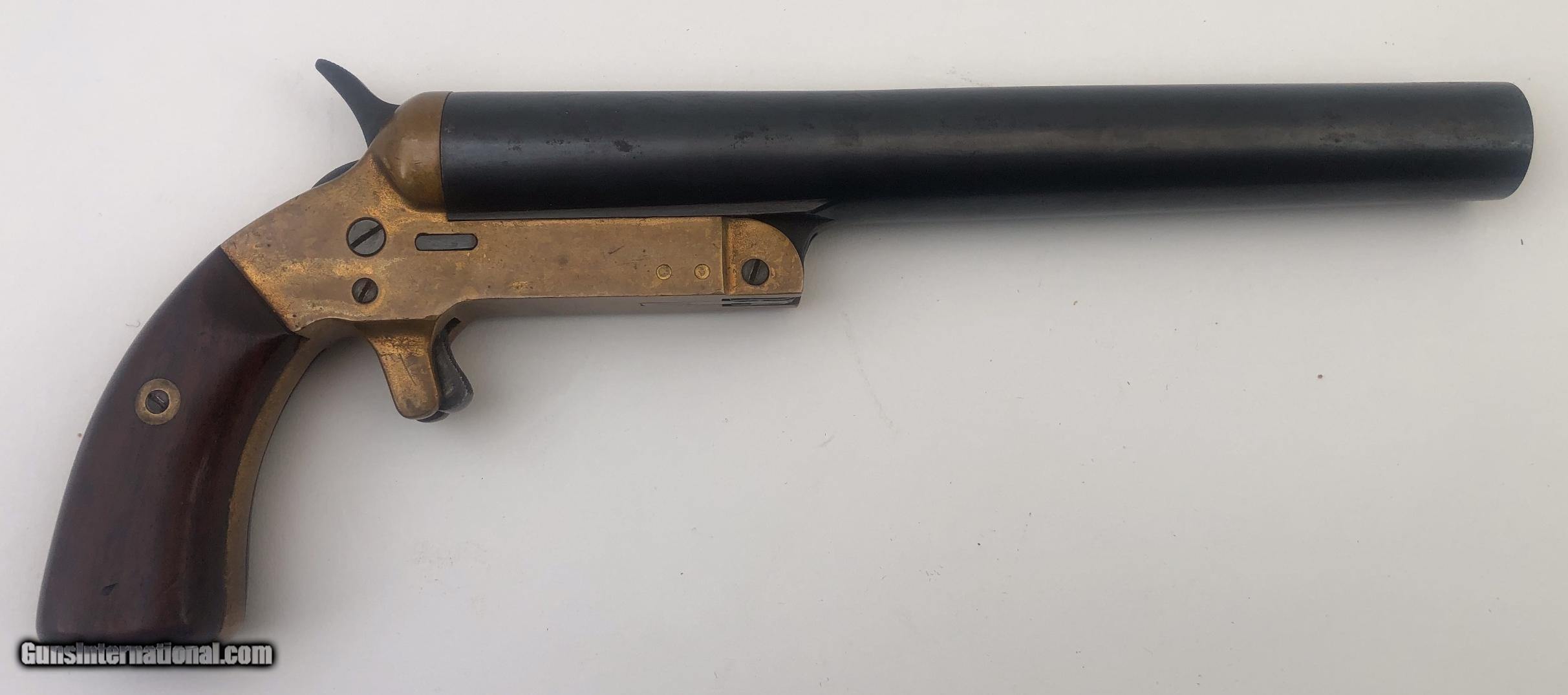 Description: A very high condition example retaining almost all the original blue barrel finish. The grips are excellent and the brass frame retains approx. 5% of the original gold wash in protected areas the balance shows a beautiful age patina. Mechanicaly perfect and the bore is very good. The bore measures .86" Flare guns are not controlled by any Federal regulations SOLD Manufacturer: Remington Model: Mk 111 Serial Number: 11611 Barrel Length: 9 |
