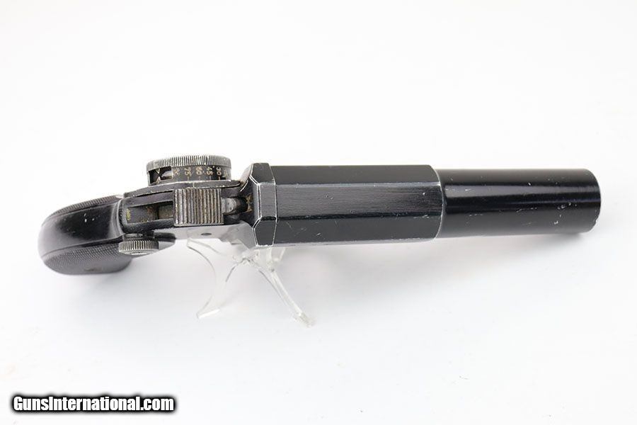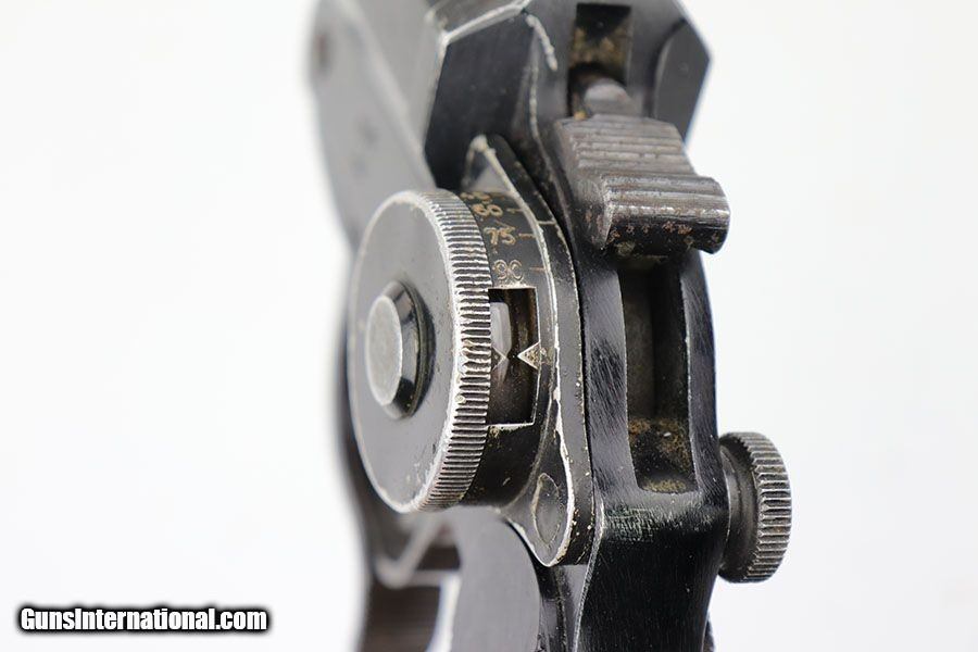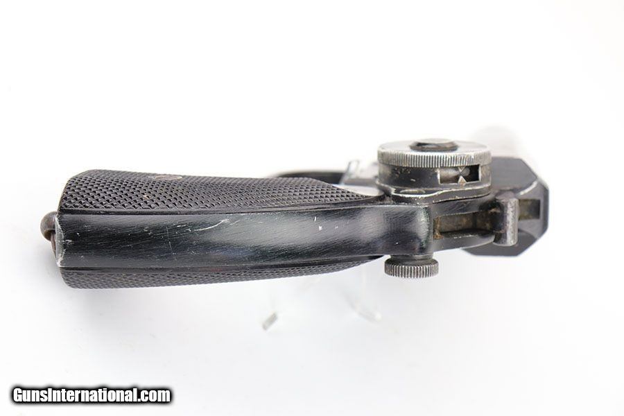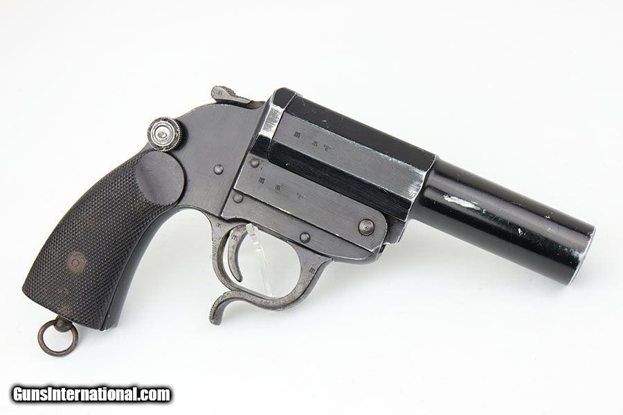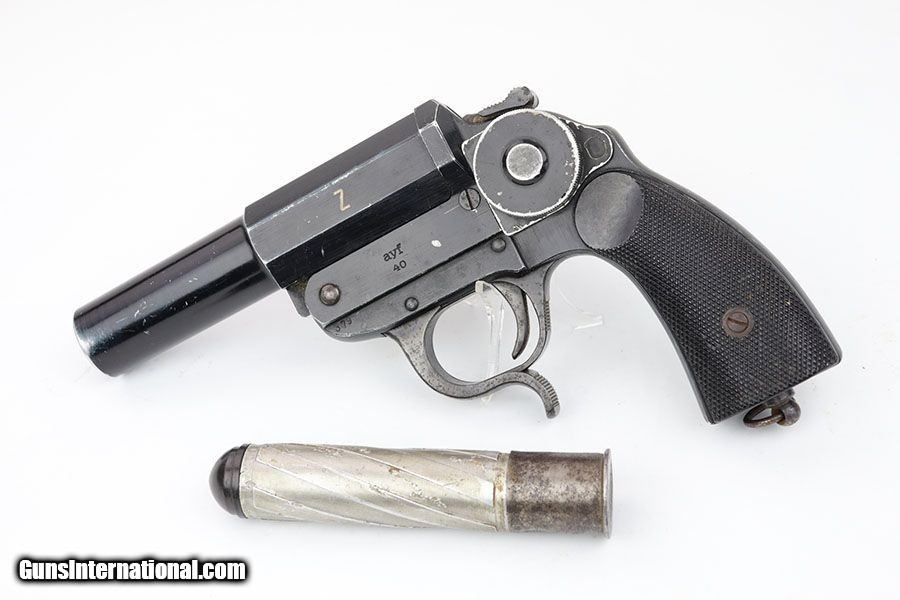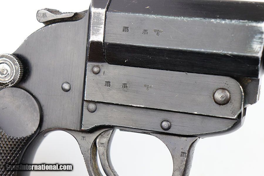 Description: This is a scarce example of an original WW2 Nazi Kampfpistole that was manufactured by the Erma factory. These early kampf-pistols were based on the original Leuchtpistole (flare pistols) design, only they were intended to be used as both a signaling and a "anti-personal" weapon, as they had a unique rifled barrel that could shoot a 25mm rifle grenade, which were the same type of round as used in the K98 service rifle grenade launchers. They are easily identified as the side of the barrel were stamped with a large capital letter "Z" that was filled with luminous paint. This gun is especially rare because it has an ultra-rare adjustable sight on it. It is hard to see in the photos, but it still has the original fluid inside and still shows the leveling bubble. It is also marked "ayf 40" on the left side of the frame. On the right side of the pistol, the hammer, barrel, frame, trigger guard, and trigger, are all "Eagle 280" marked. Overall, this example is in very nice condition. There is wear in the finish around the muzzle, one area of wear on the right side of the barrel, and general wear around the high edges. It is fully functional. It comes with one deactivated rifled round. The bore is excellent - strong rifling with a very minor amount of frosting. Because it can shoot explosive rounds, an FFL is required. SOLD Curio/Relic: Yes Manufacturer: Erma Erfurt Model: Flare Pistol Serial Number: 042820 Caliber Info: 25mm Condition: Very nice Bore Condition: 8.5/10 Manufacture Date: 1940 |