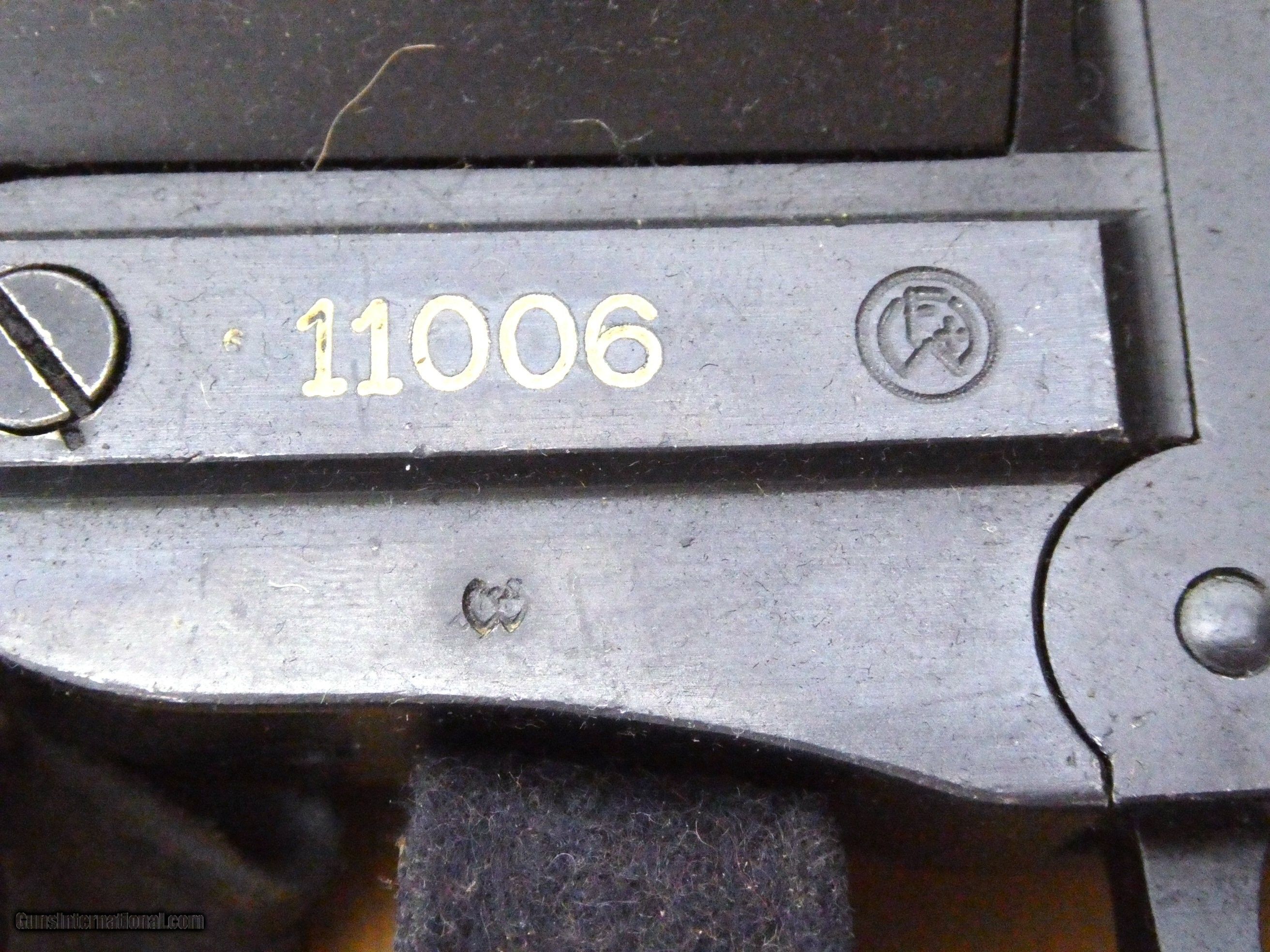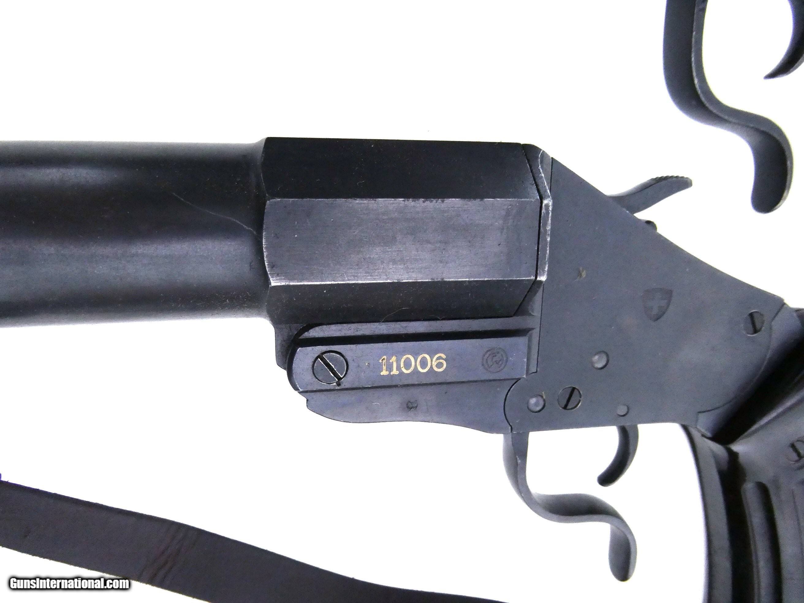 Description: Scarce WWII 34mm bunker Raketenpistole set used for signaling and illumination. One is made by SIG and marked Waffenfabrik Neuhausen. The other pistol was made by the Federal Waffenfabrik in Bern. The SIG variant is a converted model 1917. 10.6" barrels, good bore condition, some loss of blue metal finish, especially on the chamber of the SIG. Complete with original manual and slings. OAL=16.5" Price: $778.00 Shipping: $55.00 Contact Seller |