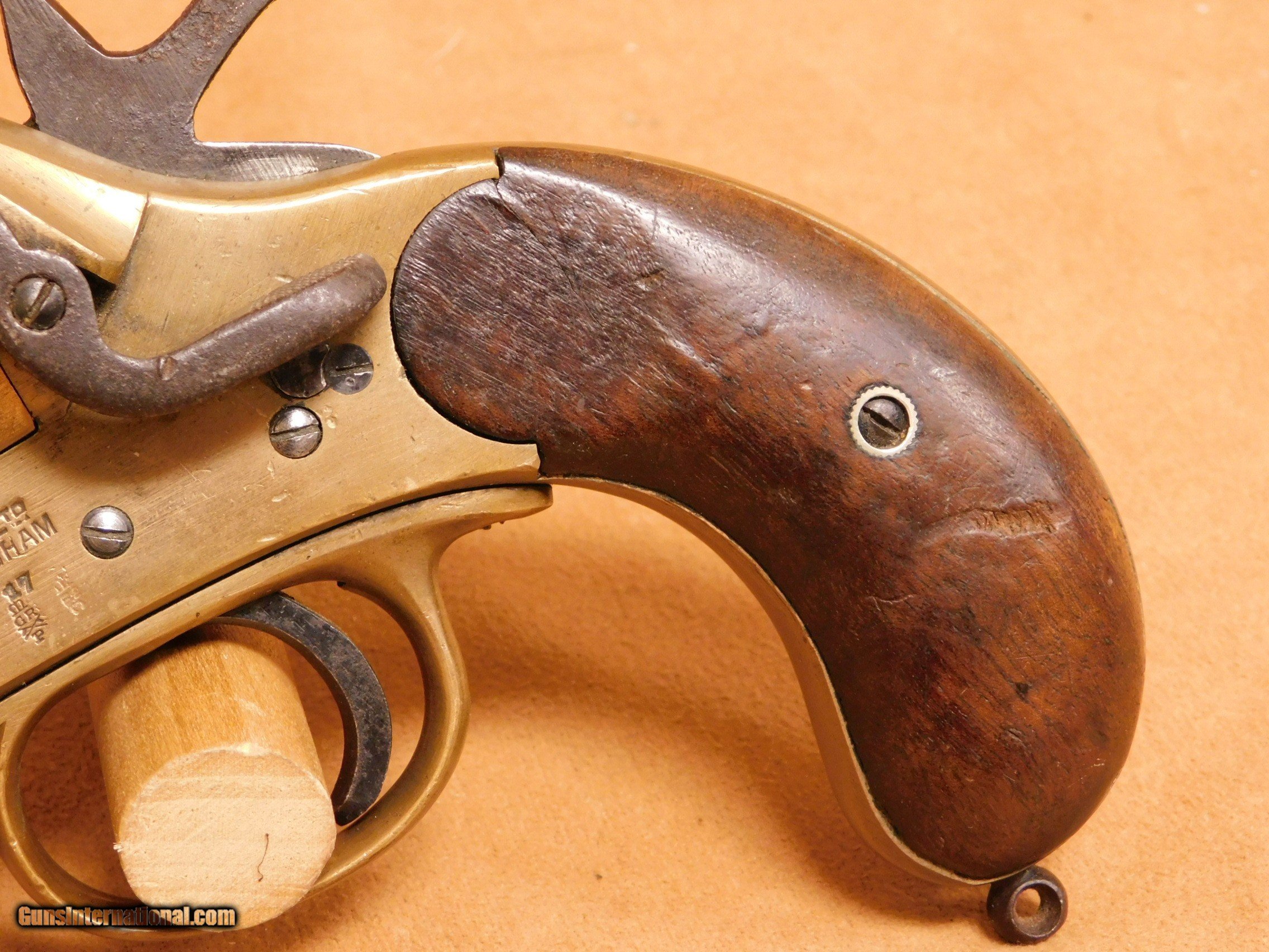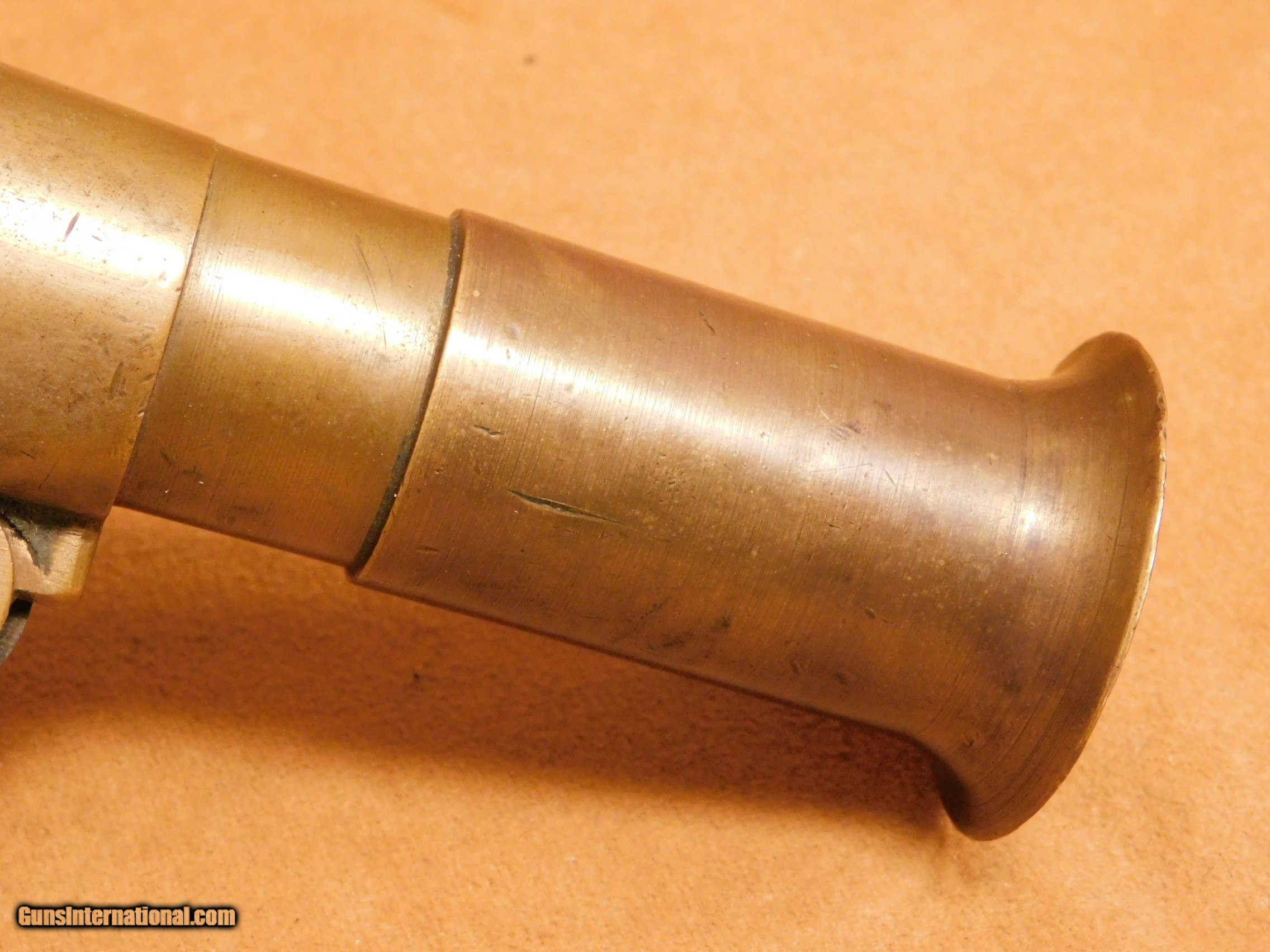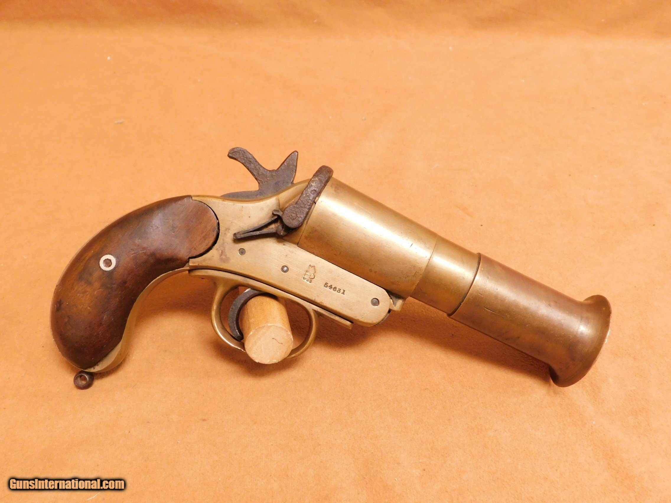 Description: This is a Webley & Scott No 1 Mk III flare pistol. It was manufactured in Birmingham, England in 1917. These pistols were introduced in 1914 and were used extensively by British and Empire armed forces during World War I. This gun is mainly brass with wooden grips. The muzzle was flared to deter users from holding near the muzzle with their hand. There is also a safety device whereby it cannot be loaded when the hammer is cocked. It weighs 2 lb 2 oz. and has an overall length of 9.75 inches. This gun appears to both function and locks up just fine. Since this isn't a firearm by ATF definition, no FFL is required on this piece. All items are also available for sale in our brick & mortar store and are subject to prior sale. Think long, think wrong. Payment On firearms, we typically only accept credit cards or money orders/cashier's checks.