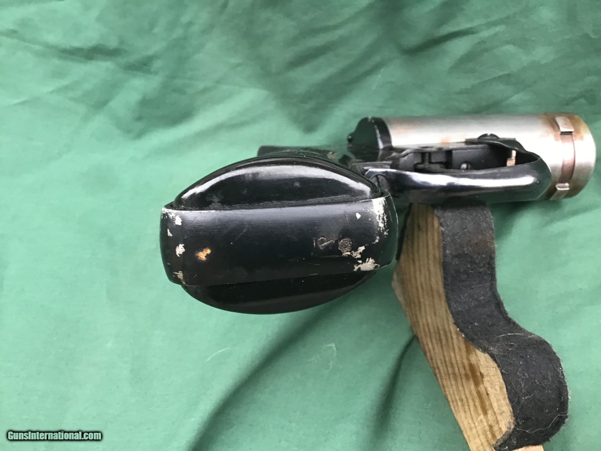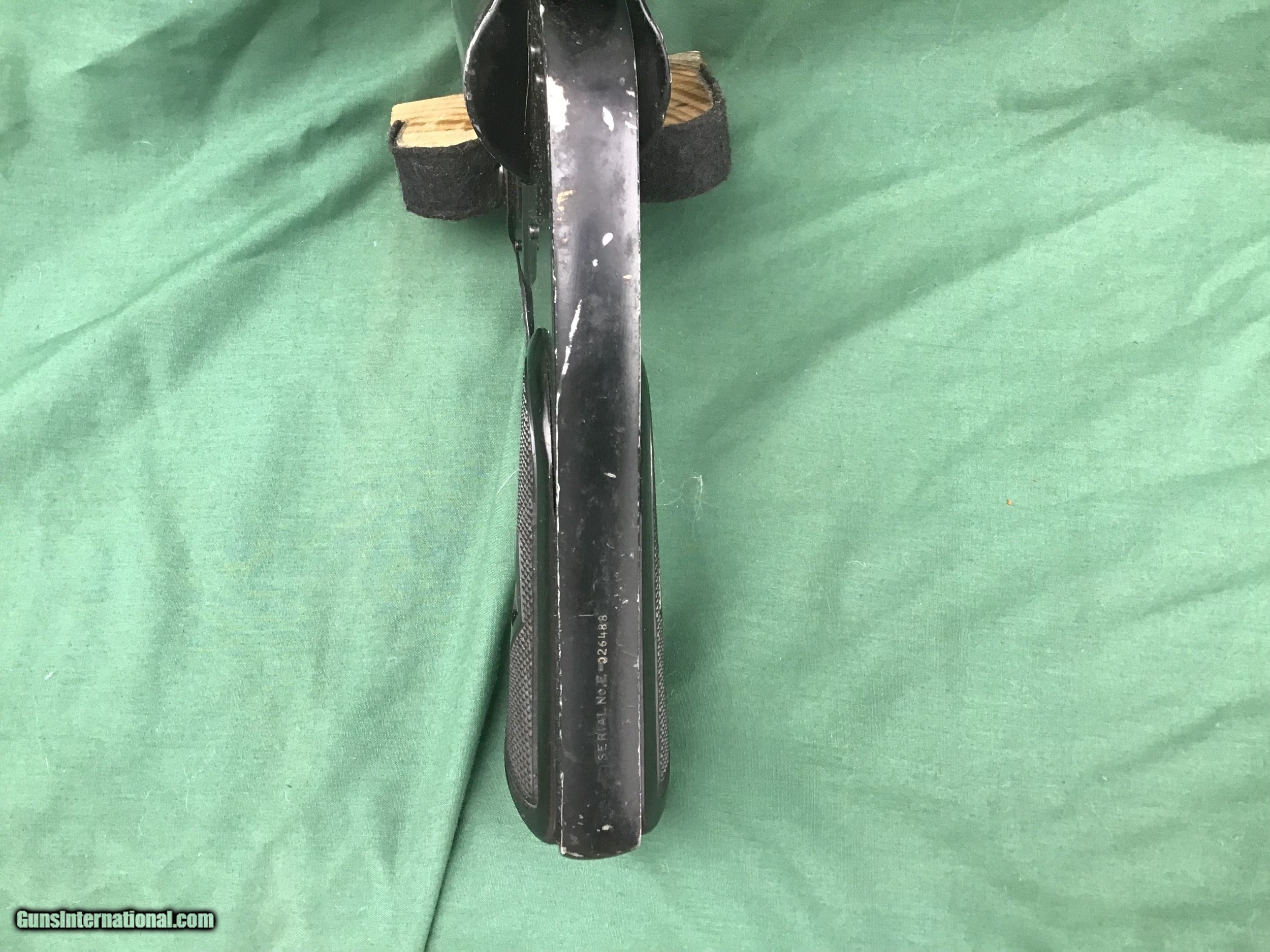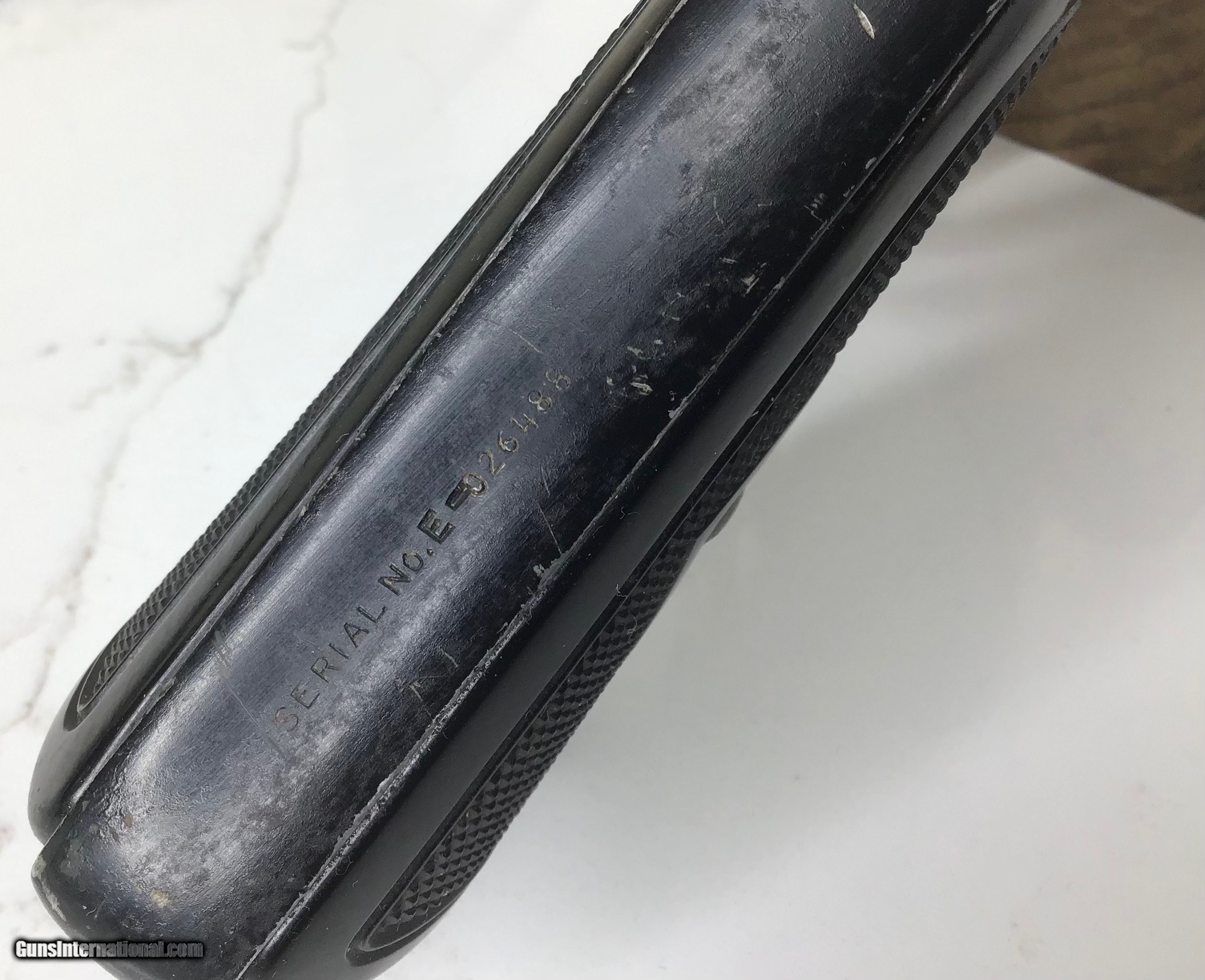 Description: Sold Adopted by the U.S. Army Air Forces and the U.S. Navy in July 1942 with production ending in the 1950s. Right side of the aluminum frame has the factory/U.S. markings inside a triangle: "E / V / CC/V / 1942 / U.S. PROPERTY / PISTOL PYROTECHNIC M-8". The serial number is stamped on the back strap. Steel barrel and checkered black plastic grips, with the butt stamped with the letter "p" and an ordnance cartouche. The frame retains 85-90% original blue finish with some minor flaking and some minor thinning. There is some minor pitting and spotting. The barrel has a smooth gray patina with minor spotting. The grips are very fine with some minor scratches along with a few minor nicks in the overall crisp checkering. Please feel free to ask questions. SOLD Curio/Relic: Yes |