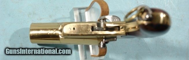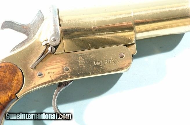 Description: WW1 or WWII ORIGINAL BRITISH WEBLEY & SCOTT BRASS MK.III OR MARK 3 "1915" BRASS SIGNAL OR FLARE PISTOL. Dated 1915 and having crisp 'Webley & Scott Ltd." "London & Birmingham" stamp on left side along with all the correct WW1 British acceptance stamps. Opposite with 'W&S" next to logo along with serial number. . Various British "broad arrow" inspector's stamps on barrel too. Tight lockup. Original wood grip panels. Lanyard ring along with brass ring. Missing triggerguard (often removed to cut down on weight as did not affect function. Accepts 26.5mm flares and will work with modern ammo so you can have a classic signal/flare on your boat or backyard. Used extensively during the Great War for trench warfare use and the design went on to further uprgades based on this design into WW2. SOLD |