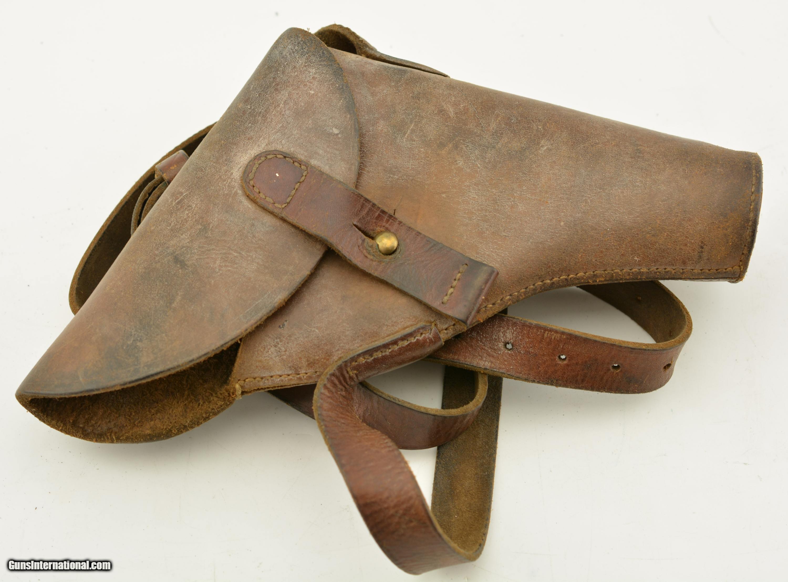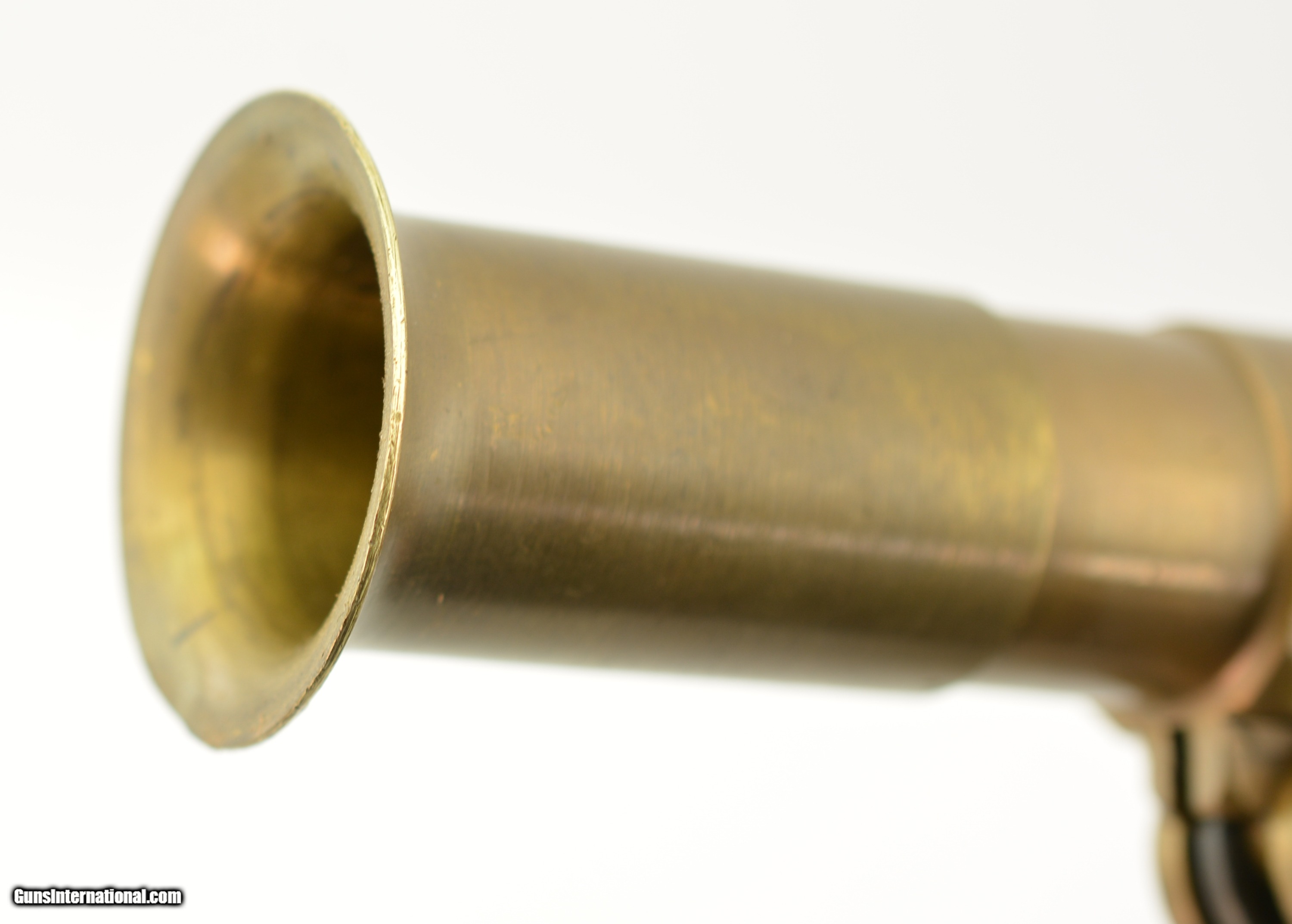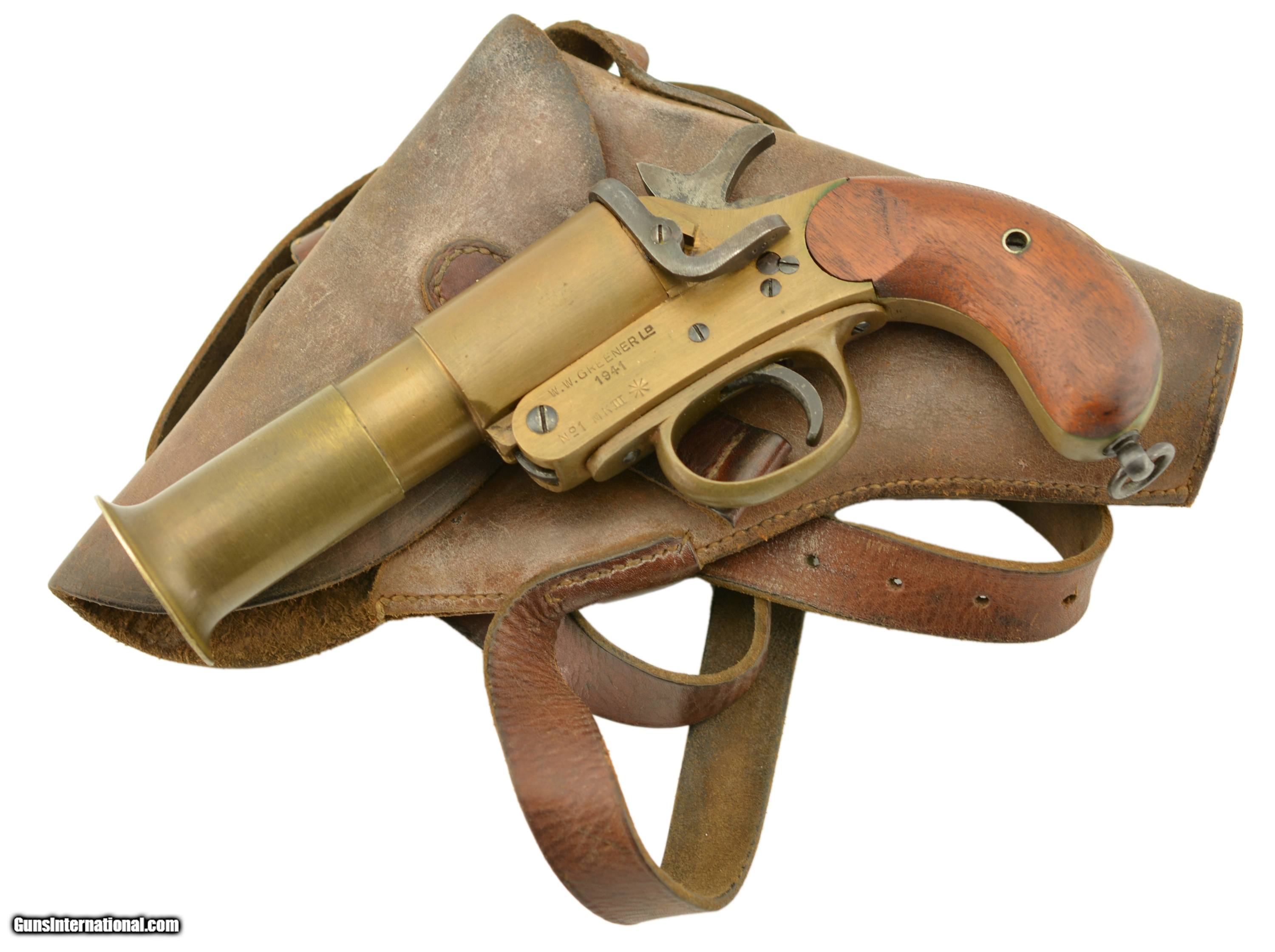 Description: This is a WWII British No. 1 Mk. III* Brass Signal Pistol manufactured by W.W. Greener in 1941. This brass signal pistol is in excellent condition with 5 3/4" barrel with almost no signs of use with sharp edges and nice patina. It is marked W.W. Greener Ld 1941 over No.1 MKIII * has a tiny logo ahead of the trigger-guard and a K stamped behind the trigger-guard. It is stamped serial #106 on both the right side of the frame and the barrel but there are no other markings, British or commercial on the pistol. The wooden grips are in excellent original condition with even less than normal bumps and great patina. Has operating lanyard loop. The accompanying British military brown leather holster is maker marked B.H.G. 1942, Broad Arrow over 84 has outstanding heavy leather, tight stitching and great hardware with built in adjustable strap. The finish on the holster speaks of age and mild use. Pistol fits well and is fully protected. Excellent pair for any collection, you will seldom see better. SOLD Manufacturer: Greener Model: Flare gun |
