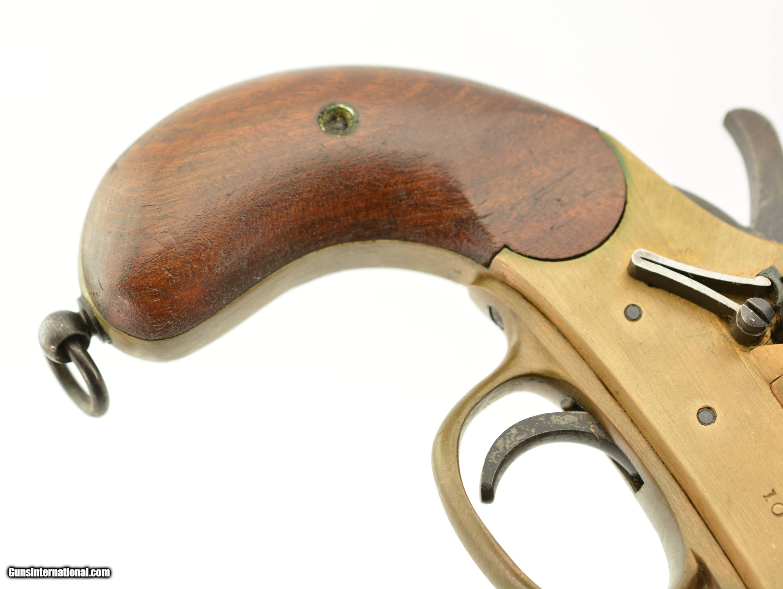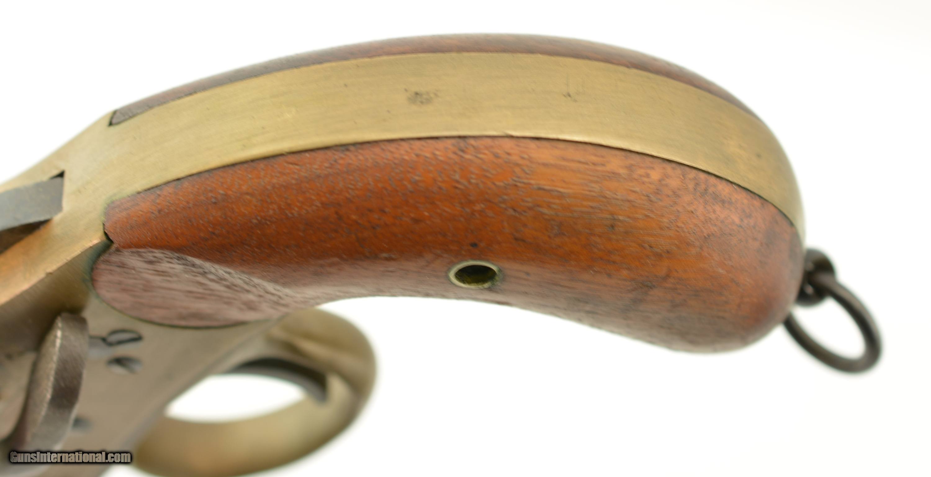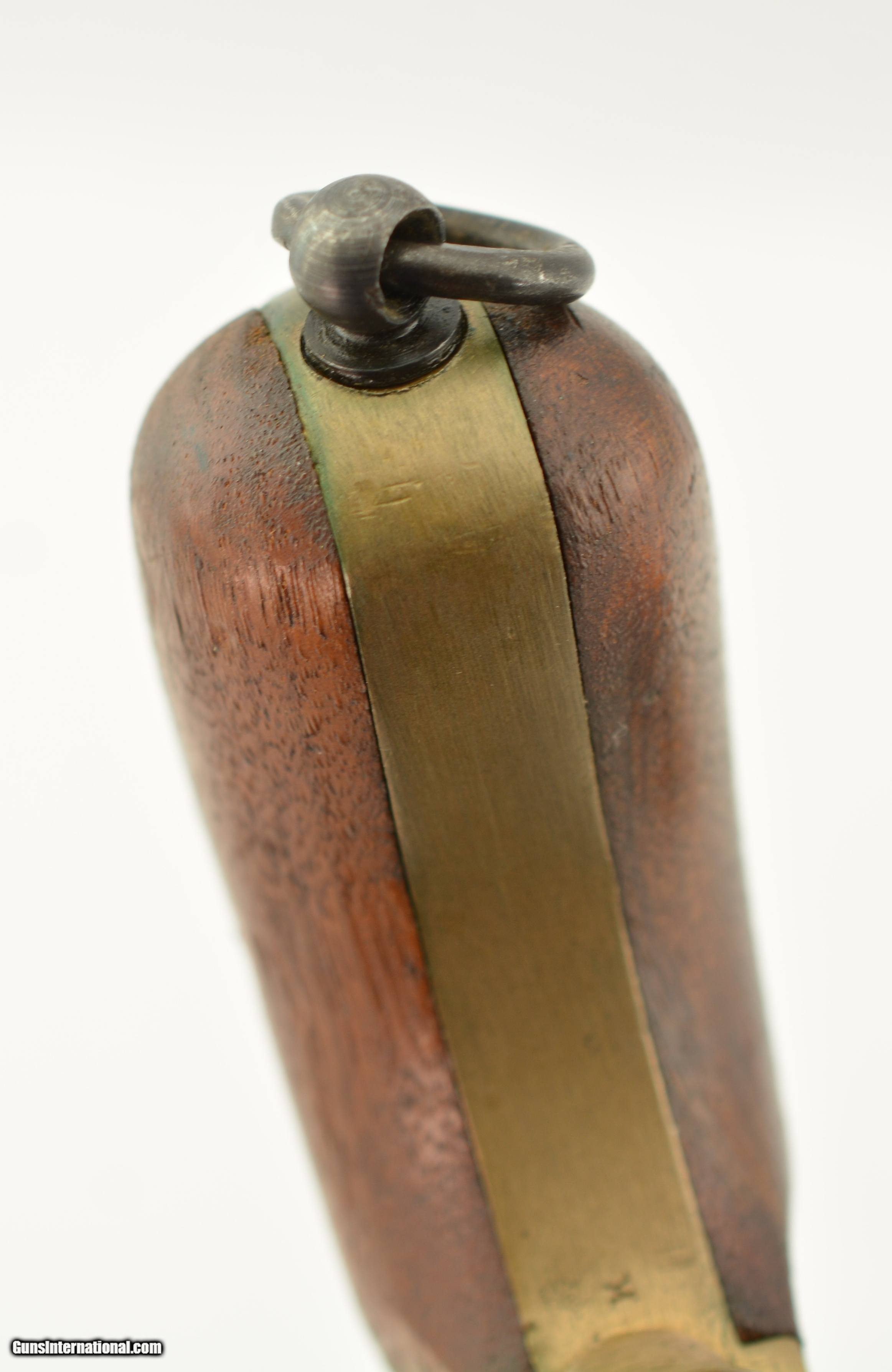 Description: This is a WWII British No. 1 Mk. III* Brass Signal Pistol manufactured by W.W. Greener in 1941. This brass signal pistol is in excellent condition with 5 3/4" barrel with almost no signs of use with sharp edges and nice patina. It is marked W.W. Greener Ld 1941 over No.1 MKIII * has a tiny logo ahead of the trigger-guard and a K stamped behind the trigger-guard. It is stamped serial #106 on both the right side of the frame and the barrel but there are no other markings, British or commercial on the pistol. The wooden grips are in excellent original condition with even less than normal bumps and great patina. Has operating lanyard loop. The accompanying British military brown leather holster is maker marked B.H.G. 1942, Broad Arrow over 84 has outstanding heavy leather, tight stitching and great hardware with built in adjustable strap. The finish on the holster speaks of age and mild use. Pistol fits well and is fully protected. Excellent pair for any collection, you will seldom see better. SOLD Manufacturer: Greener Model: Flare gun |