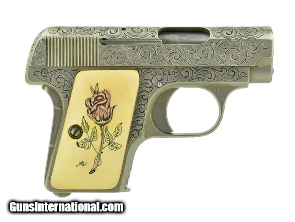 Description: FN 1906 .25 ACP caliber pistol. Belgian made pocket pistol, beautifully engraved, with satin nickel finish and fancy grips.