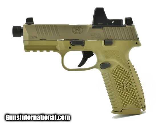 FN 509 9mm caliber pistol. Tactical Model with threaded barrel and Trijicon RMR with case.