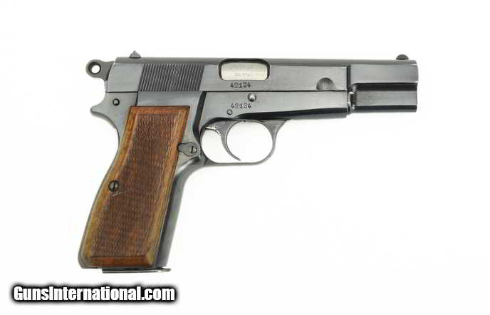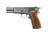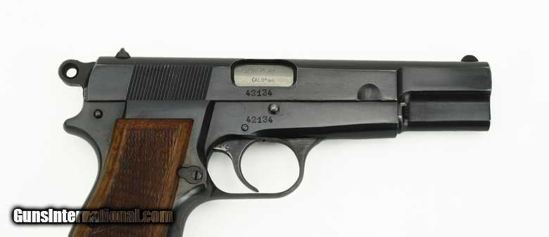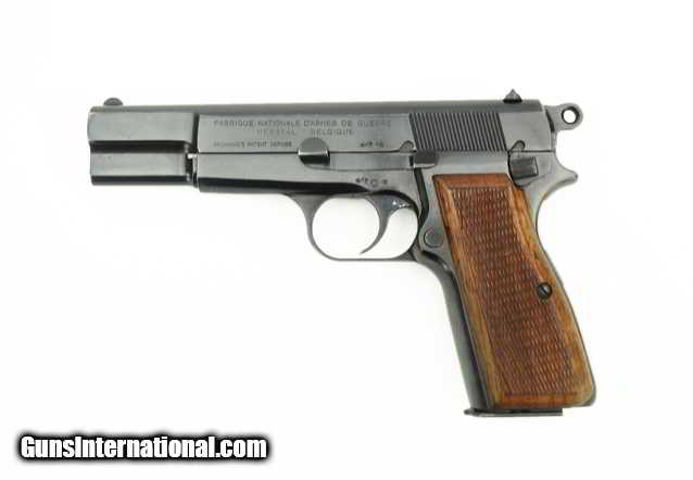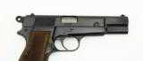 FN Hi-Power 9mm caliber pistol. Early post-war model with internal extractor and thumb print slide. Excellent condition.