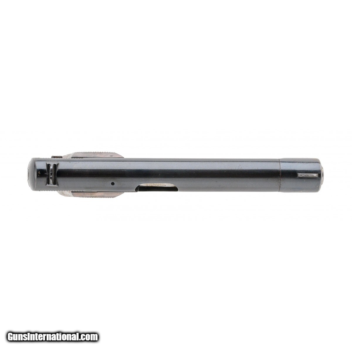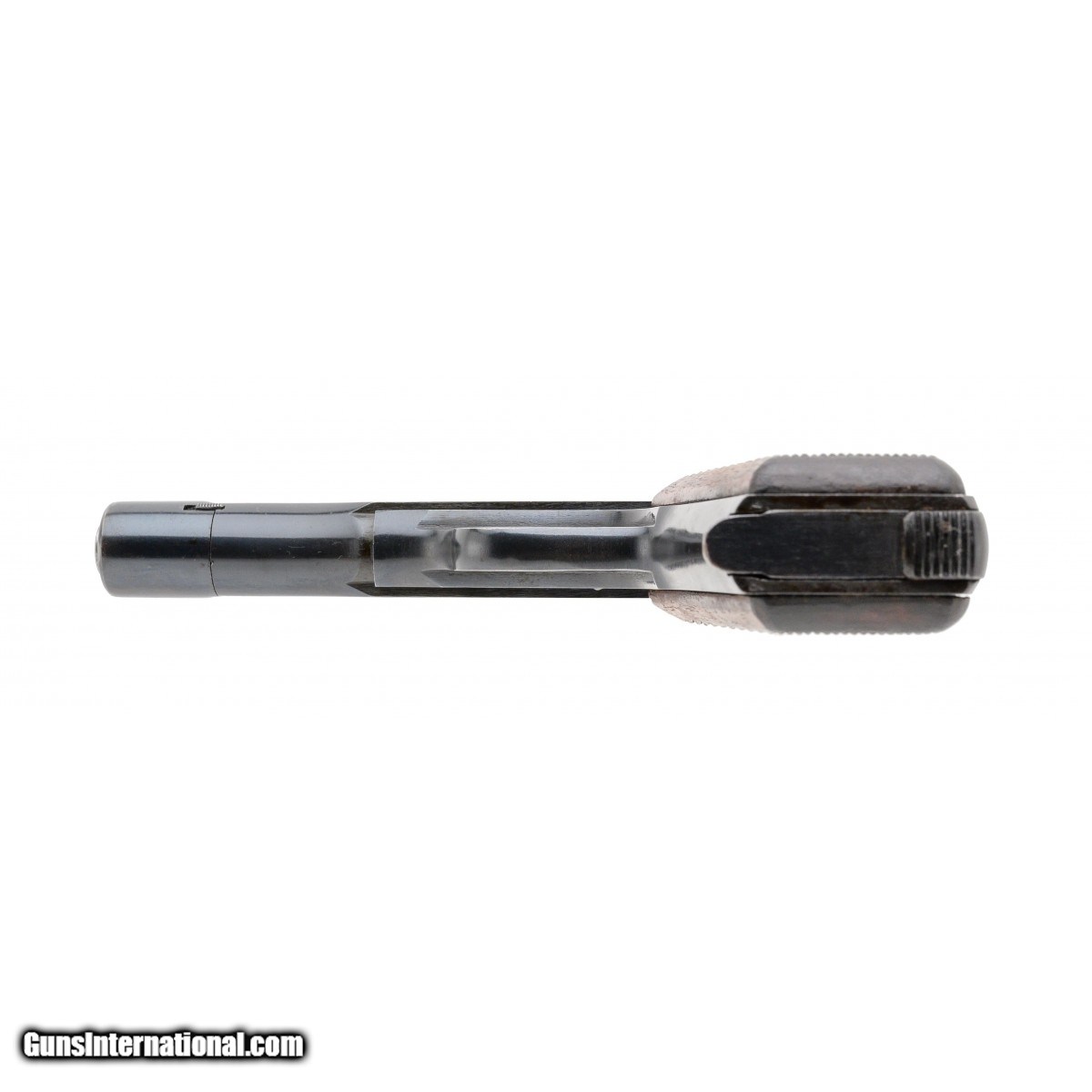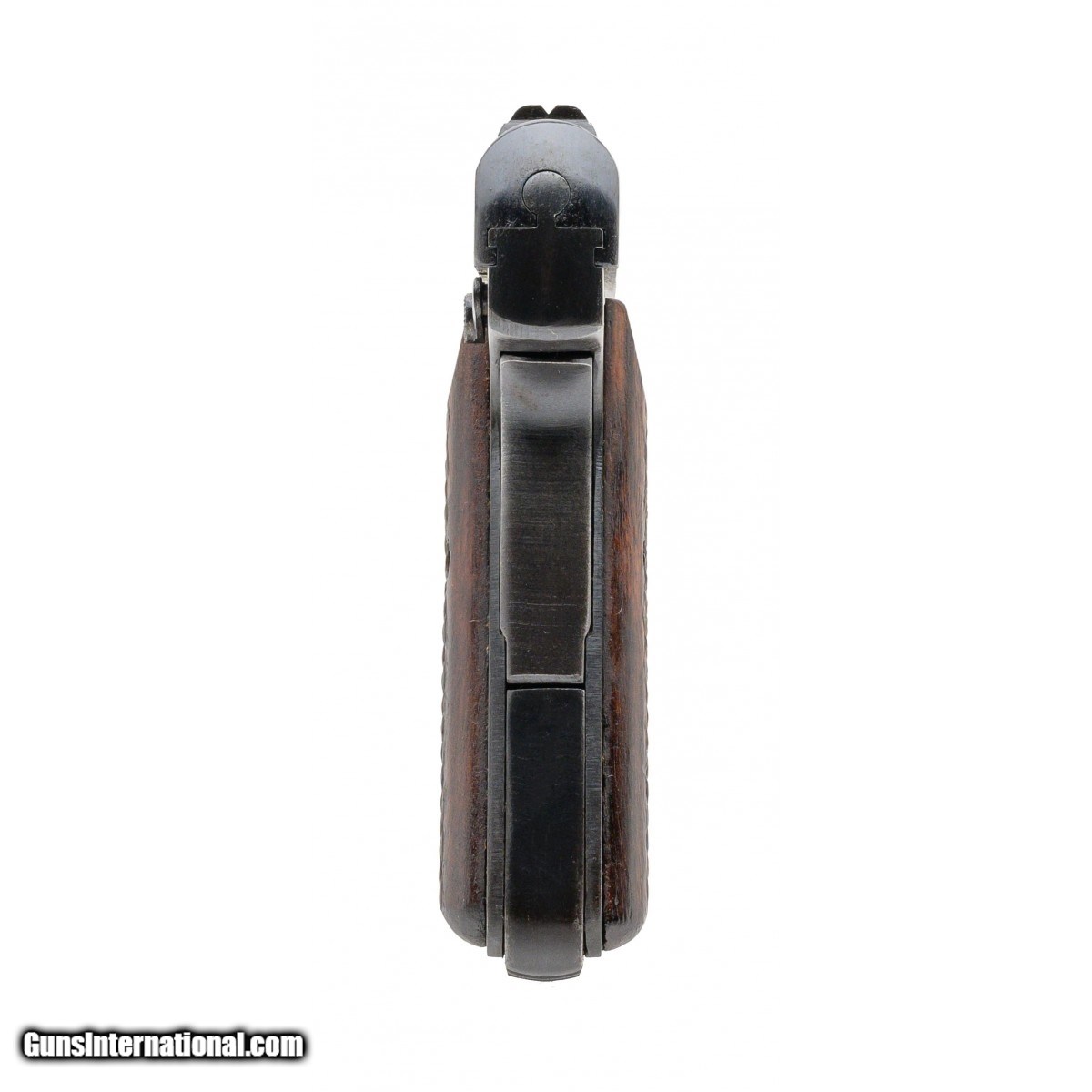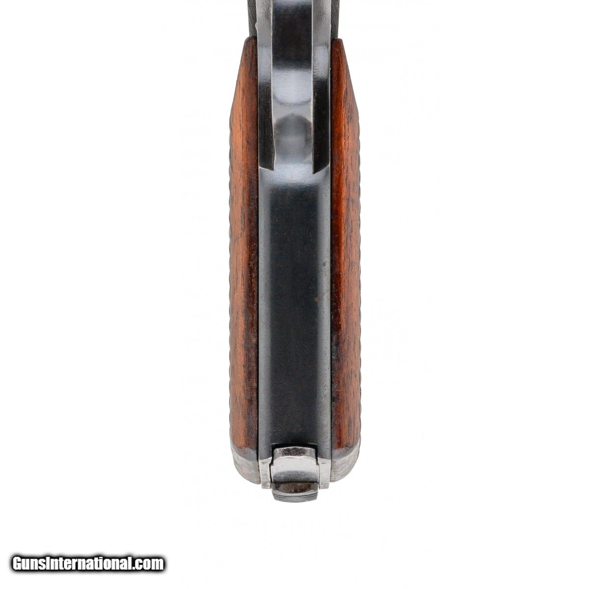 Description: " SN: 166203. Made in early 1940's. .32 ACP with a 4.5"" barrel. Bore is excellent. WWII German military pistol made in Belgium during German occupation. Slide and frame have approximately 90% factory blue with matching serial numbers, and multiple waffenamts. ""MR"" marking present on trigger guard. Original checkered wood grips are in excellent condition. Overall condition is very good. Consignment. SOLD |