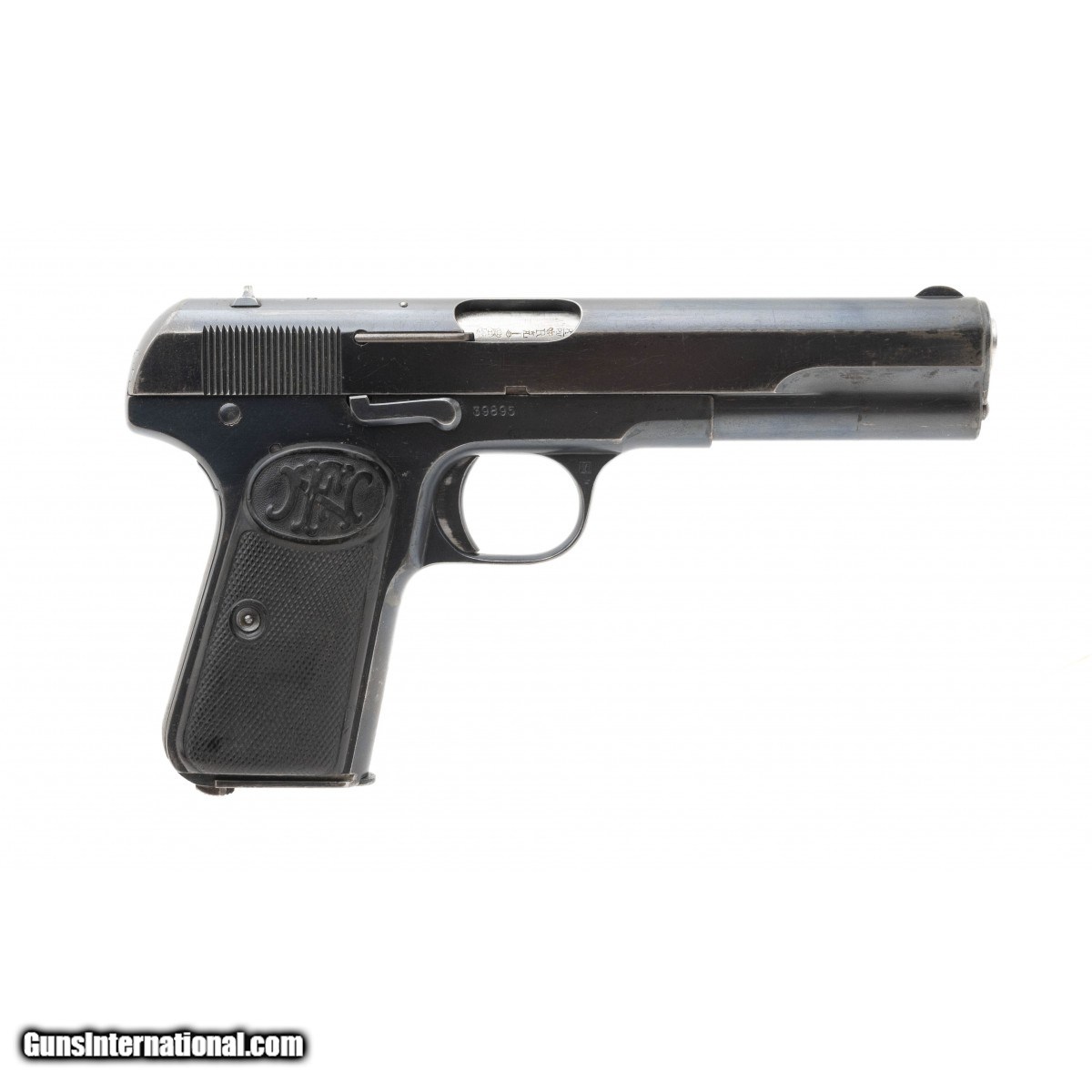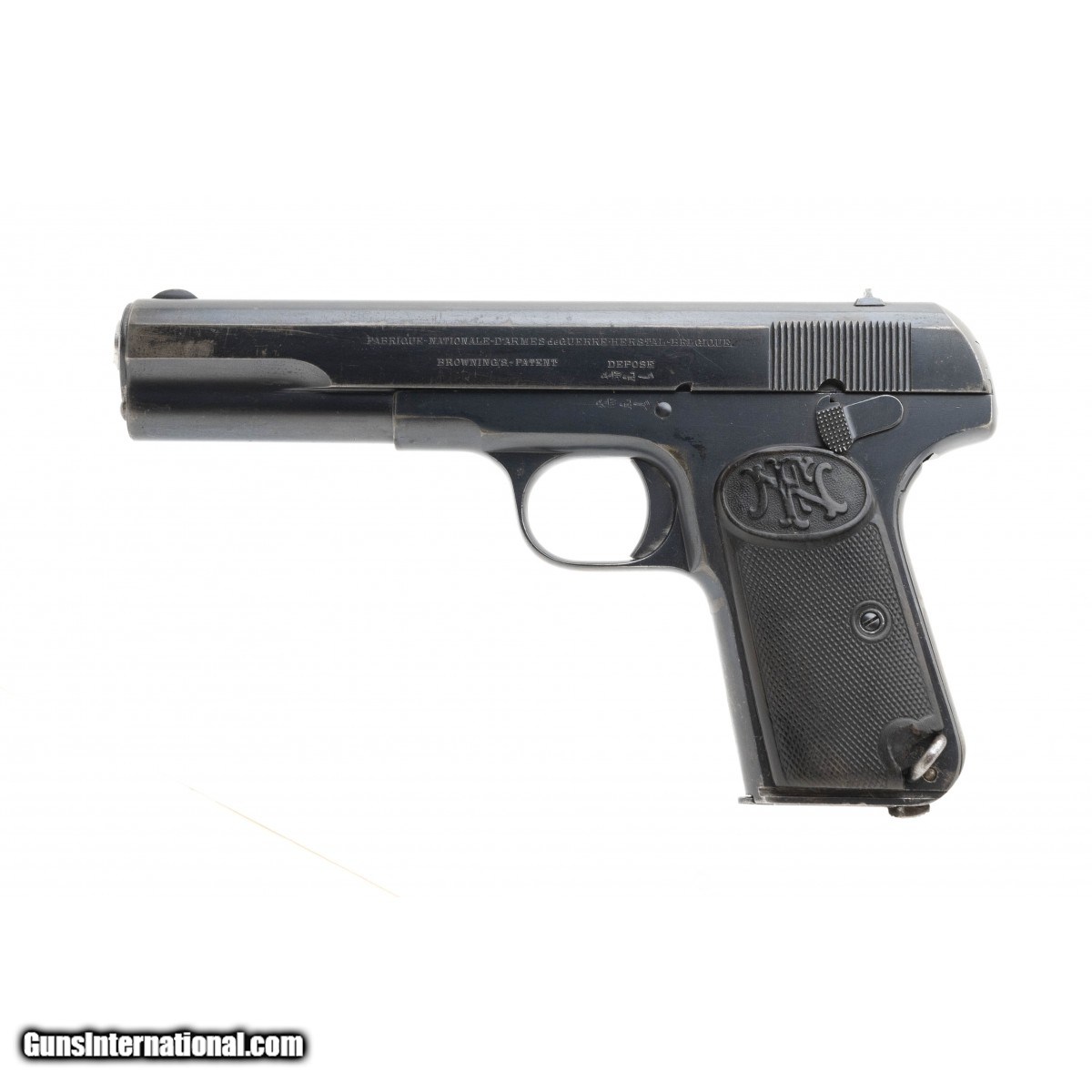 Description: " The 9mm Browning Long (9X20) FN Browning Model 1903 was manufactured from 1903 to 1939. In addition, the Swedish and Spanish made copies. The 5"" barrel has an excellent bore with bright, strong rifling. The gun has approx. 92% blue with wear on the grip straps. The left side of the slide is marked FABRIQUE - NATIONALE - D'ARMES de GUERRE - HERSTAL - BELGIQUE. over BROWNING'S PATEENT DEPOSE. There are proof and inspection marks on the barrel, slide, and frame. The rear of the frame is stamped SOM. The checkered hard rubber grips with the FN logo are fine with light wear. The action functions correctly. These fine automatic pistols were sold to Sweden, Russia, the Ottoman Empire, England, Holland, Estonia, El Salvador, and Paraguay for their military forces. It's a must for any military pistol collection. SOLD |