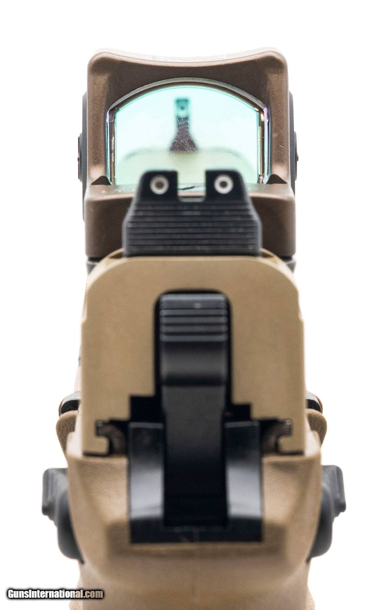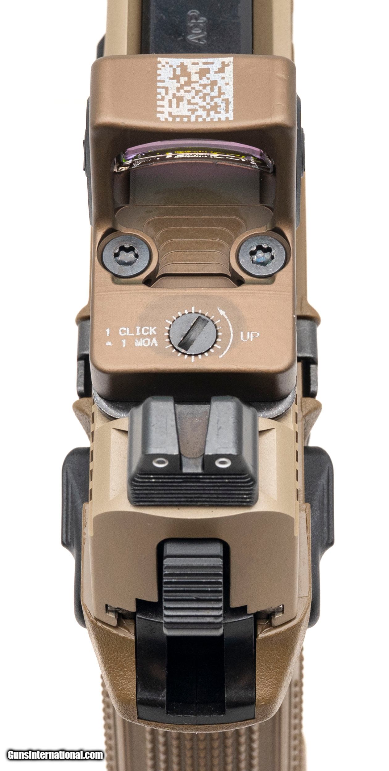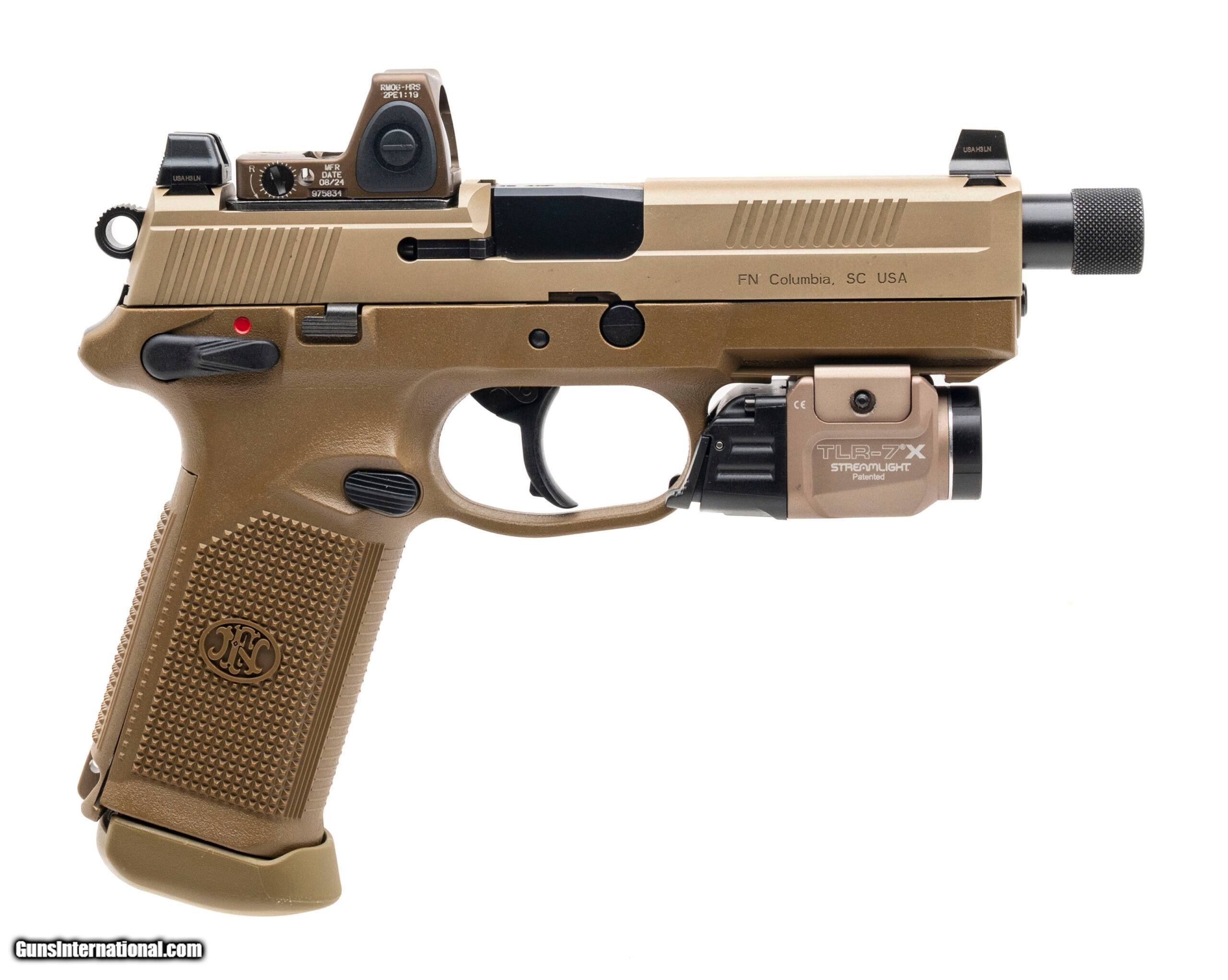 Description: "SN: FX3U210187. Modern production, .45 ACP with a 5.3"" threaded barrel. Bore is bright with strong rifling. Full size double action pistol with a Trijicon RMR red dot optic co-witnessed w/suppressor height night sights, Streamlight TLR-7X flashlight, ambidextrous controls, and an accessory rail. Overall condition is excellent. Comes with carry bag and four extra magazines. SOLD |