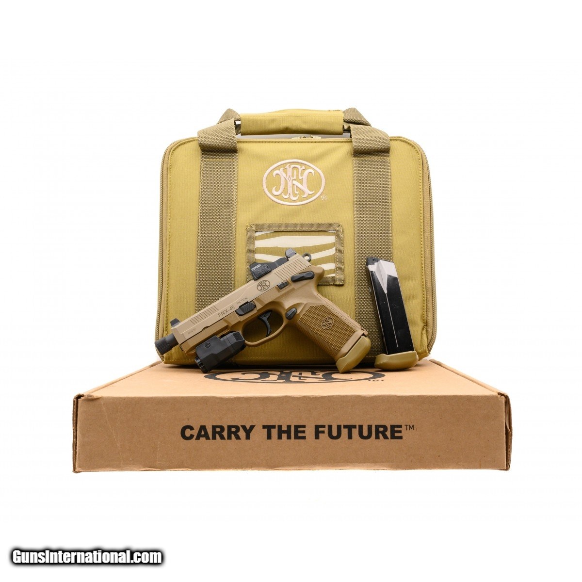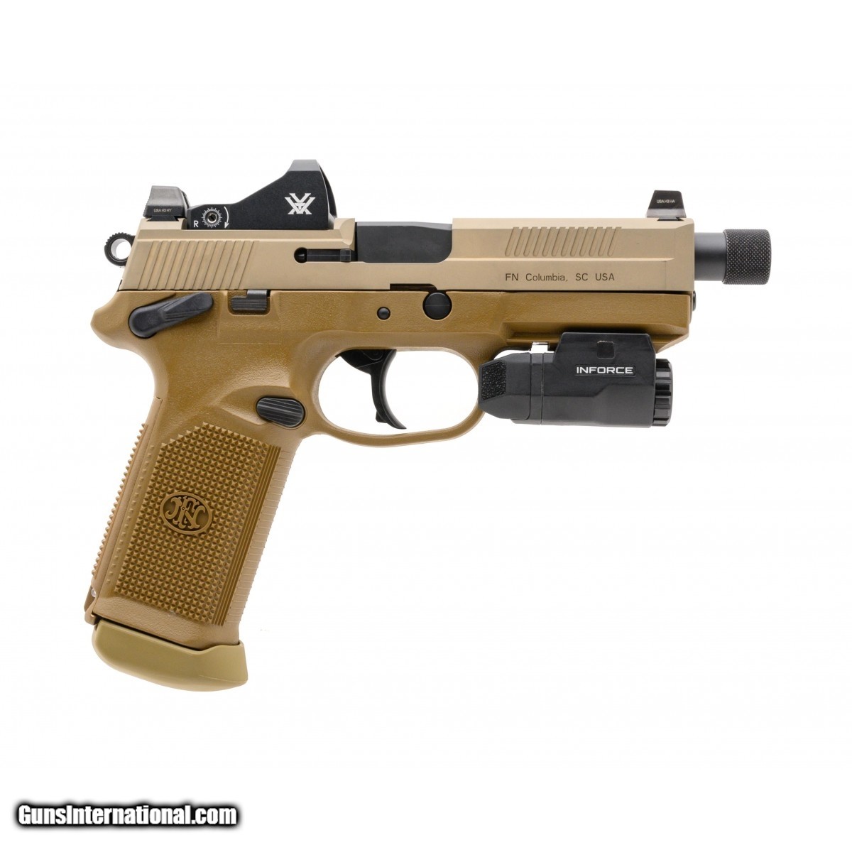 Description: " SN: FX3U186626. Modern production. .45 ACP with a 5.25"" threaded barrel. Bore is very good. Full size polymer frame pistol. FDE finish is in excellent condition. Pistol comes with a Vortex Viper red dot, Inforce light, box, and range bag with an extra magazine. Overall excellent condition. SOLD |