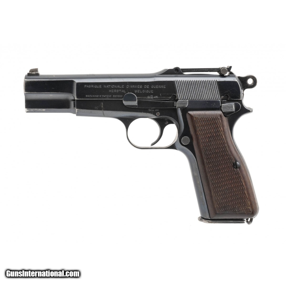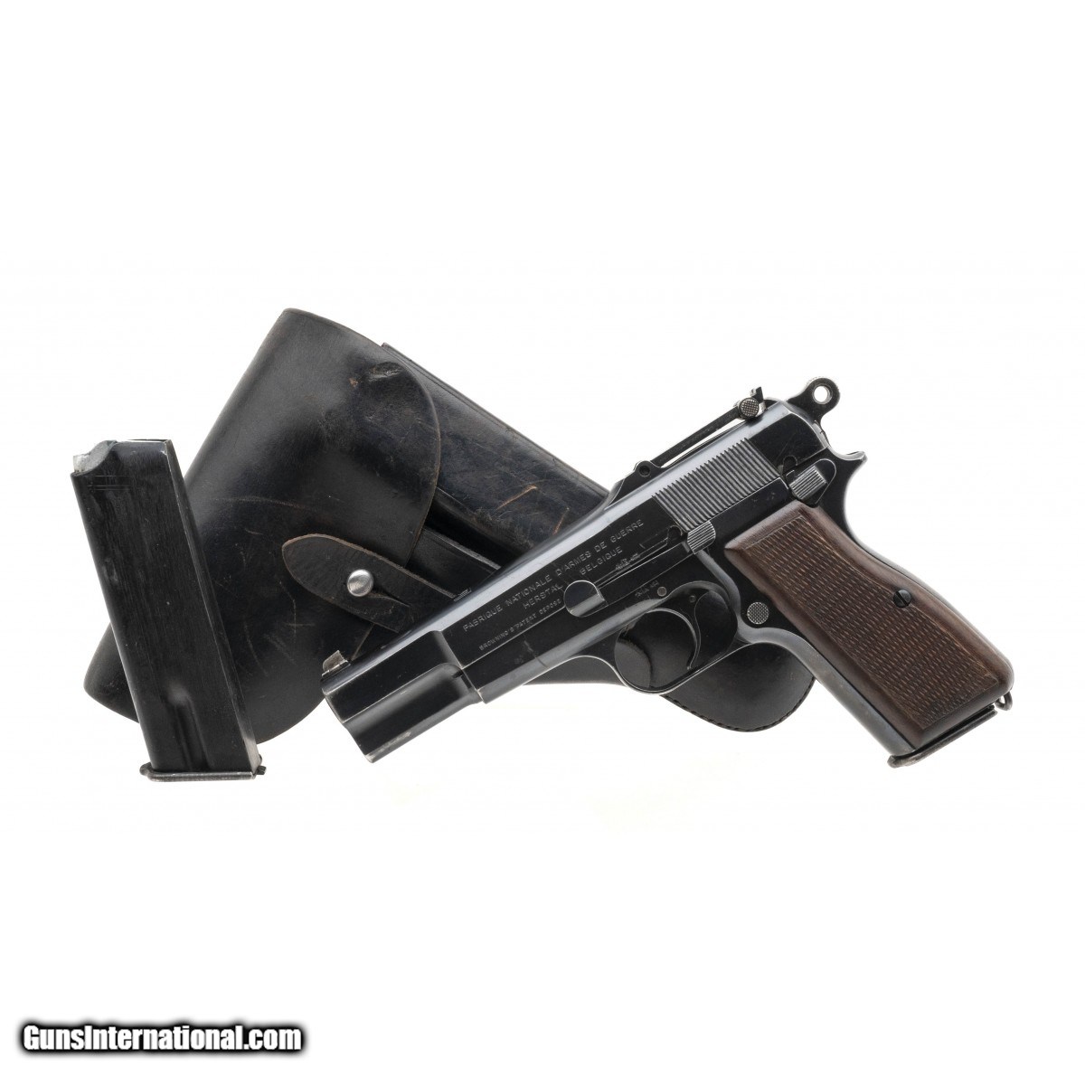 SN: 1380. Made in 1935-1936. 9mm with a 4.7"" barrel. Bore is bright with strong rifling. Lithuanian contract High Power made by FN, only 5000-7000 of these pistols were produced. This high power is slotted and grooved and has tangent sights despite Lithuania never ordering shoulder stocks with these guns. Finish is in good condition with expected holster wear on the slide with typical handling wear noted on the grip frame. Pistol retains approximately 90% of factory finish. Original wood grips are in very good condition with modest checkering. Lithuania was occupied by Germany June 22, 1941 thus this pistol comes with German High Power holster marked ""dta"" and dated 1941 with an extra magazine. Overall this is a very good condition example of not only a rare Lithuanian marked pistol but also an example of the many guns seized and used by the German army during WWII.