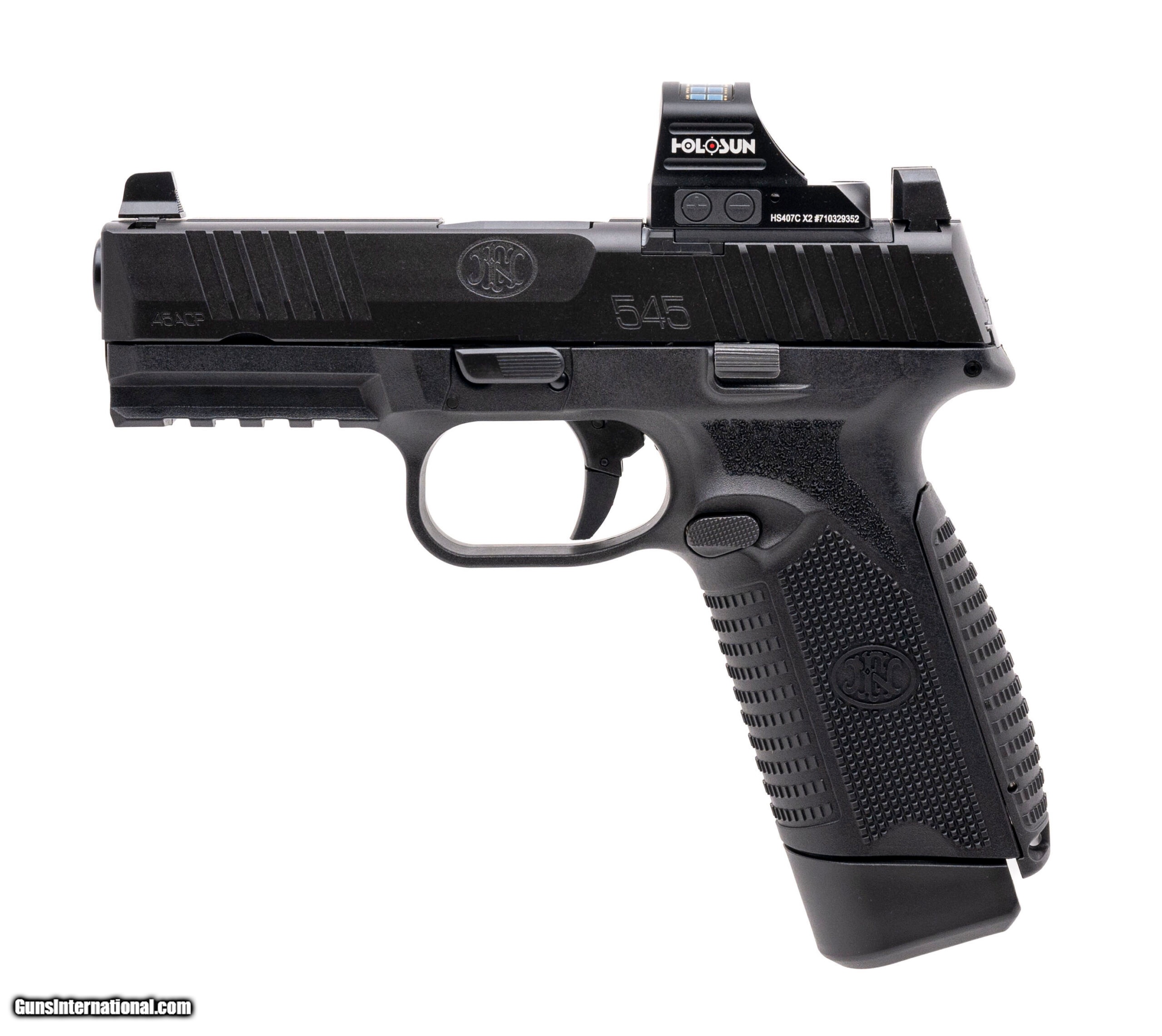 Description: "FN 545 MRD Pistol .45 ACP. Semi-Automatic Striker Fired with a 4.1"" Barrel. Matte Finish, Polymer Frame, Holosun 407C X2 Red Dot Optic Co-witnessed w/Suppressor Height Night Sights, and Ambidextrous Controls. Includes 2-15rd Magazines and an FN Carry Bag. NEW. UPC: 845737018283 (STOCK PHOTO) SOLD |