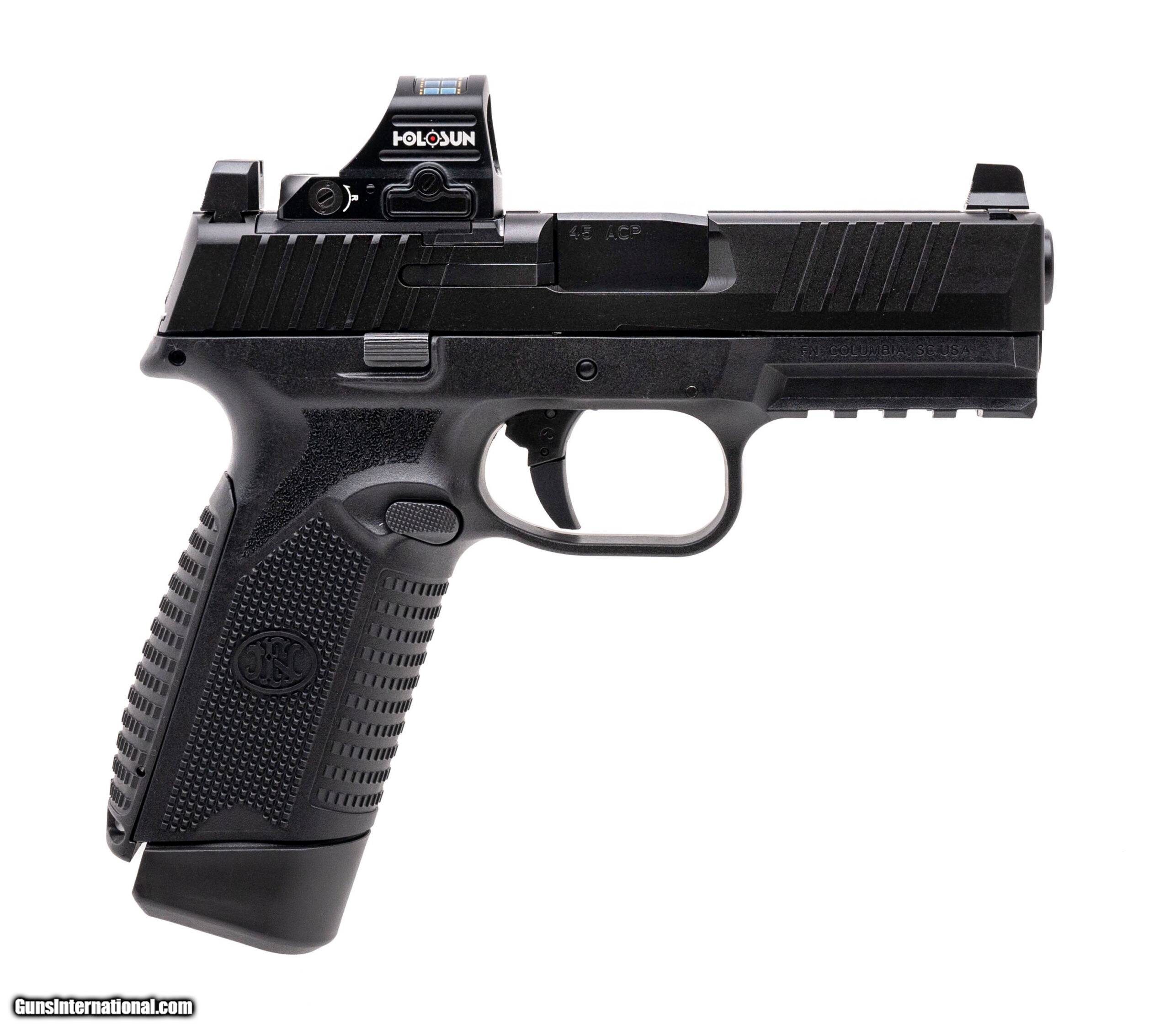 Description: "FN 545 MRD Pistol .45 ACP. Double Action Striker Fired Semi-automatic with a 4.1"" Barrel, FDE Matte Finish, Polymer Frame, and Holosun Red Dot Optic Co-witnessed w/ Suppressor Height Sights. 15 Round Magazine Capacity. NEW. UPC: 845737018283 (STOCK PHOTO) SOLD |