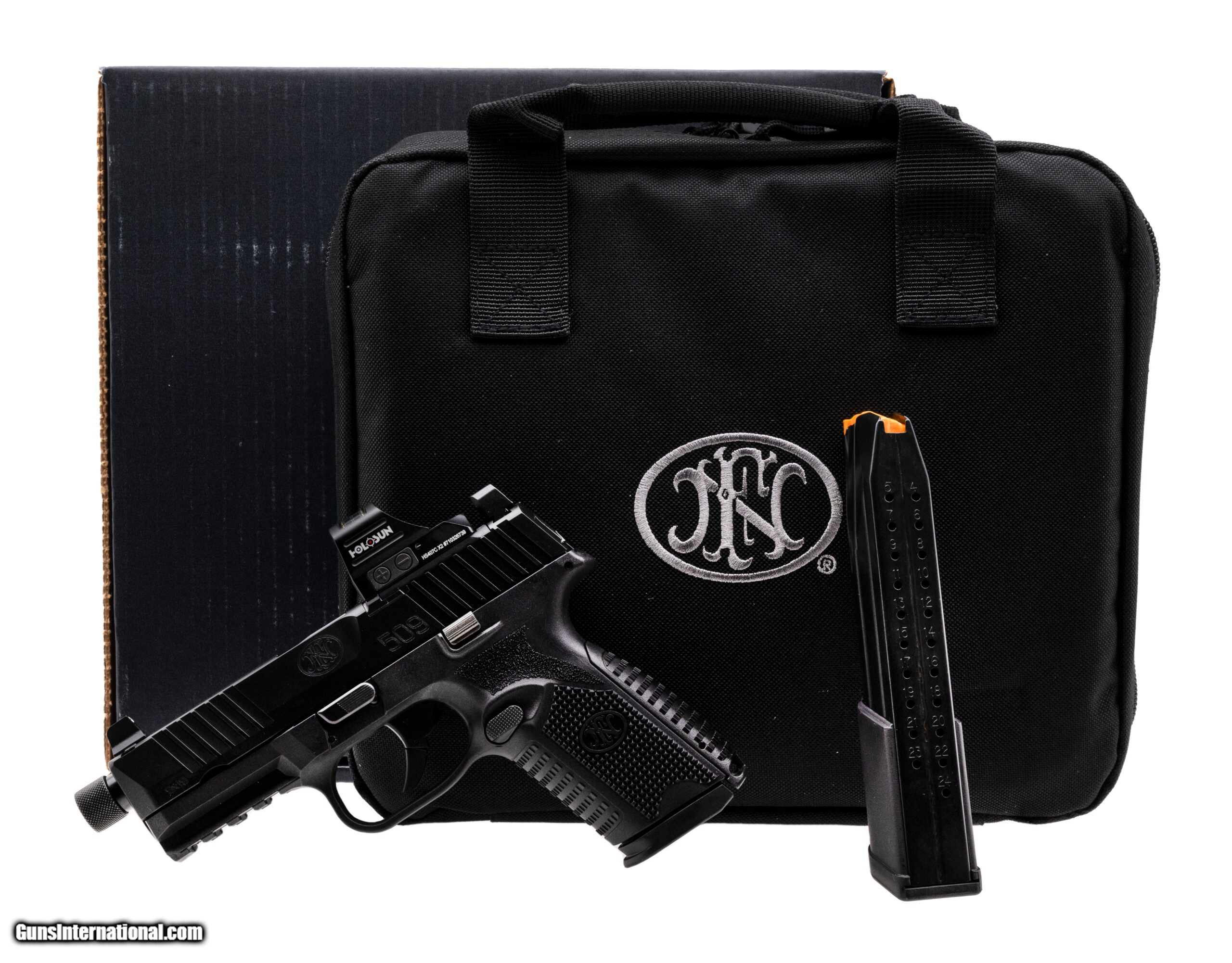 Description: "FN 509M Tactical Pistol 9mm. Semi-Automatic Striker Fire Pistol with a 4.5"" Threaded Barrel. Matte Finish, Polymer Frame, Holosun 407C X2 Red Dot Optic Co-Witnessed w/Suppressor Height Night Sights, and Ambidextrous Controls. Includes 1-15rd & 1-24rd Magazines and an FN Carry Bag. NEW. UPC: 845737018405 (STOCK PHOTO) SOLD |
