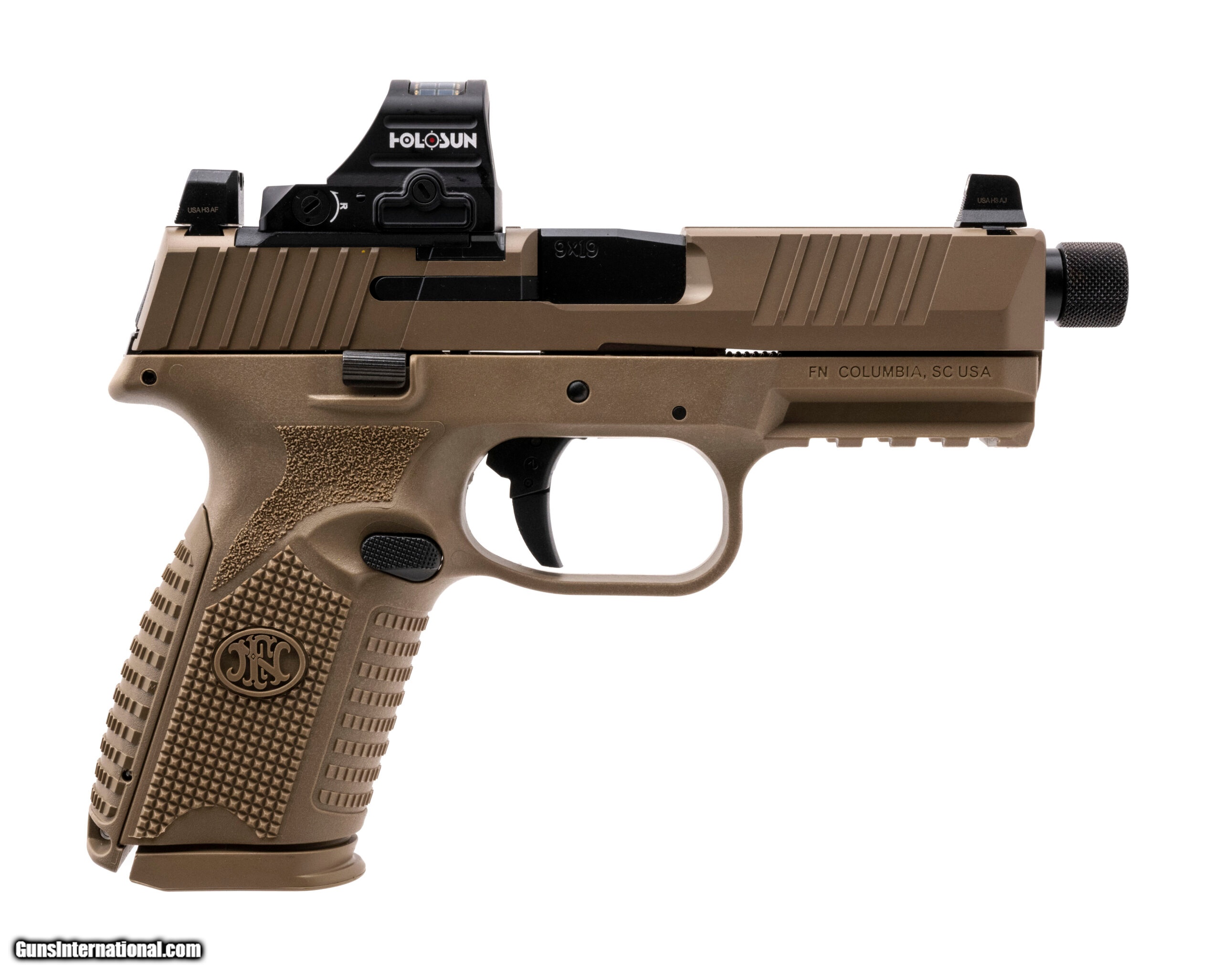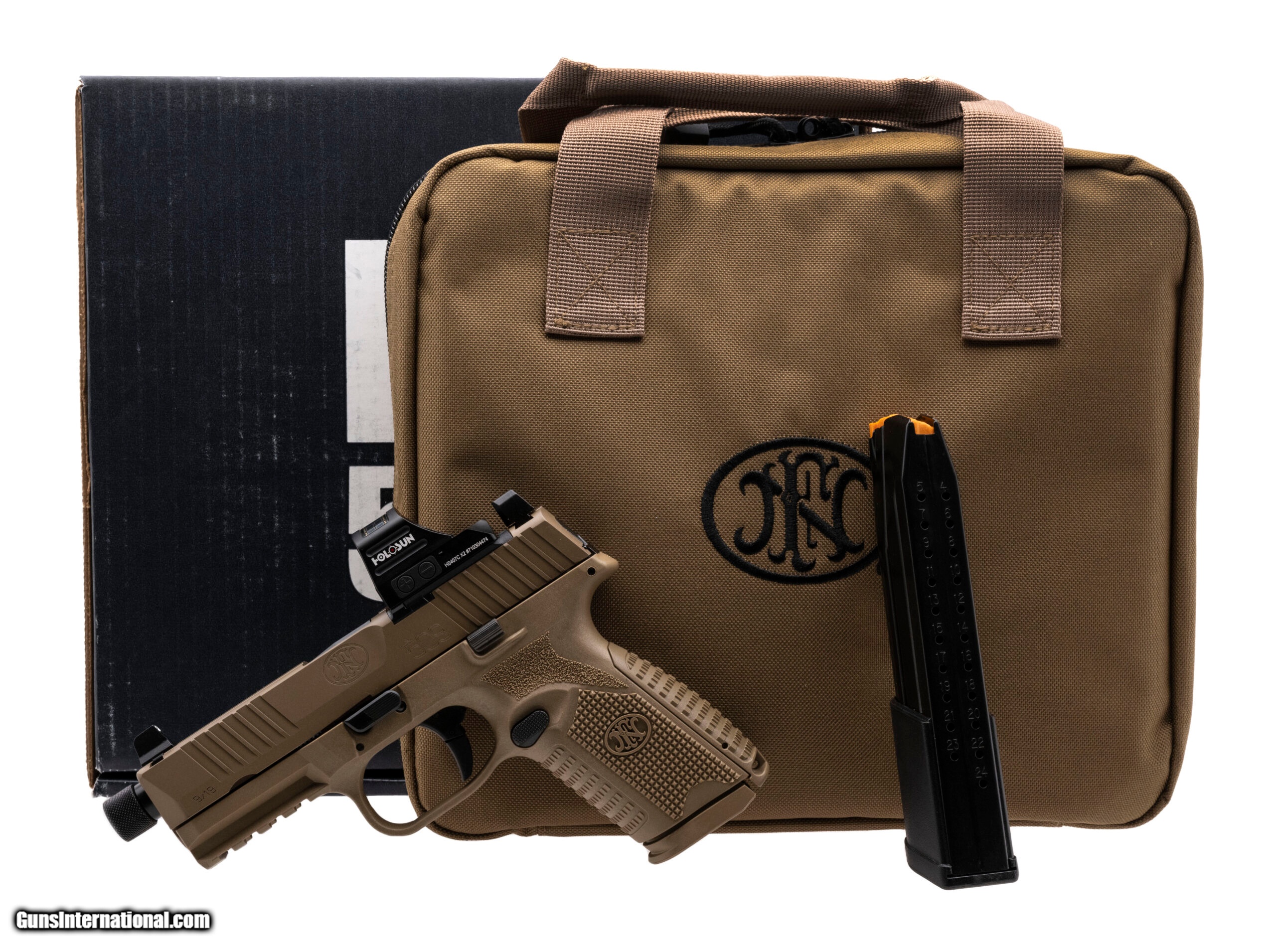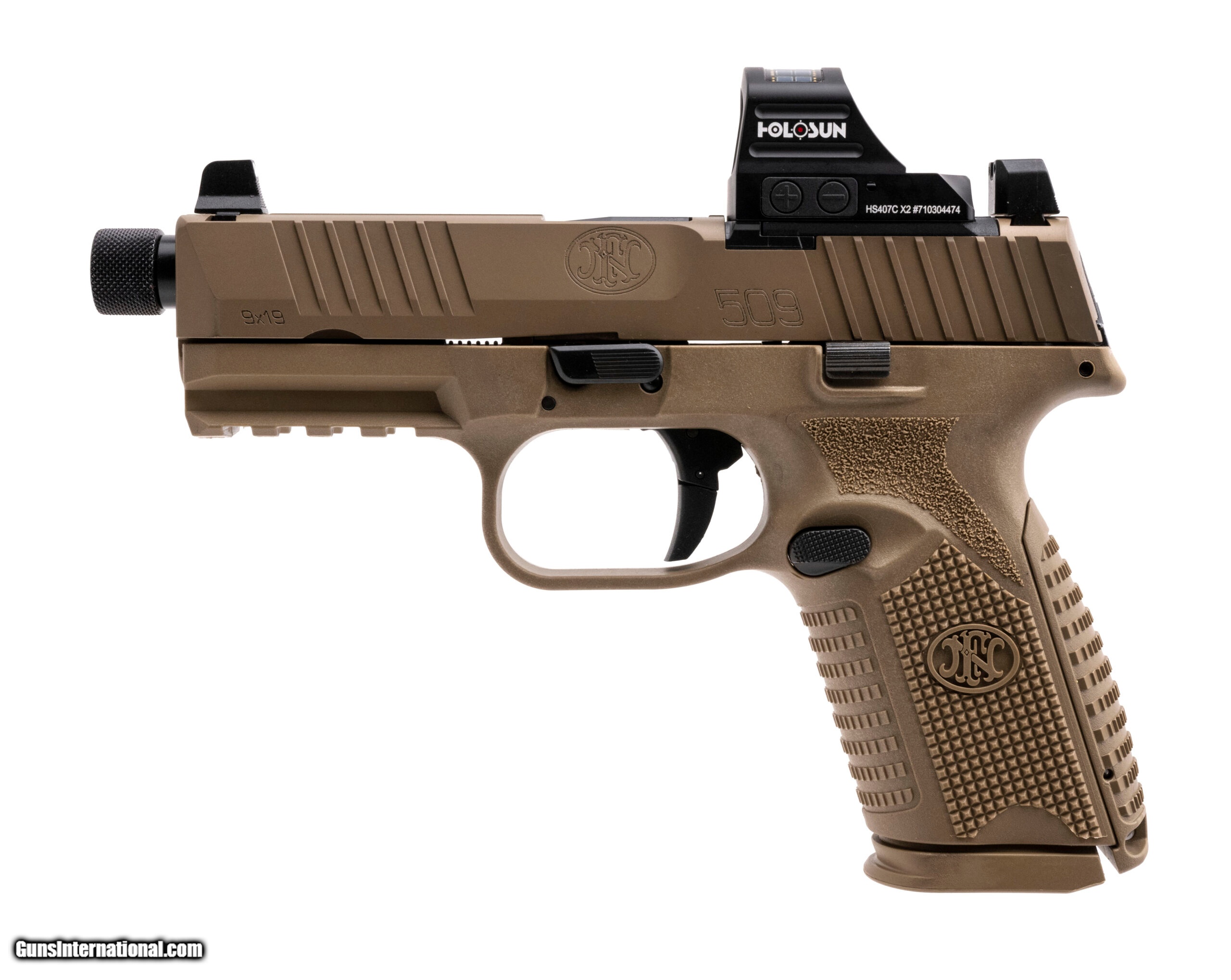 Description: "FN 509M Tactical Pistol 9mm. Semi-Automatic Striker Fire Pistol with a 4.5"" Threaded Barrel. FDE Finish, Polymer Frame, Holosun 407C X2 Red Dot Optic Co-Witnessed w/Suppressor Height Night Sights, and Ambidextrous Controls. Includes 1-15rd & 1-24rd Magazines and an FN Carry Bag. NEW. UPC: 845737018429 (STOCK PHOTO) SOLD |