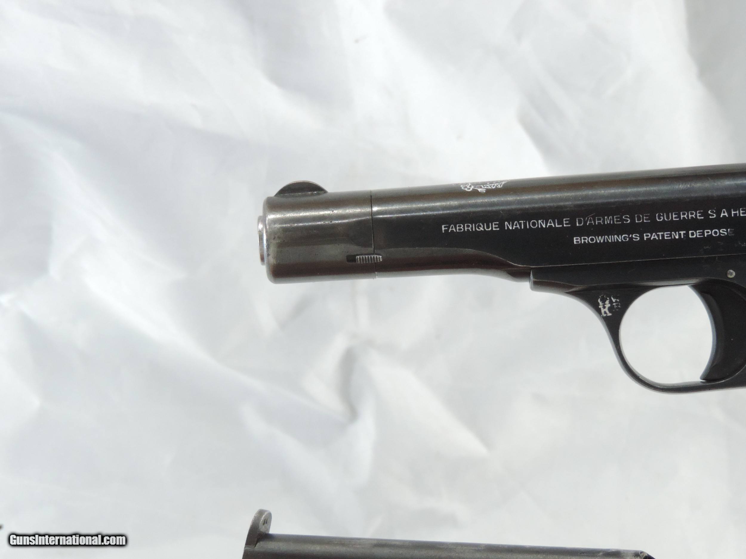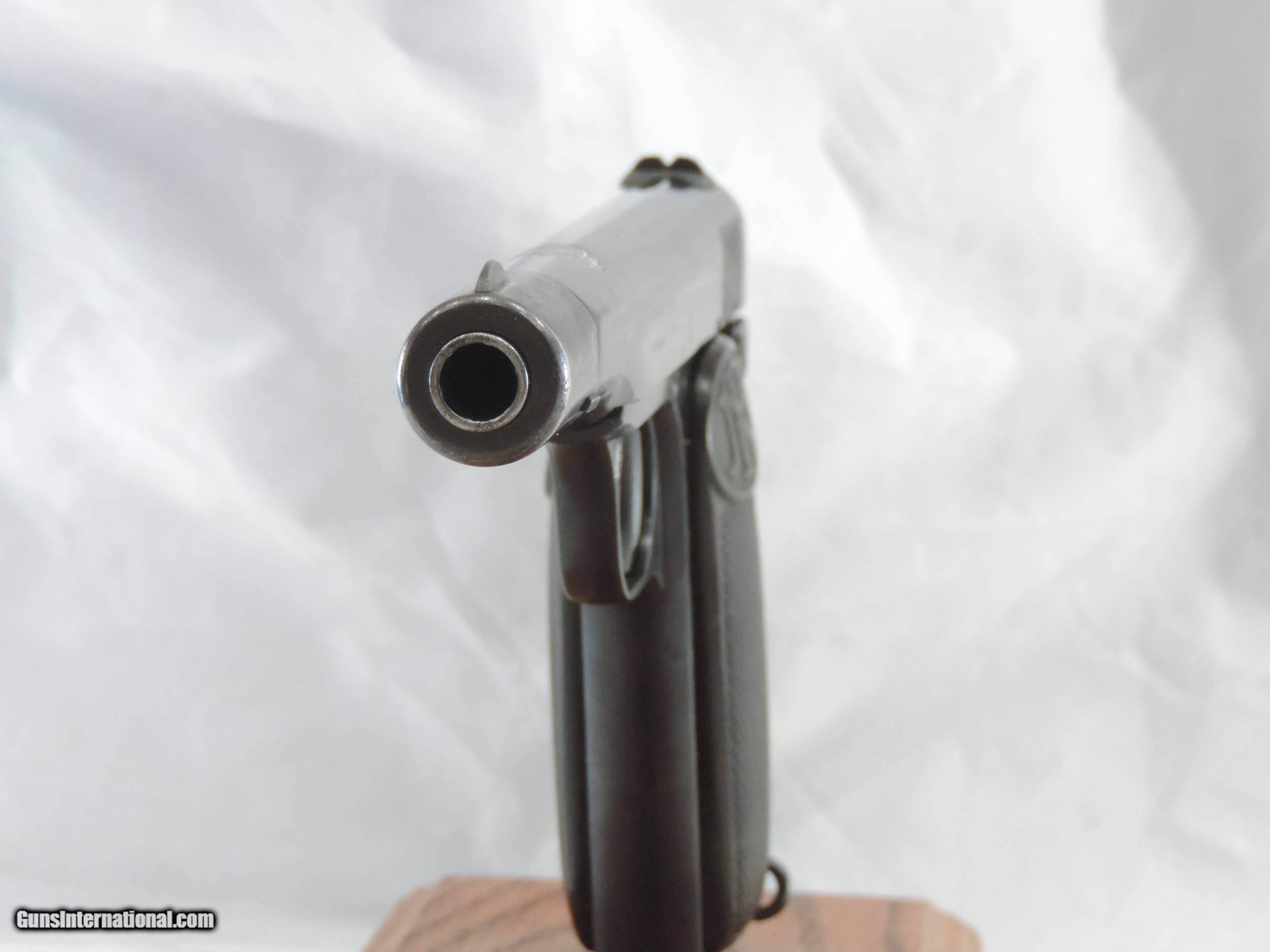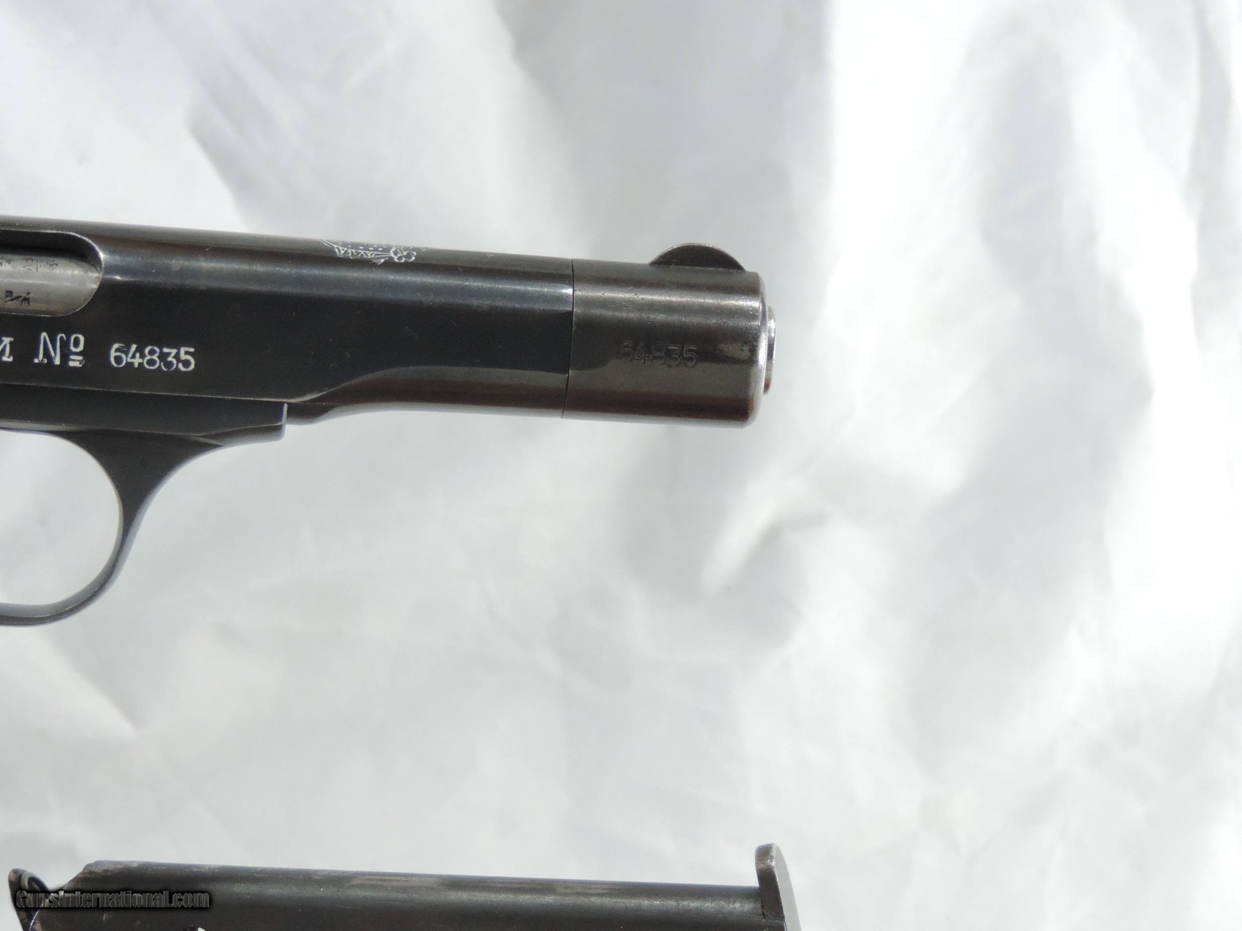 Description: INV. 10031 AWESOME YUGOSLAV BROWNING 1922, CAL .380, SER 64836. IN THE MID 1920'S YUGOSLAVIA ORDERED 67,000 OF THEM. THIS "HOLSTER QUEEN" HAS RETAINED ABOUT 96-97% OF THE ORIGINAL PRE-WAR FINISH.THE LITTLE LOSS THERE IS, IS DUE SOME SLIGHT SHARP EDGE SILVERING AND MUZZLE WEAR, PROBABLY FROM HOLSTER WEAR. THERE ARE NO RUST SPOTS, SCRATCHES OR RUB MARKS. THE GRIP STRAPS SHOWING NO SIGN OF GRAYING. ALL PARTS MATCH AND HAVE THE PROPER YUGOSLAV PROOFS**. THE YUOSLAV CREST IS ON THE TOP OF THE SLIDE, AND THE LEFT SIDE SAYS "WAR DEPARTMENT". THE ORIGINAL BLACK PLASTIC GRIPS ARE PERFECT AS IS THE GRIP SCREW. THE SLIDE RAILS, BOLT FACE AND FEED RAMP SHOW LITTLE IF ANY USE. THE BORE IS AS PRISTINE AS THE REST OF THE GUN, MIRROR BRIGHT WITH RAZOR SHARP RIFLING, AND POSSIBLY A WHISP OF FROST. IT COMES WITH ONE ORIGINAL9 ROUND MAGAZINE. AND THE ORIGINAL HOLSTER IN VERY NICE CONDITION. THIS "HOLSTER QUEEN" WOULD SATISFY EVEN THE MOST CRITICAL COLLECTOR AND WOULD ADD BEAUTY TO ANY COLLECTION. MODESTLY PRICED AT .... $995.*** **THE HARMLESS WHITE CRAYON IS TO SHOW THE MARKINGS ARE CORRECT. THEY ARE EASILY REMOVED WITH LIGHTER FLUID AND A BRUSH. WE WILL DO IT ON REQUEST. ***100% OF THE GUN'S PURCHASE PRICE IS SATISFACTION GUARANTEED. To purchase this firearm or if you want to request more information contact us at: Email ckguns[at]ymail[dot]com Phone 201-512-0002 Cell 201-575-6838 FAX 201-215-4759 We accept most major credit cards. Prices shown are Discounted 3% for Cash or Check. The buyer must be familiar with all the laws governing the purchase and the ownership of firearms in their own city and state. The Yankee Armorer, Inc is not responsible for any failure to comply with or observe these laws. The Yankee Armorer, Inc will only ship after full payment and receipt of all required documents. Shipping: Add $35.00 for handguns, $45.00 for long guns. New Jersey buyers are subject to a 7% sales tax. The Yankee Armorer, Inc offers a 3 day inspection period with full refund upon return of intact firearm and in the original condition. The Yankee Armorer, Inc offers a no interest lay away program - 25% down; 25% in 30 days; 25% in 60 days; and full payment in 90 days. Any violation of this policy is subject to restocking and forfeiture of all payments. Any variation from this policy must be agreed to in advance. Unshipped Cancelled sales are subject to a 20% restocking fee. Be advised that all firearms sold by The Yankee Armorer, Inc. or the Gun Exchange, LLC (SELLER) are sold as collector’s items. They have not been fired or tested for safety and must be examined by a license gunsmith prior to use. By purchasing any item from the (SELLER), you are agreeing to hold the (SELLER) free from any damages or lawsuits of any nature. Any item left for transfer or storage will be charged to $25.00 per month, per item from the day of its receipt. Any variation from this policy must be agreed to in advance. Store hours 10:00 am to 5:00 pm Tuesday -Saturday. It's always best to call for appointment. Store 201-512-0002, cell 201-575-6838. SOLD Curio/Relic: Yes |