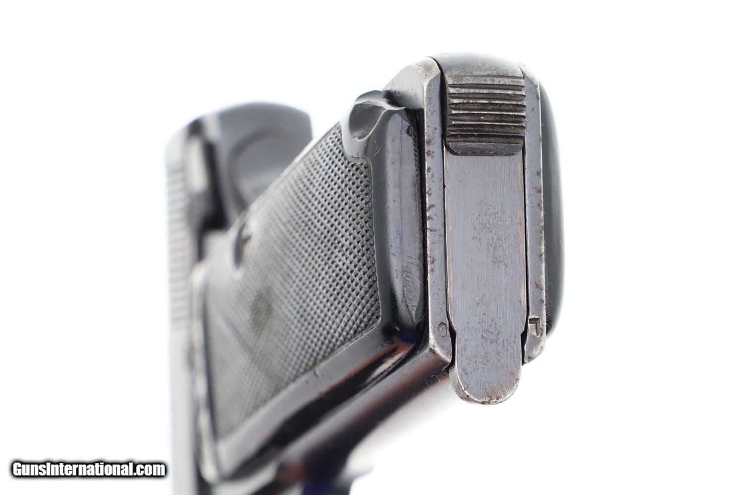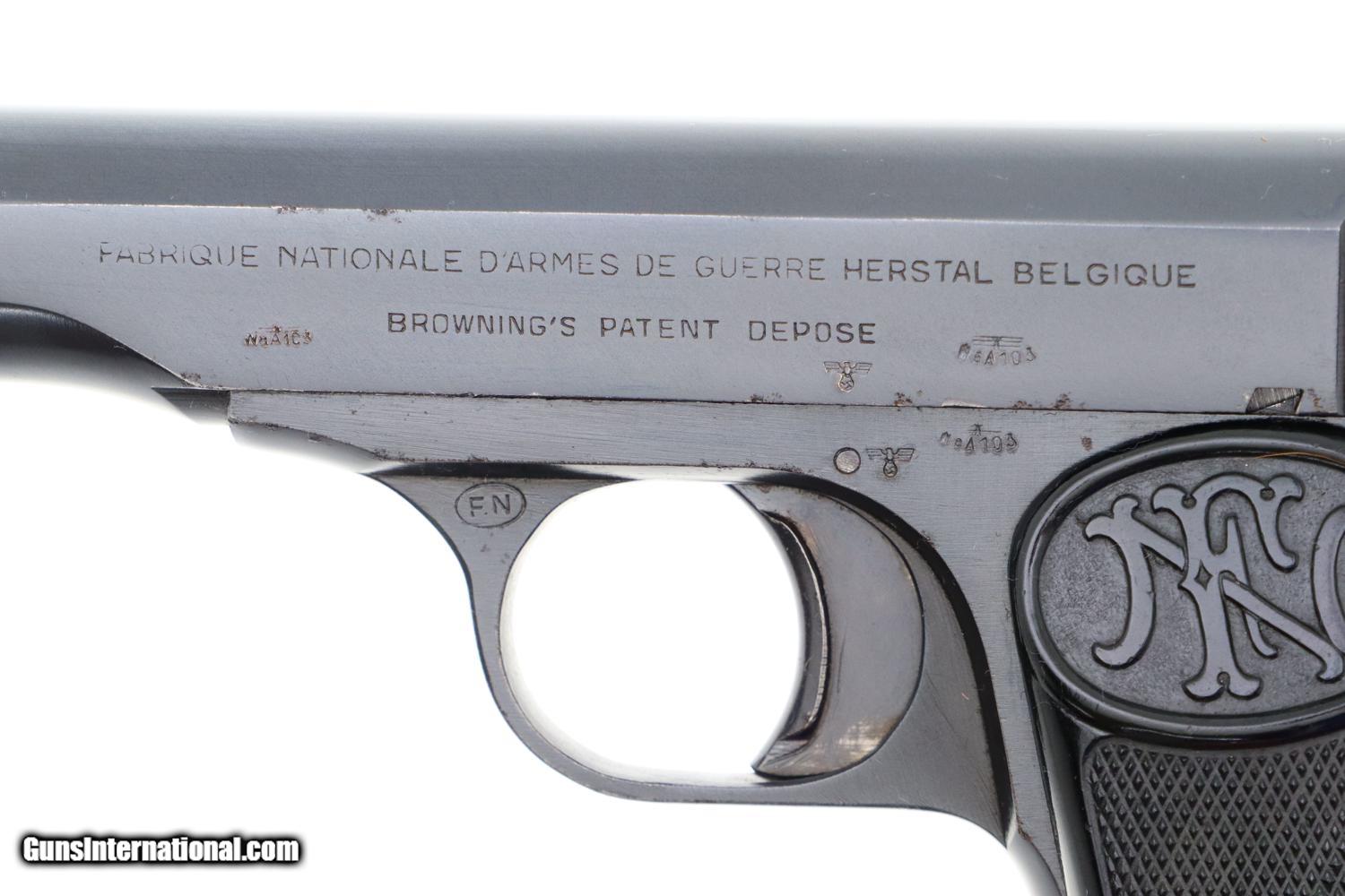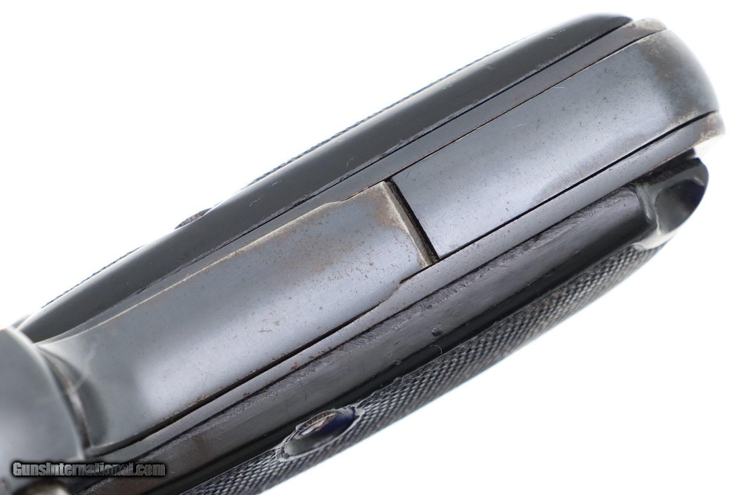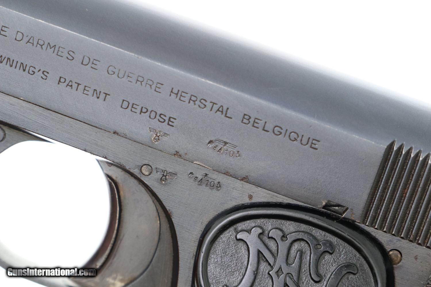 Description: Synopsis: Early FN 1922, WWII German Army Issue, Spare Mag, 35322, FB01180 Description: Scarce early production FN 1922 with rust blued finish as acquired by the German Army during WWII. Left side of slide with usual two line address referencing FN location and Browning Patent. Encircled FN logo on left trigger guard web. Full serial number on right side of frame, exposed barrel hood, and muzzle cap. Usual scattering of Nazi acceptance stamps on left side of slide, frame, and exposed barrel hood. Fitted with hard rubber FN logo grips, the left panel recessed for non-existent lanyard ring. Correct pare of FN logo 7.65mm marked magazines. Condition: VG+ original rust blue finish with muzzle wear and few areas of thinning as carefully imaged. Usual haloing around acceptance stamps. Comparable condition grips. Magazines with fading and insertional use. Mirror bore. Perfect manual mechanics. A difficult to find early rust blued FN 1922 in this condition. ~~Insured shipping fee of $55; most packages shipped using FedEx 2nd Day.~~ SOLD Curio/Relic: Yes Manufacturer: FN Serial Number: 35322 Caliber Info: 7.65mm |