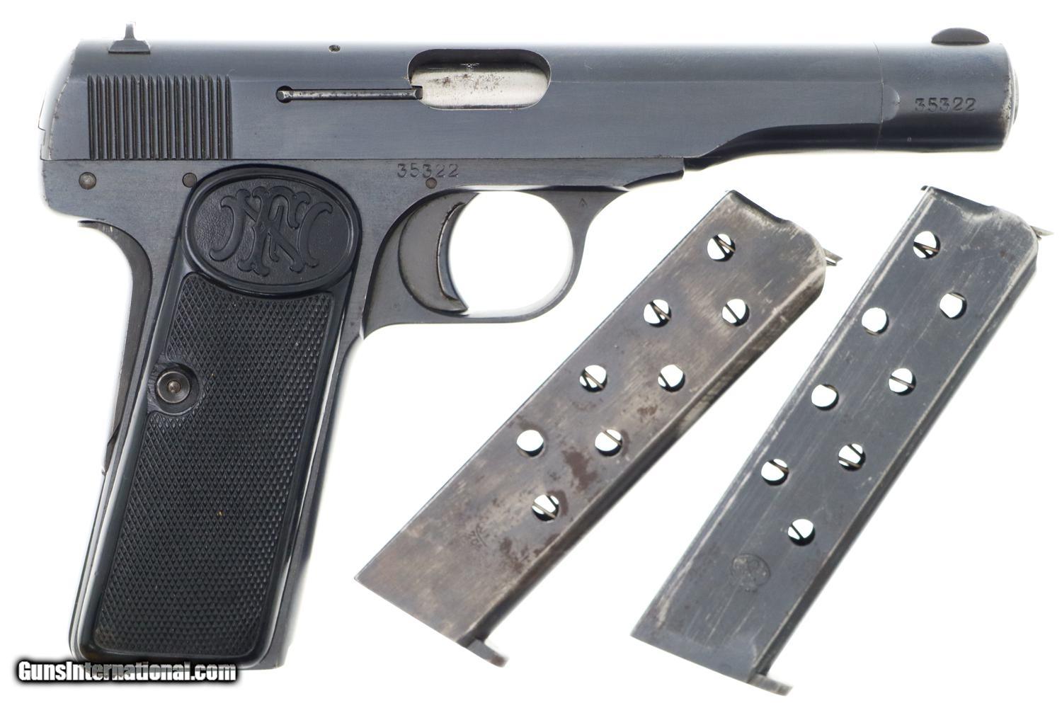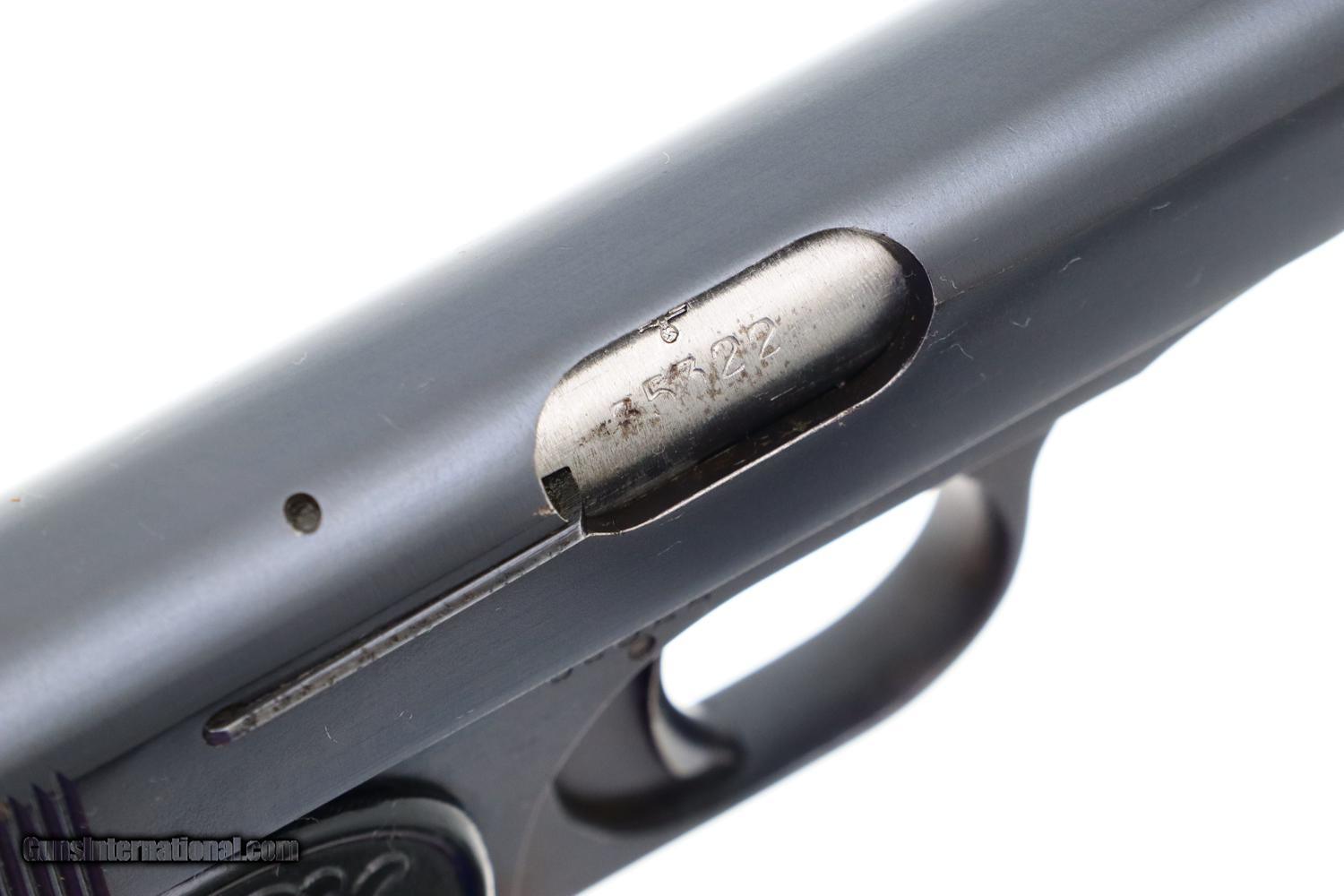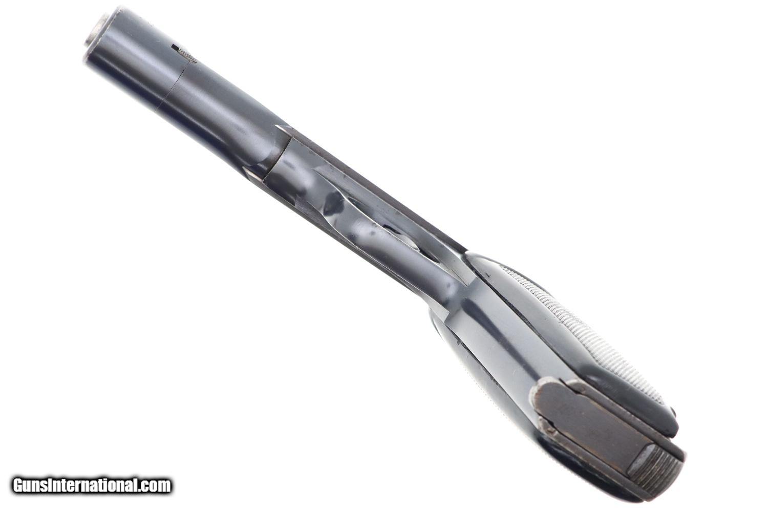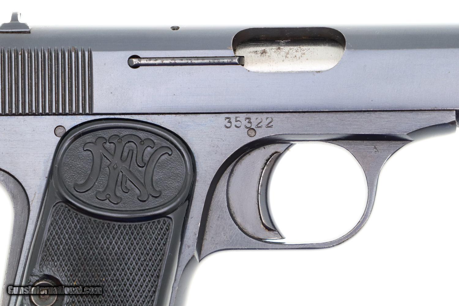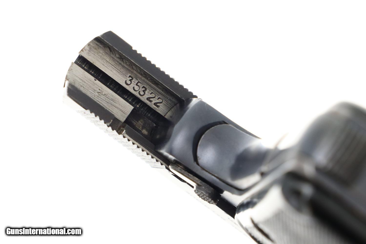 Description: Synopsis: Early FN 1922, WWII German Army Issue, Spare Mag, 35322, FB01180 Description: Scarce early production FN 1922 with rust blued finish as acquired by the German Army during WWII. Left side of slide with usual two line address referencing FN location and Browning Patent. Encircled FN logo on left trigger guard web. Full serial number on right side of frame, exposed barrel hood, and muzzle cap. Usual scattering of Nazi acceptance stamps on left side of slide, frame, and exposed barrel hood. Fitted with hard rubber FN logo grips, the left panel recessed for non-existent lanyard ring. Correct pare of FN logo 7.65mm marked magazines. Condition: VG+ original rust blue finish with muzzle wear and few areas of thinning as carefully imaged. Usual haloing around acceptance stamps. Comparable condition grips. Magazines with fading and insertional use. Mirror bore. Perfect manual mechanics. A difficult to find early rust blued FN 1922 in this condition. ~~Insured shipping fee of $55; most packages shipped using FedEx 2nd Day.~~ SOLD Curio/Relic: Yes Manufacturer: FN Serial Number: 35322 Caliber Info: 7.65mm |