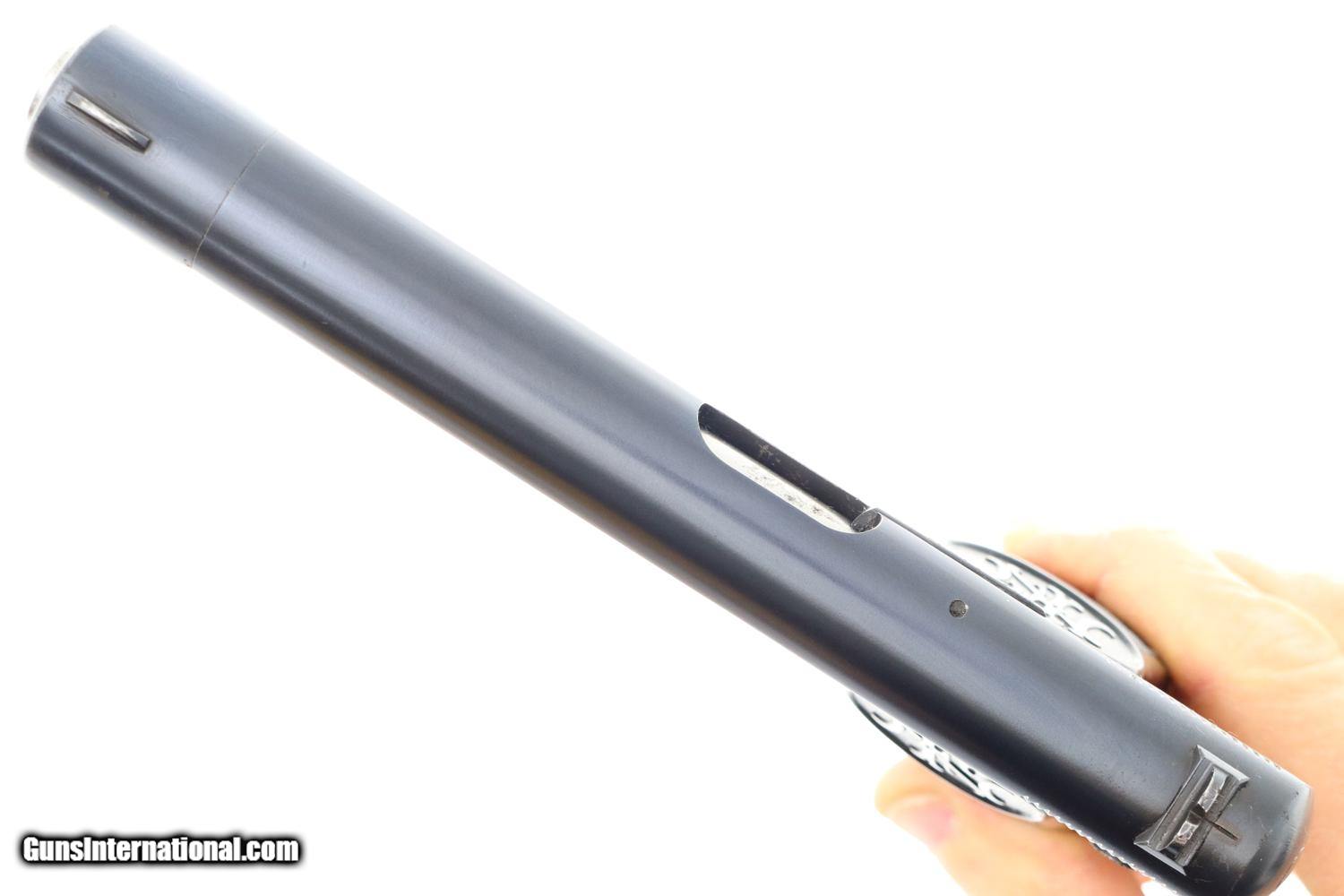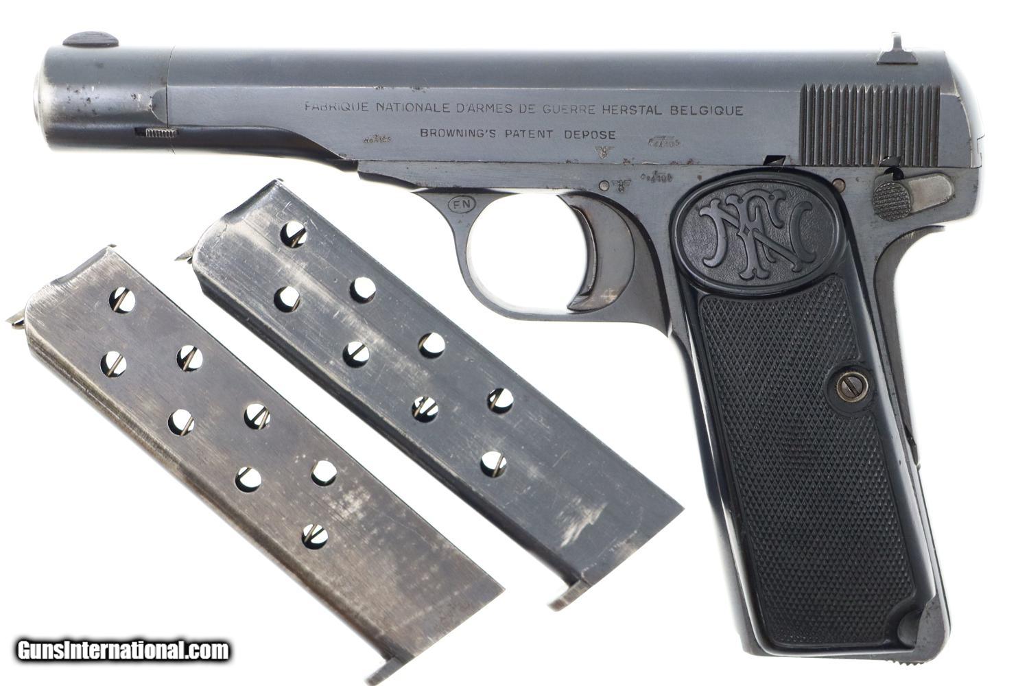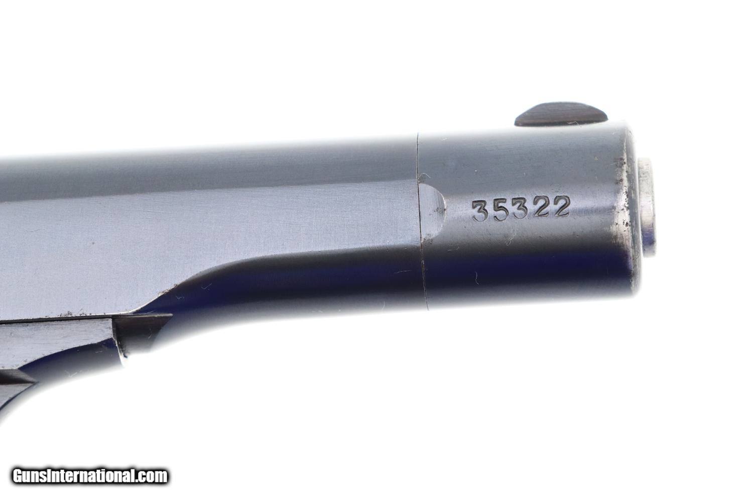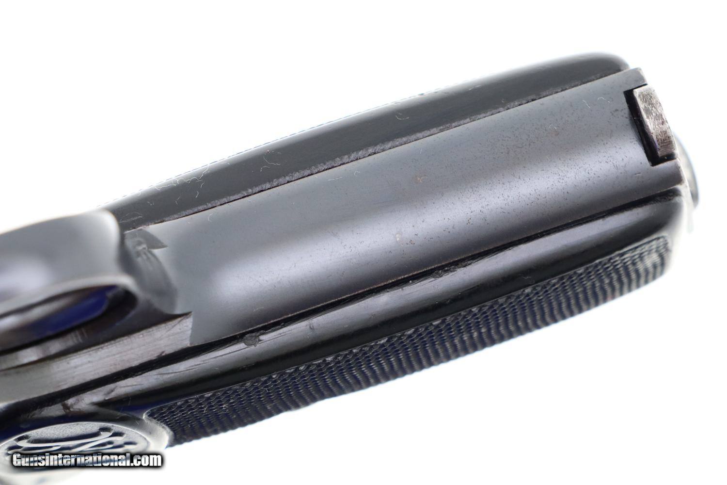 Description: Synopsis: Early FN 1922, WWII German Army Issue, Spare Mag, 35322, FB01180 Description: Scarce early production FN 1922 with rust blued finish as acquired by the German Army during WWII. Left side of slide with usual two line address referencing FN location and Browning Patent. Encircled FN logo on left trigger guard web. Full serial number on right side of frame, exposed barrel hood, and muzzle cap. Usual scattering of Nazi acceptance stamps on left side of slide, frame, and exposed barrel hood. Fitted with hard rubber FN logo grips, the left panel recessed for non-existent lanyard ring. Correct pare of FN logo 7.65mm marked magazines. Condition: VG+ original rust blue finish with muzzle wear and few areas of thinning as carefully imaged. Usual haloing around acceptance stamps. Comparable condition grips. Magazines with fading and insertional use. Mirror bore. Perfect manual mechanics. A difficult to find early rust blued FN 1922 in this condition. ~~Insured shipping fee of $55; most packages shipped using FedEx 2nd Day.~~ SOLD Curio/Relic: Yes Manufacturer: FN Serial Number: 35322 Caliber Info: 7.65mm |
