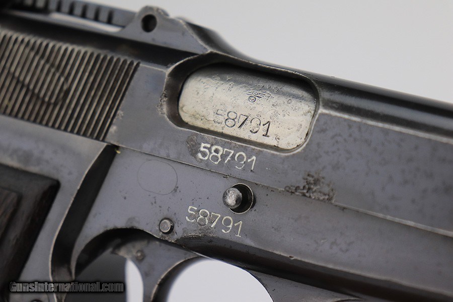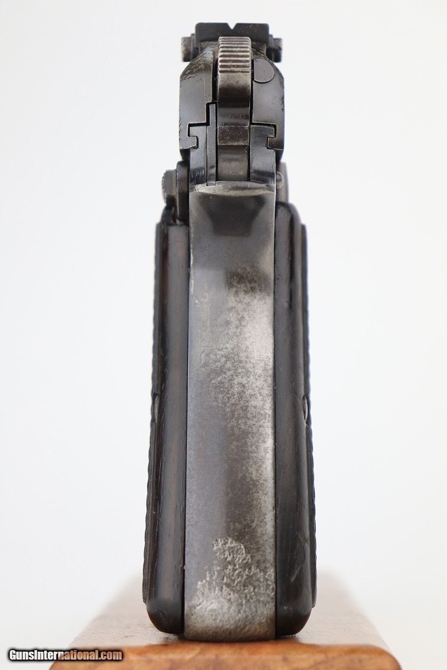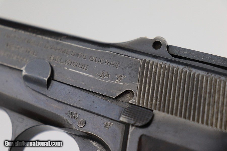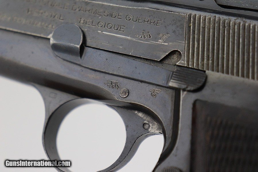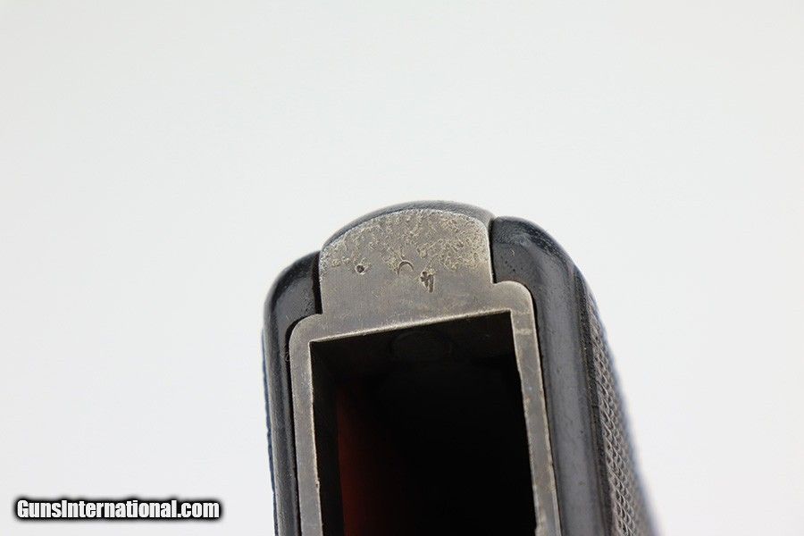 Description: This is an early FN Browning Hi Power issued to the Nazi military during WW2. It is all matching, has the proper early "Waffen 613" proofs throughout, and has an early adjustable tangent rear sight. It has retained roughly 85% of its original bluing. Most of the actual finish loss is on the grip straps. There is noticeable spotty oxidation on the grip straps as well and along the slide. Areas of pitting here and there on the slide, around the trigger guard, and one small spot at the base of the front strap. Nice period-correct wood grips. Comes with an un-marked magazine. The bore has great rifling with some light freckling in the grooves. SOLD Curio/Relic: Yes Handgun Caliber: 9x19mm Parabellum (9mm Luger, 9x19mm NATO) |