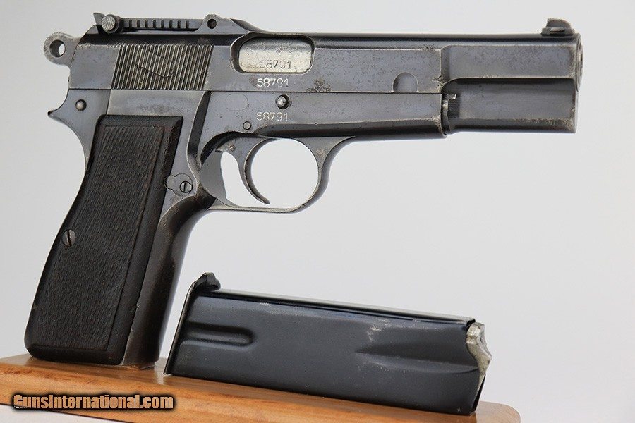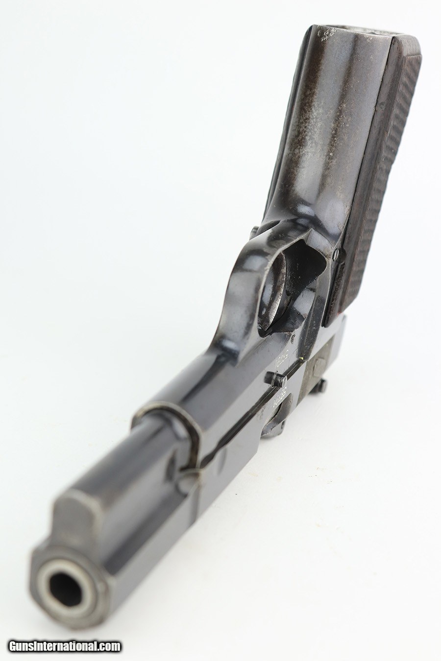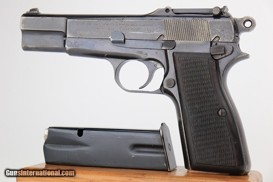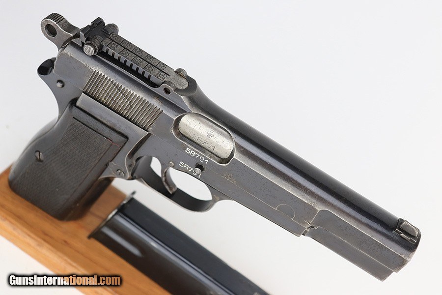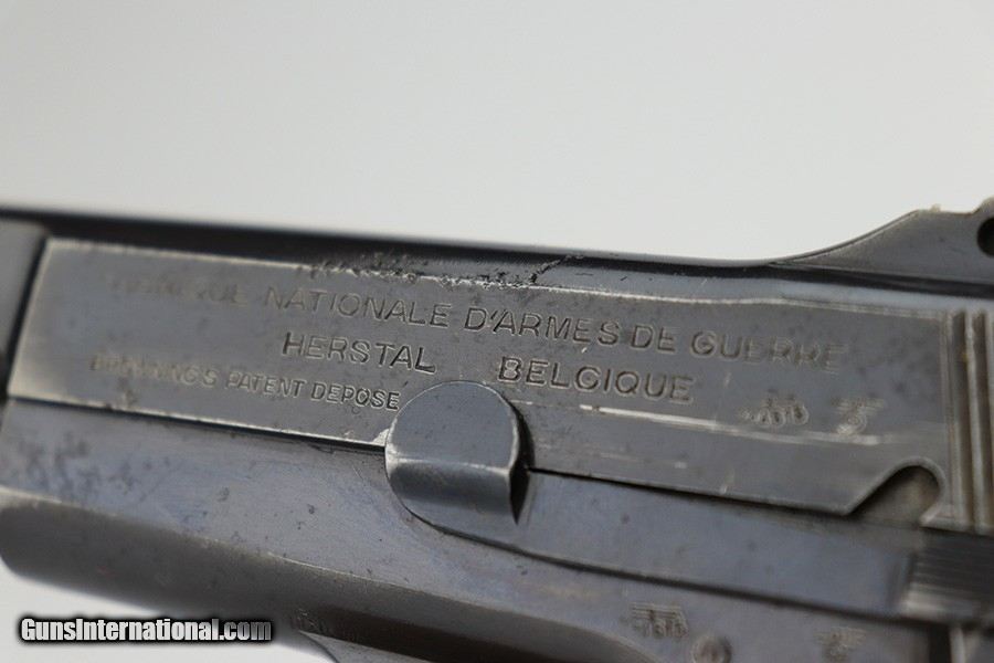Description: This is an early FN Browning Hi Power issued to the Nazi military during WW2. It is all matching, has the proper early "Waffen 613" proofs throughout, and has an early adjustable tangent rear sight. It has retained roughly 85% of its original bluing. Most of the actual finish loss is on the grip straps. There is noticeable spotty oxidation on the grip straps as well and along the slide. Areas of pitting here and there on the slide, around the trigger guard, and one small spot at the base of the front strap. Nice period-correct wood grips. Comes with an un-marked magazine. The bore has great rifling with some light freckling in the grooves. SOLD Curio/Relic: Yes Handgun Caliber: 9x19mm Parabellum (9mm Luger, 9x19mm NATO) |