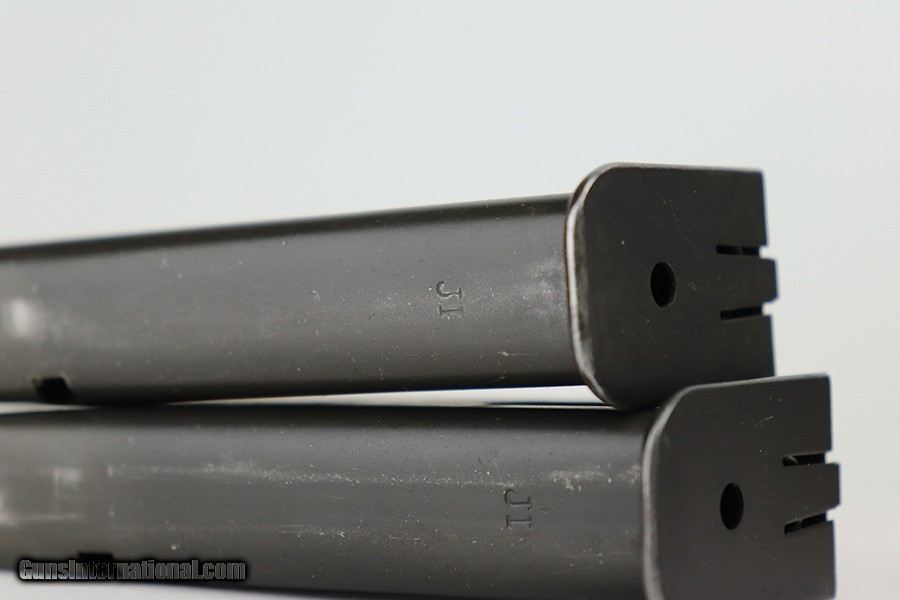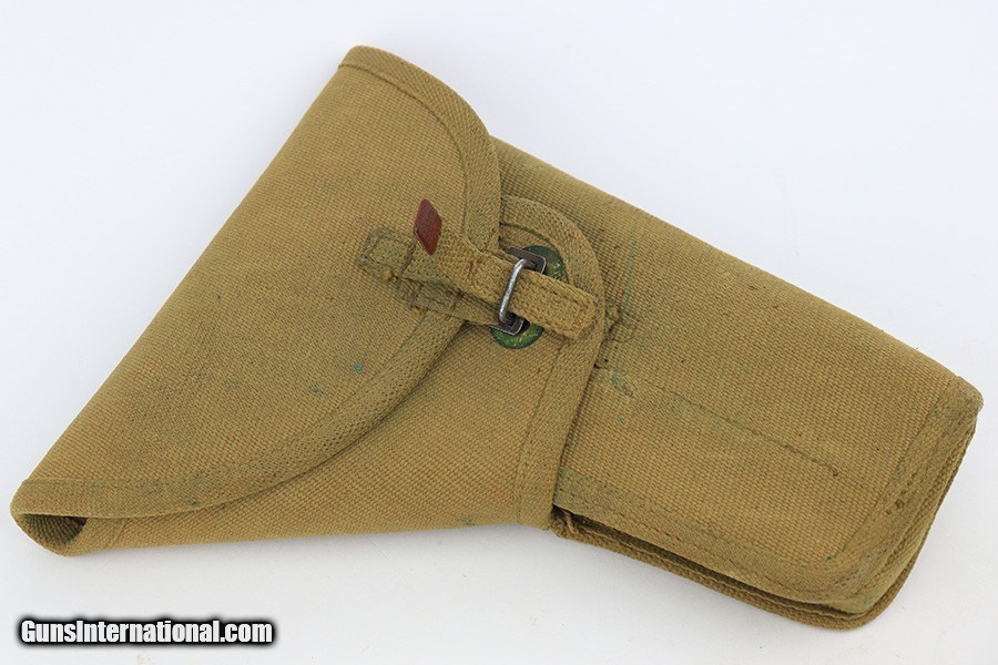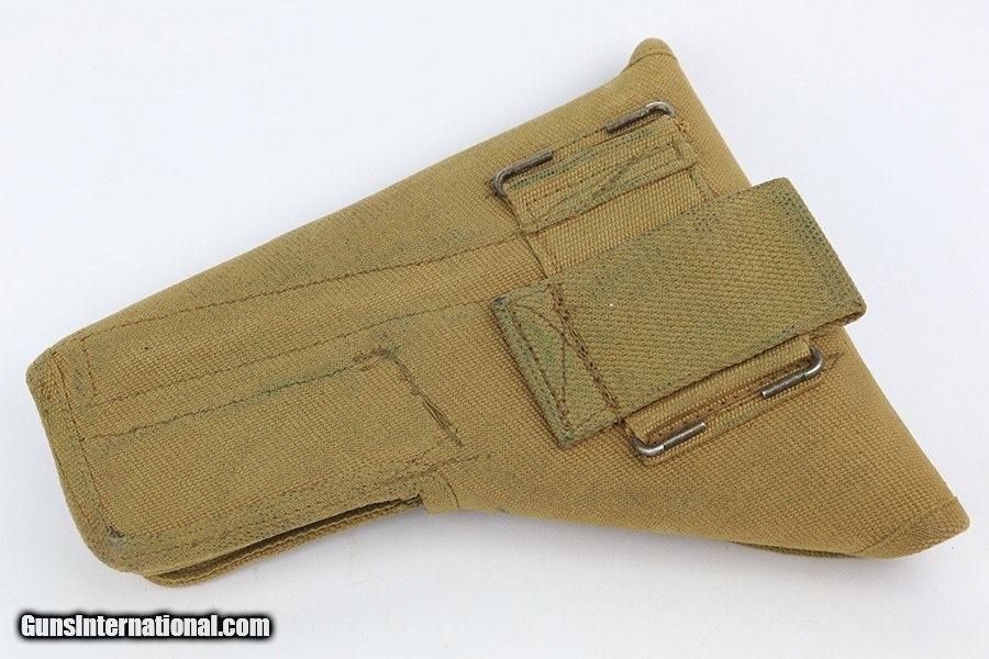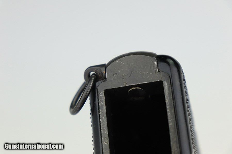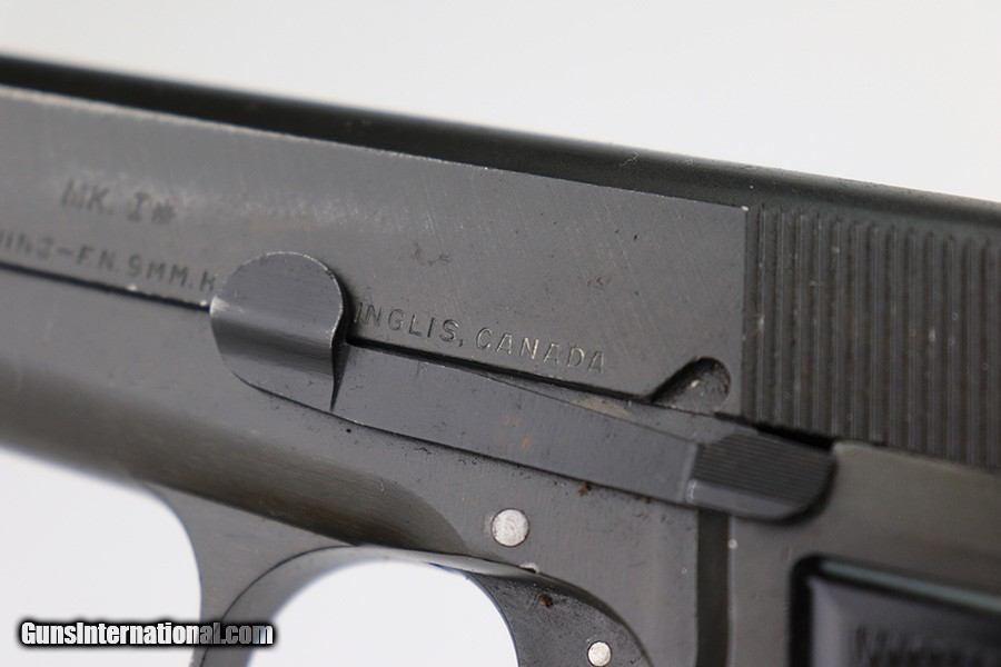 Description: This is an excellent example of an Inglis High Power issued to the Canadian military in 1944. It is all matching and has the proper proofs throughout. It comes as a complete rig with a mint 1945-dated canvas holster, two correct "JI" marked magazines, and a cleaning rod. The gun itself has retained about 97% of its finish with very little actual wear. There is just some discoloration around the serial numbers on the right side of the slide and frame. Excellent black bakelite grips. The bore has great rifling, but there is minor pin-pricking throughout. SOLD Curio/Relic: Yes Handgun Caliber: 9x19mm Parabellum (9mm Luger, 9x19mm NATO) |