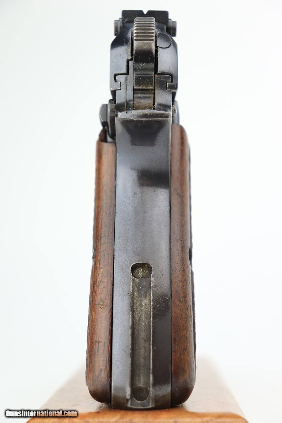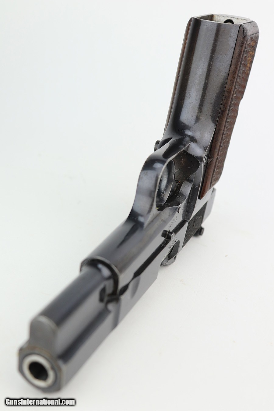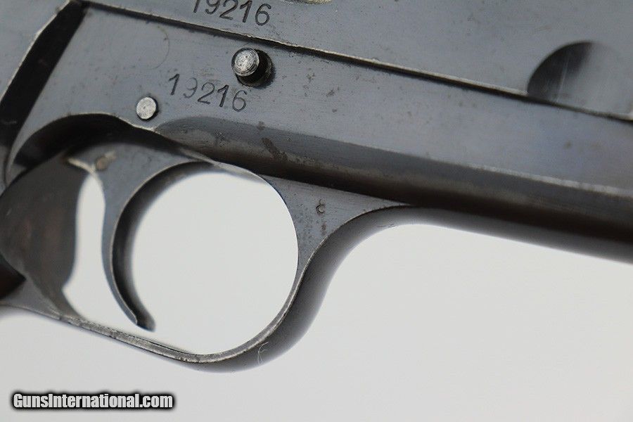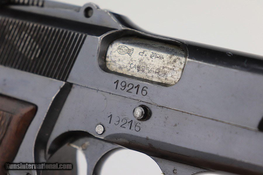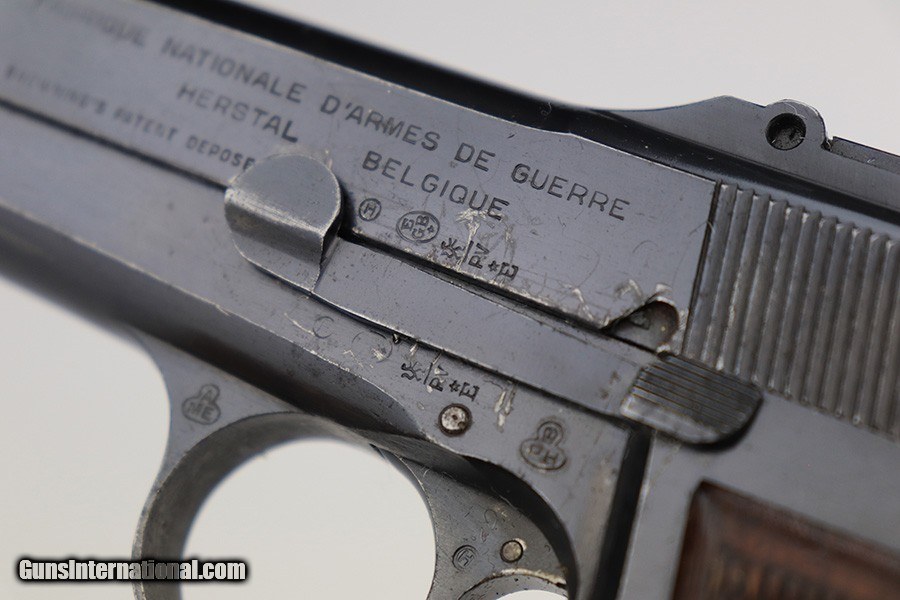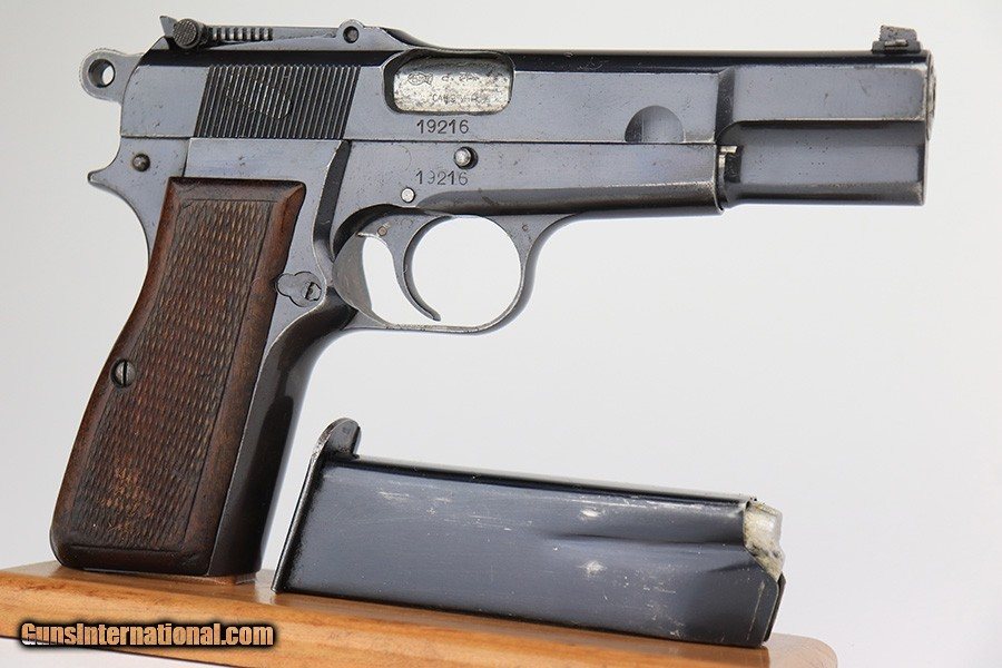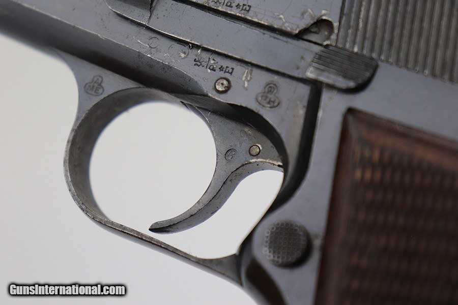 Description: This is an excellent example of an FN Browning High-Power manufactured before WW2. It is all matching and has the proper Belgian proofs. This variant has a slotted frame to accept a wood stock. It has retained 97-98% of its original finish. There is almost no actual finish loss, with minor dulling on the grip straps, a few minor scratches on the left side of the slide, and very minor wear on the front edges of the slide and muzzle. Bore is shiny, with strong rifling and a bit of frost in the grooves. Comes with very nice period-correct wood grips and a reproduction magazine. Now on GB SOLD Curio/Relic: Yes Handgun Caliber: 9x19mm Parabellum (9mm Luger, 9x19mm NATO) |