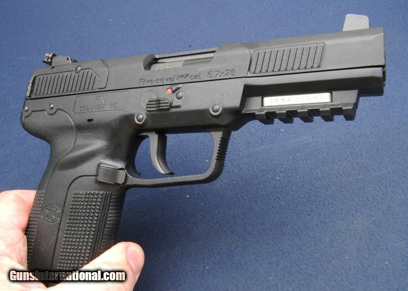 Description: In overall excellent used condition, this earlier FN comes in the big hard case with all paperwork, safety lock and two 20 round magazine kits. Clean gun, a little holster wear, but does not look like it was shot much. $50 shipping to the lower 48, 3% surcharge for using a CC. If you pay with a personal check, you can expect us to hold the item for up to 10 days to ensure that the check clears. SOLD Handgun Caliber: 5.7x28mm |