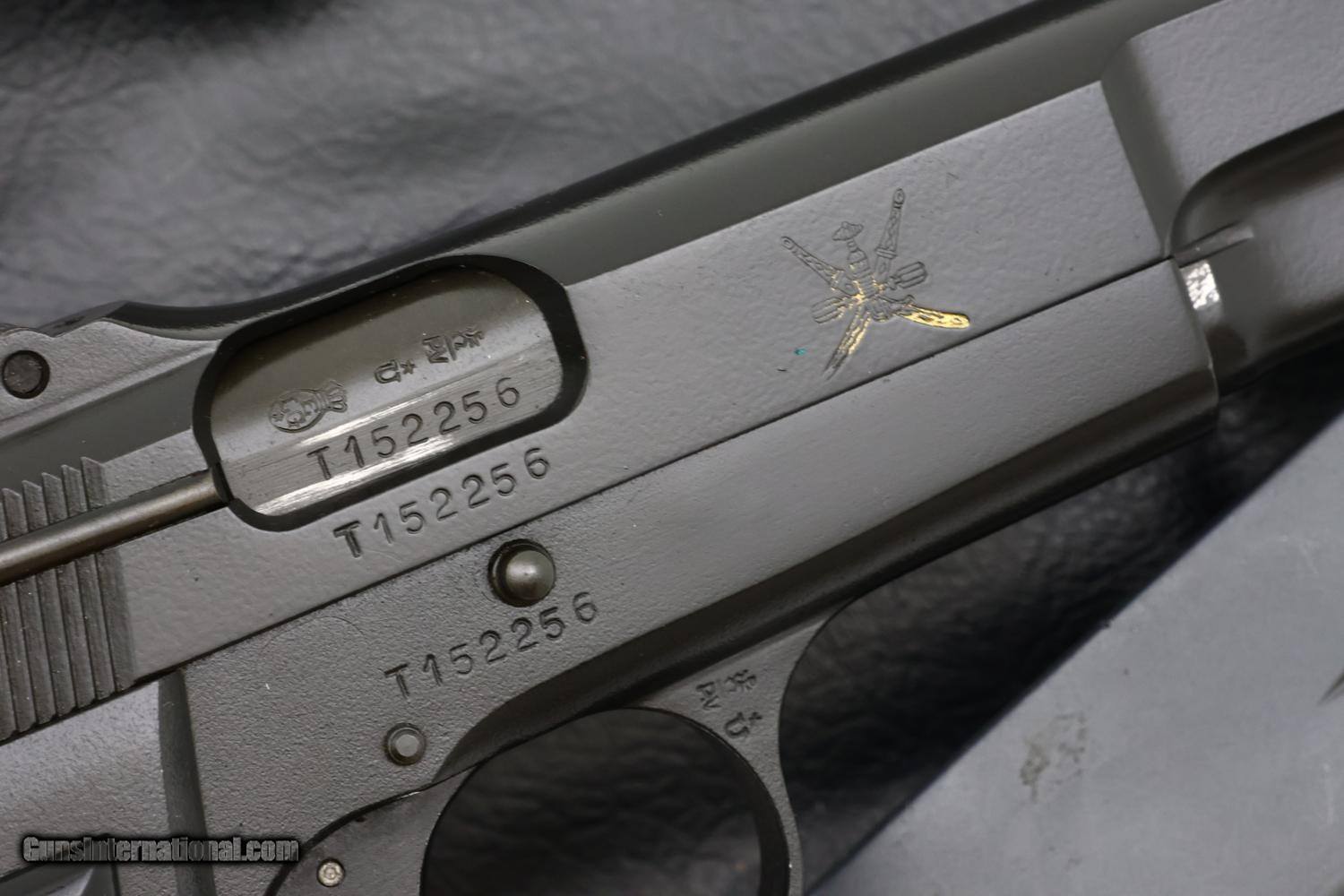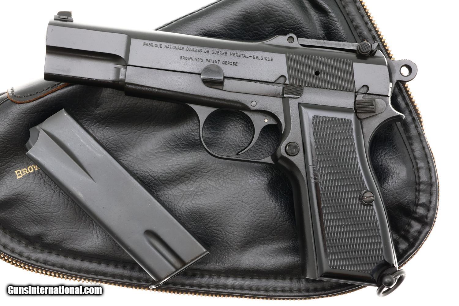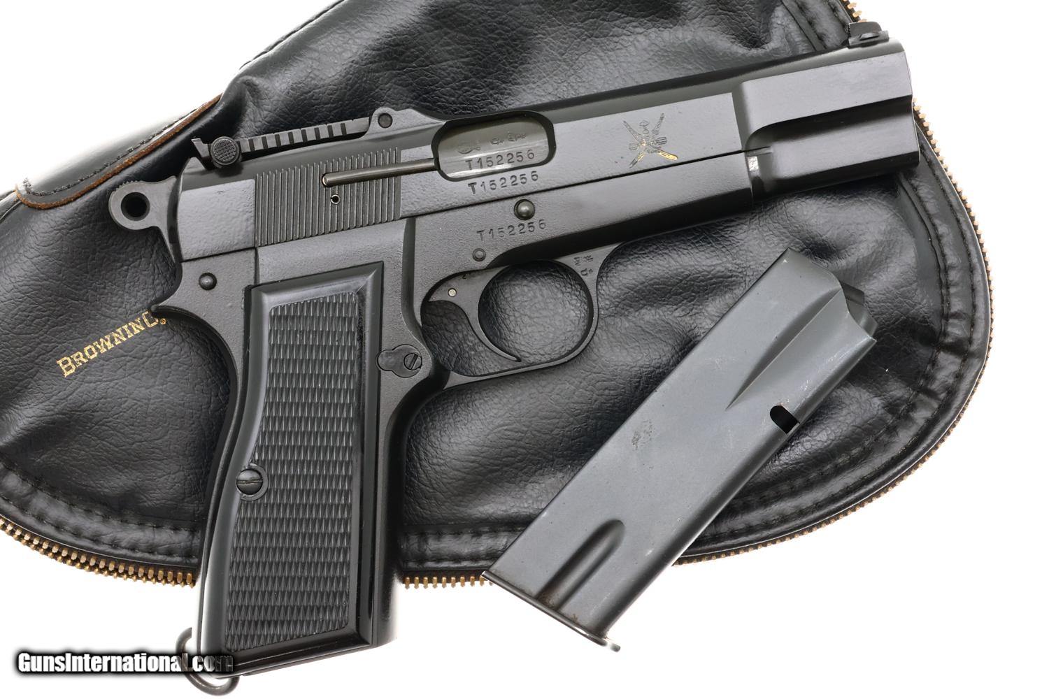 HIGH POWER PISTOLS, FIRST VARIATION SALES SAMPLE. In 1969, a Mr. Paul Van Hee was told of Omani interest in FN High Power pistols. Although he was not a representative of FN, sensing a business opportunity, he purchased a number of High Power pistols in 9mmP and marked them in the US with the Omani crest to use as sales samples. The first nine pistols, this being one, were marked with a reversed Crest having an incorrectly rotated dagger whose sheath was pointed to the right. This pistol, with tangent sight, slotted frame, and ring hammer, was finished in black enamel. The left side of the slide was marked with the late two line FN address. The right side of the pistol has the usual Belgian proofs and stacked serial numbers on the barrel, slide, and frame. The lightly stamped Omani crest has the incorrectly rotated crest as previously detailed. Fitted with black plastic bordered grips, the left panel recessed for the lanyard ring. A correct unmarked magazine with button secured black enameled base. Complete with a Browning marked black plastic brass zippered pouch.