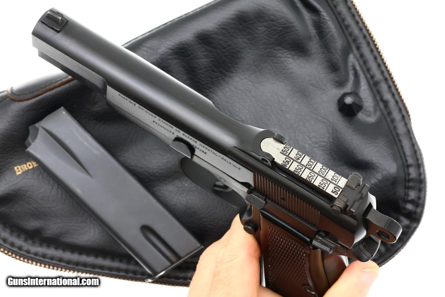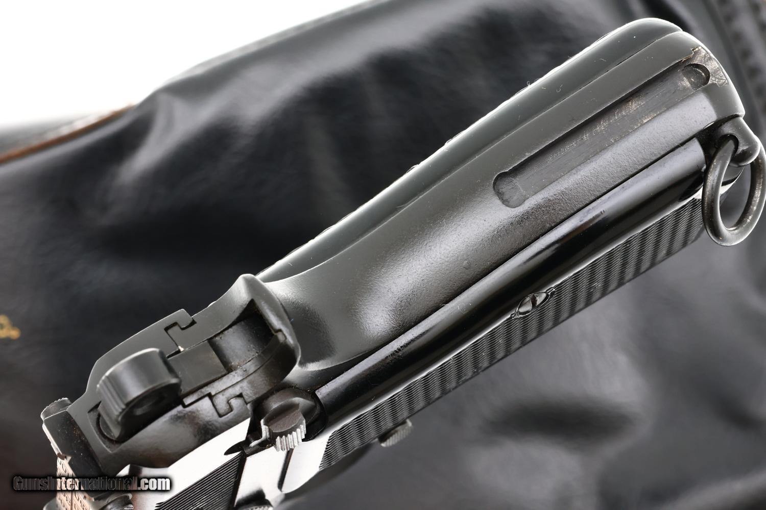 NEAR NEW, the barrel hood with a light mark from having been cycled, front strap with a negligible scuff, left grip with a few tiny marks at front border. Mirror bore. Perfect manual mechanics. EXC pouch. One of the rarest post-war FN HP Pistols, one of nine examples with reversed crest, well documented, and ATF approved to be fitted with a correct shoulder stock without tax stamp!