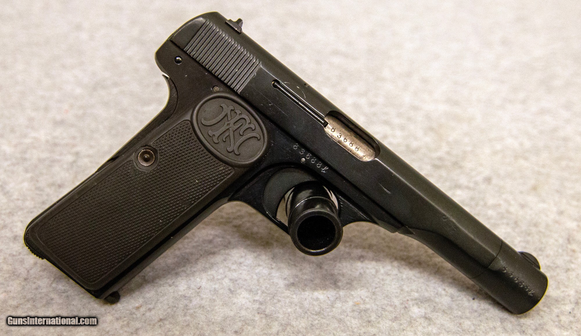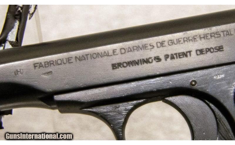 Description: Fabrique National 1922 Waffenampt. Features include: 4 1/2 inch barrel, grip safety, heel release magazine, fixed sights. This pistol was produced in Belgium during the German occupation of World War II. You can see the Waffenampts on the left side of the frame and slide. There is an Eagle over N proof mark on the barrel but no cartridge designation. I believe this most likely is chambered in .32 ACP. Pistol has been reblued sometime in the past, and you can see the pitting on the frame and near the grip safety that is covered by the new bluing. None Chambers: None Metal Condition: Good Bore Condition: Very Good Barrels: 4 1/2'' Sights: Fixed Item Location: Fort Mill, SC Price: $559.99 Contact Seller |