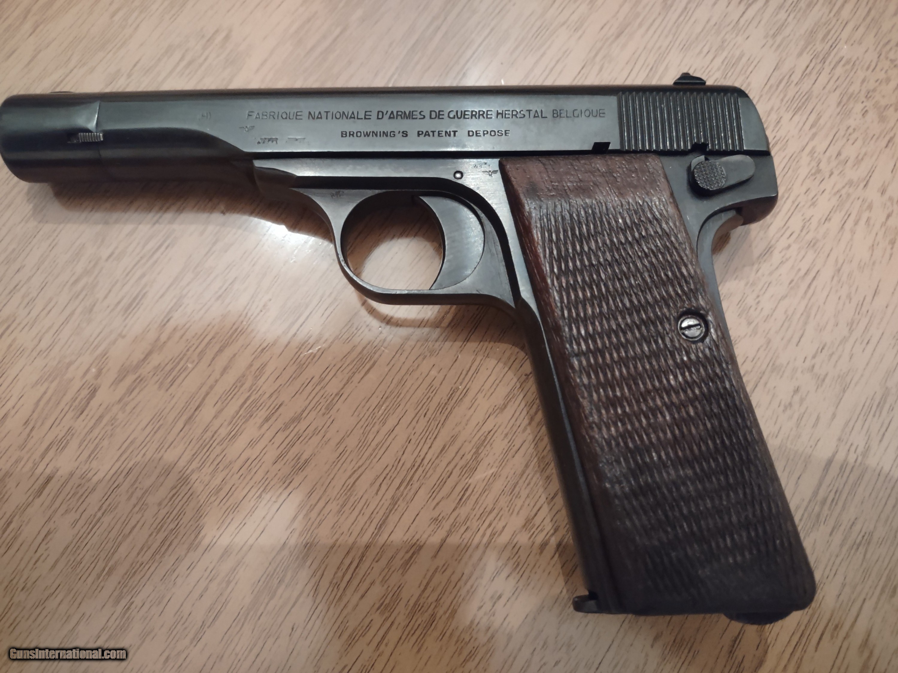 Description: FABRIQUE NATIONALE D'ARMES de GUERRE HERSTAL BELGIQUE, Browning's Patent Depose (H stamp) model 1922 semi-automatic in .32 ACP caliber with all matching serial numbers: 56639a plus Nazi proof marks (eagle) and Waffenamt WAa140 proof marks on frame and slide (hard to read), flawless, glossy bore, 4.25" barrel, grip safety and one FN magazine with Waffenamt proof mark. This model pistol was designed by John Browning and is extremely clean with 99.5% bluing and sharply checkered walnut grip panels. This is the nicest overall FN Model 1922 I have ever seen! The price is $1200 including UPS shipping to the FFL dealer near you. Call or text me at 318-780-4242 if you are interested. SOLD Manufacturer: FABRIQUE NATIONALE Model: 1922 Serial Number: 56639a Barrel Length: 4.25 Bore: Excellent Ejectors: Semi-automatic Condition: Excellent Metal Condition: Excellent Wood Condition: Excellent Bore Condition: Perfect, glossy Barrels: Single Action: Semi-automatic Triggers: Single Finish: Blu Sights: Fixed, open Manufacture Date: WWII or before Engraving: None Case: Soft, zipper carry case Item Location: Shreveport, Louisiana |