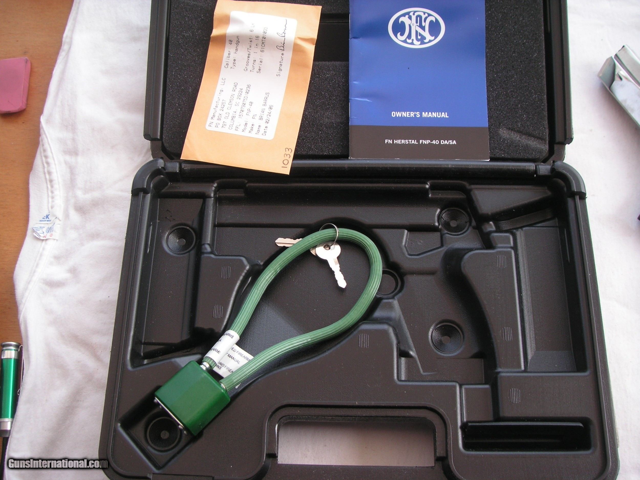 Description: SEE THE PICTURES OF THIS BEAUTIFUL HIGH-QUALITY FAMOS FN PRODUCTION COMPANY PISTOL IN NEW ORIGINAL CONDITION IN CASE WITH THREE 14 ROUNDS MAGAZINES. We offer three days inspection. Only not fired changed parts or condition guns would be accepted. Return shipping cost is the buyer expense. We accept bank & postal money orders or personal & business checks, but those take time to clear. We also offer 90 days layaway with 25% down & three more payments of 25% per month. The layaway plan does not have 3 days inspection privileges; therefore there is “NO RETURNS” policy. If you have offered to buy my guns, and the payment has not made soon after (from 3 to 5 days), I will not guarantee you will be the buyer of it. I can secure your purchase only when you have paid for it. If your payment comes too late, I will return it back to you. Please check our other nice listings. SAFETY NOTICE: Buyer solely responsible for following all safety requirements in handling guns. By , the buyer agrees to hold seller harmless against damages, injury or death caused by defective merchandise or ammo. If you like, we can negotiate terms of shipping. The offered shipping price includes insurance cost & priority mail cost only. SOLD Manufacturer: FABRIQUE NATIONALE, BELGIUM Model: FNP40 Serial Number: 61CMT01033 Caliber Info: .40 S&W Bore: NEW Condition: EXCELLENT Metal Condition: EXCELLENT |