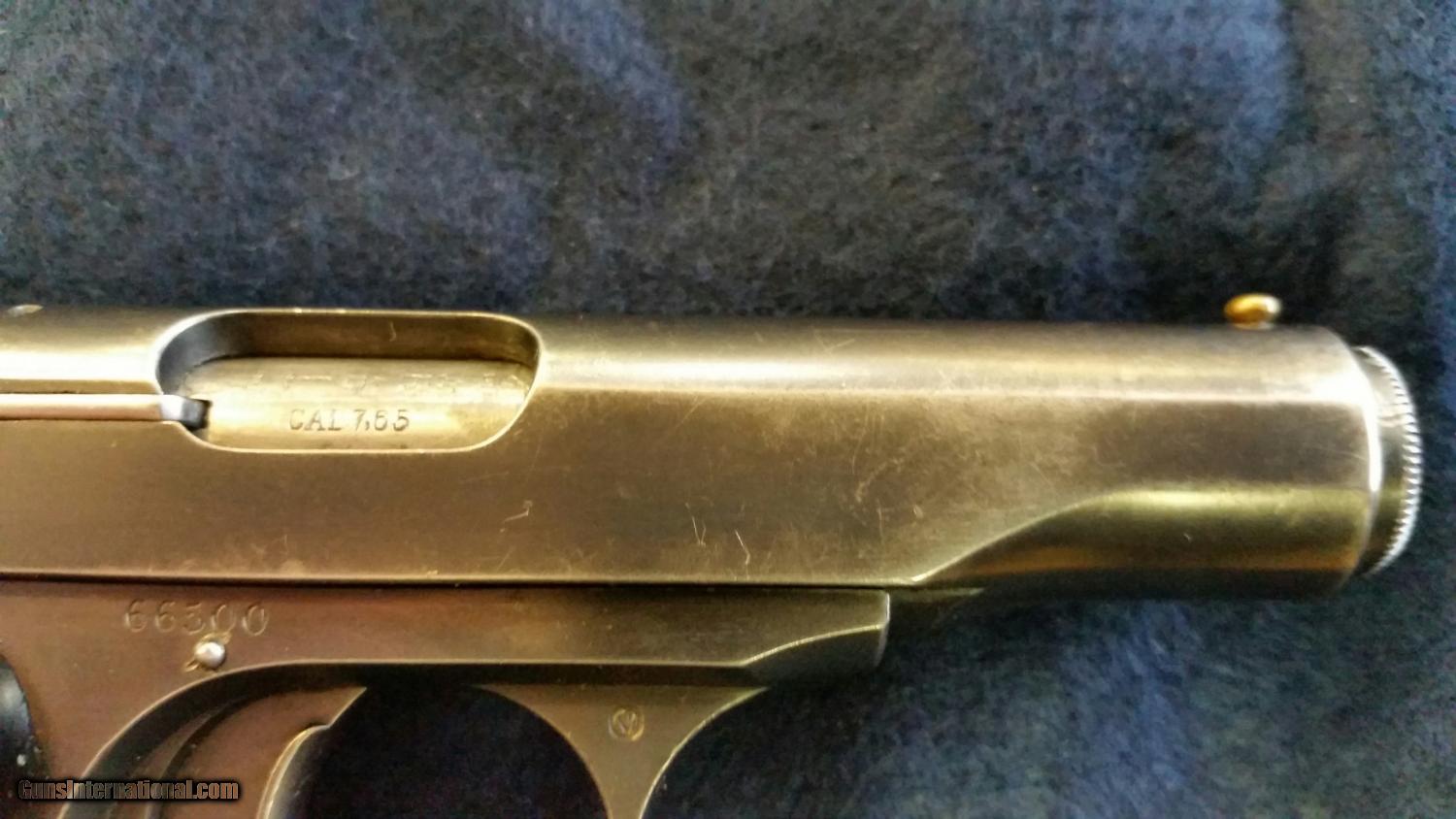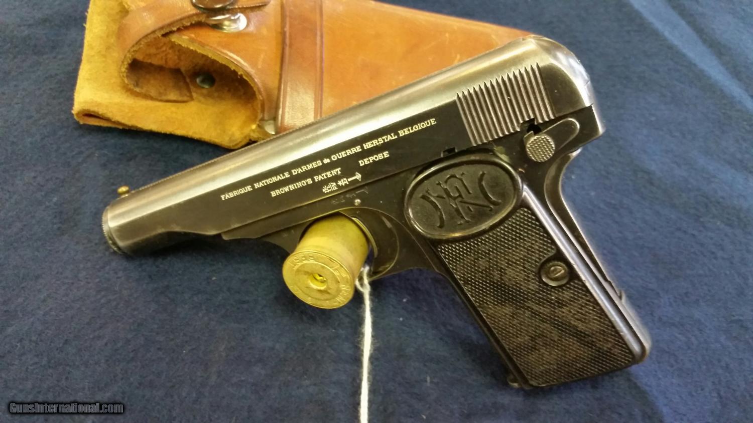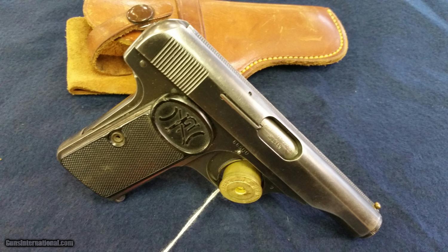 Description: FN 1910/22 pistol in .32acp. This pistol features a 4.5 inch barrel, a grip safety, black hard rubber grips, fixed sights, and leather holster. This particular example has the typical Belgian proof marks on the slide and barrel and is also marked with an V inside of a square on both the left and right hand side of the triggerguard. Most of the original bluing remains and the bore is in very good condition. This is a very good 1910/22 with both collector and shooting value. SOLD Curio/Relic: Yes Model: 1910 Caliber Info: 32 ACP Condition: VG Metal Condition: VG |