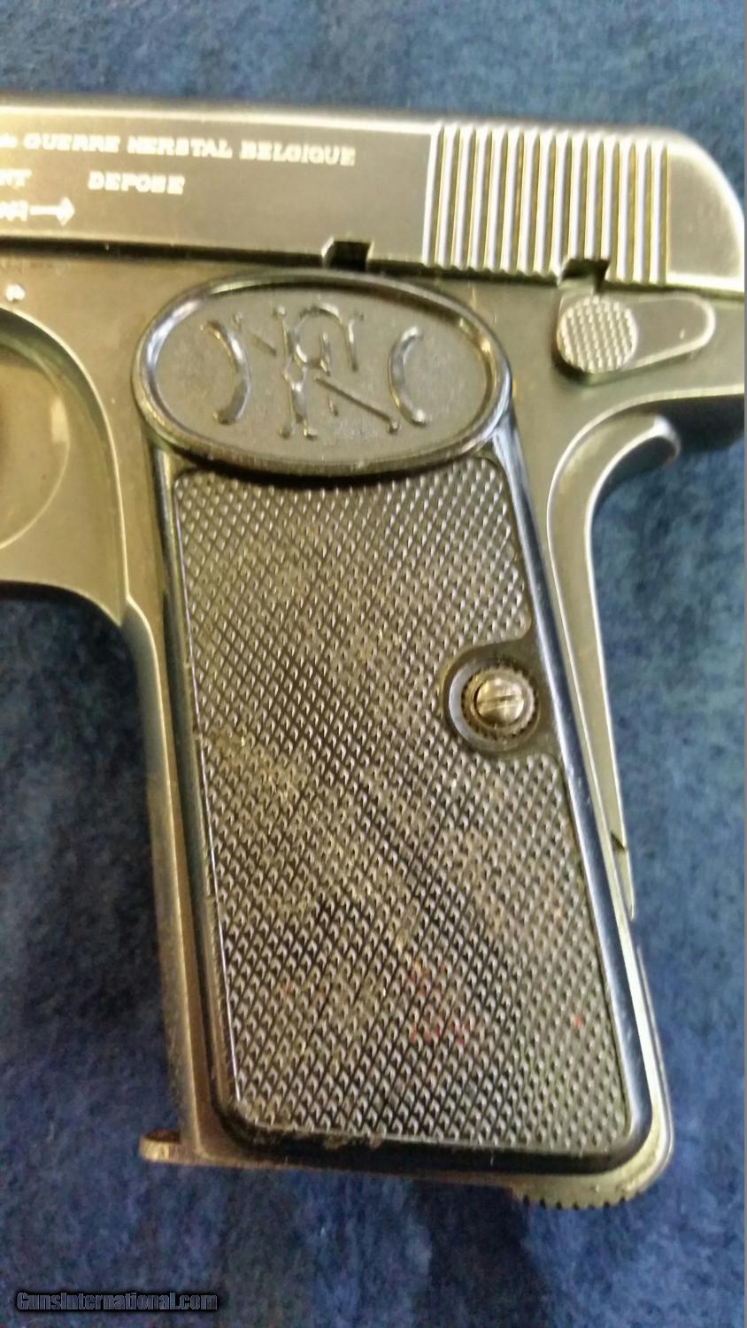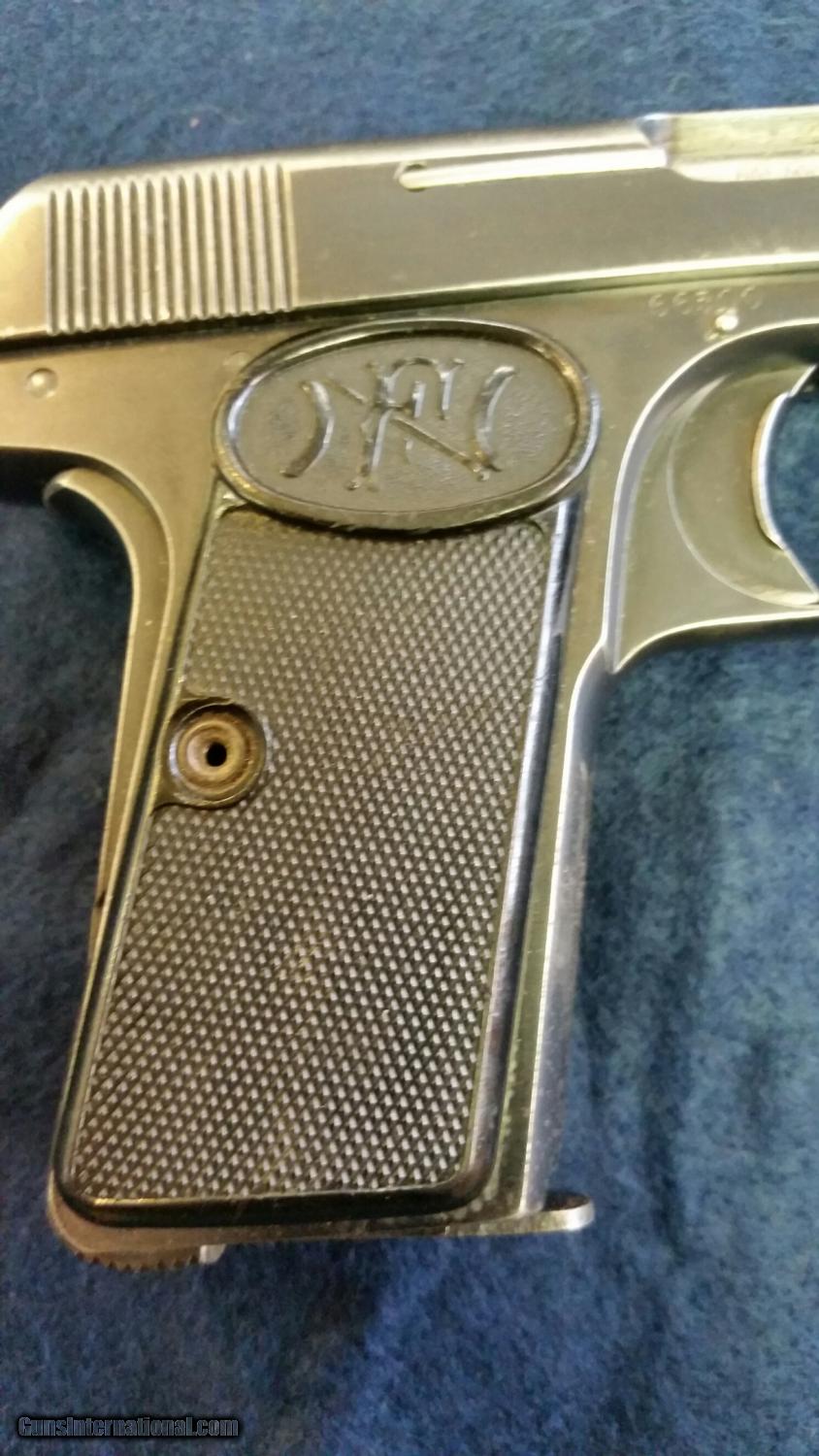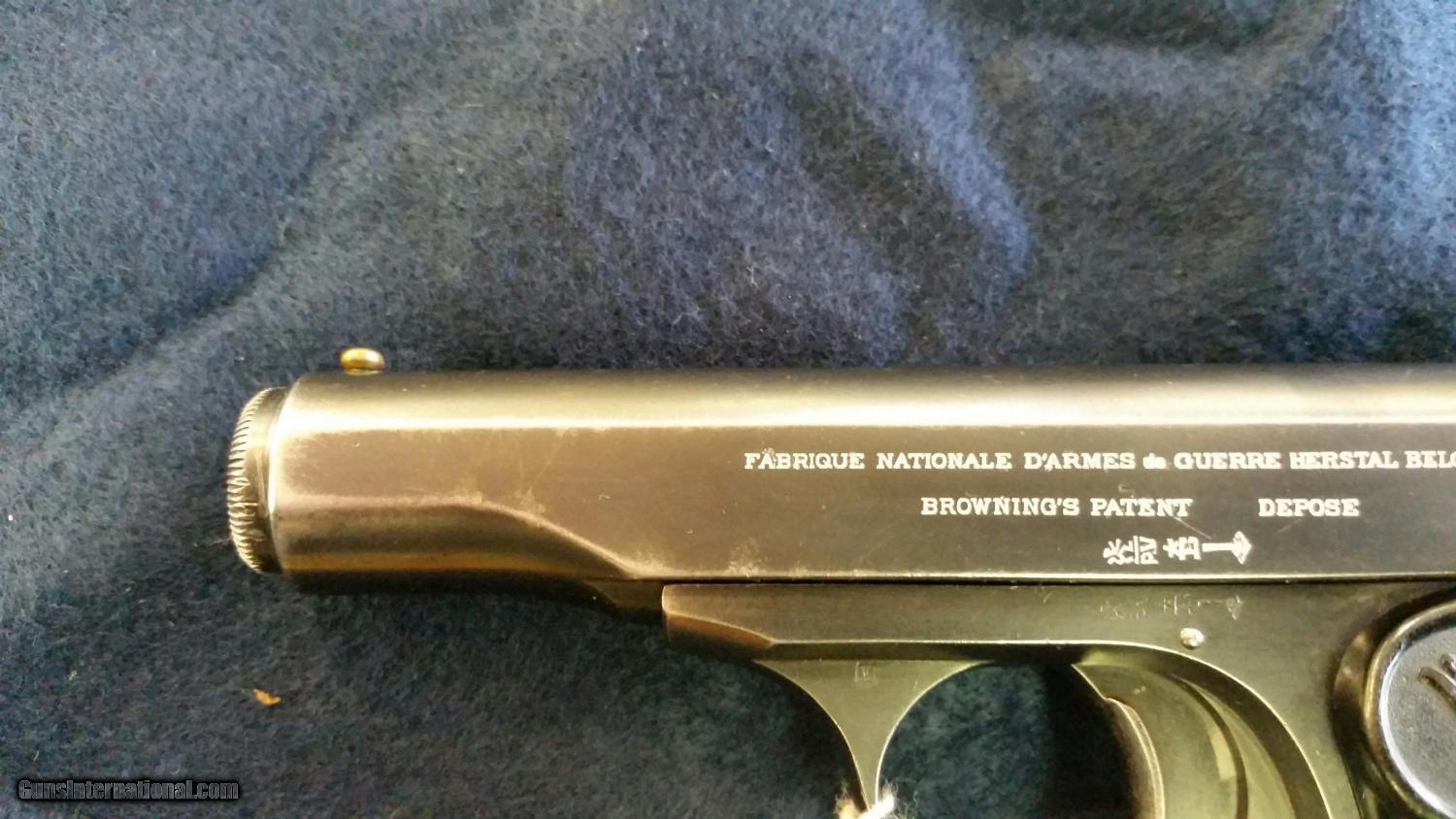 Description: FN 1910/22 pistol in .32acp. This pistol features a 4.5 inch barrel, a grip safety, black hard rubber grips, fixed sights, and leather holster. This particular example has the typical Belgian proof marks on the slide and barrel and is also marked with an V inside of a square on both the left and right hand side of the triggerguard. Most of the original bluing remains and the bore is in very good condition. This is a very good 1910/22 with both collector and shooting value. SOLD Curio/Relic: Yes Model: 1910 Caliber Info: 32 ACP Condition: VG Metal Condition: VG |