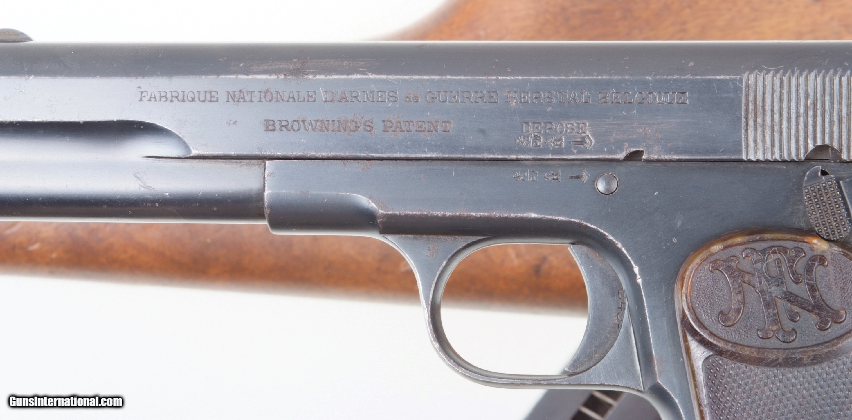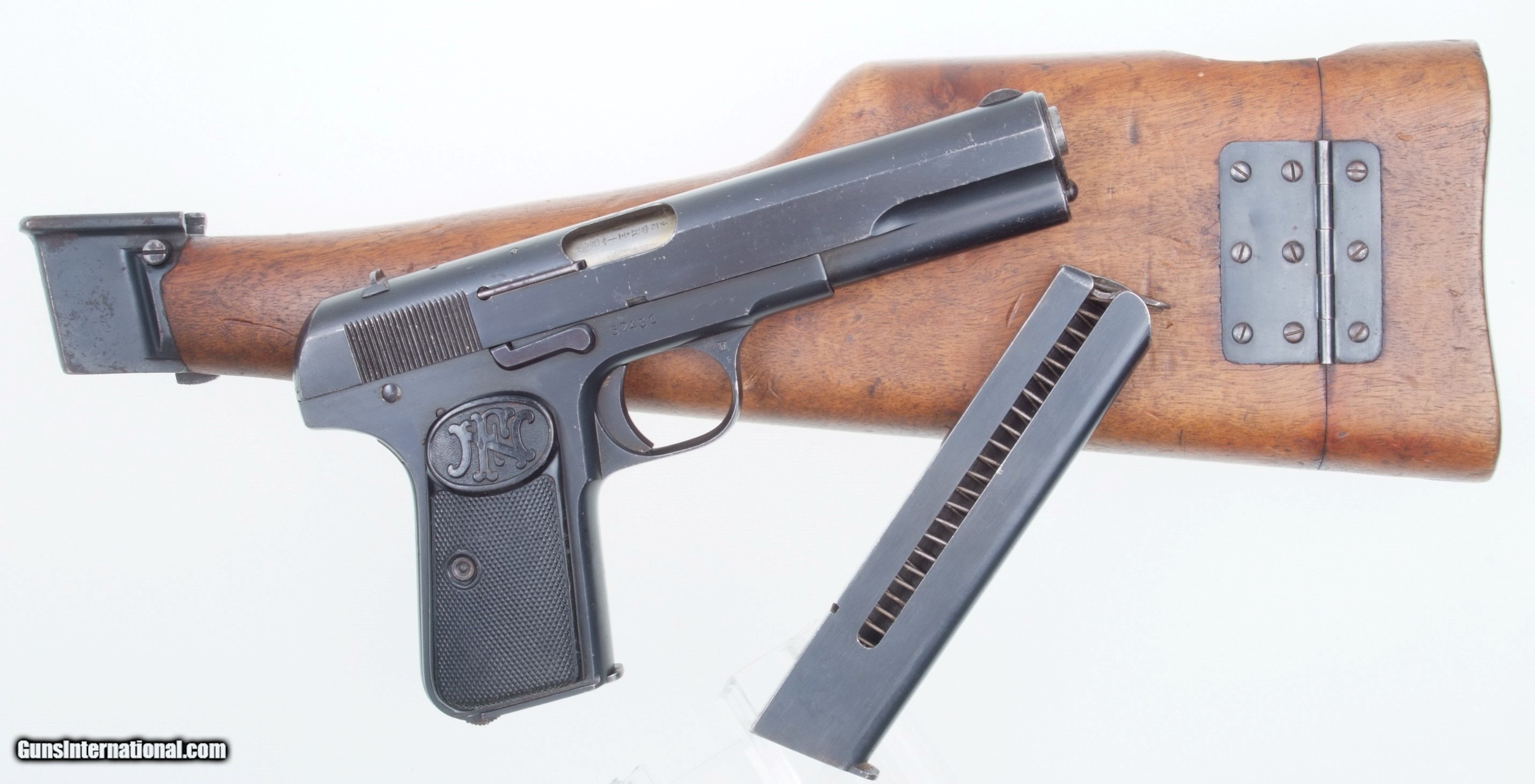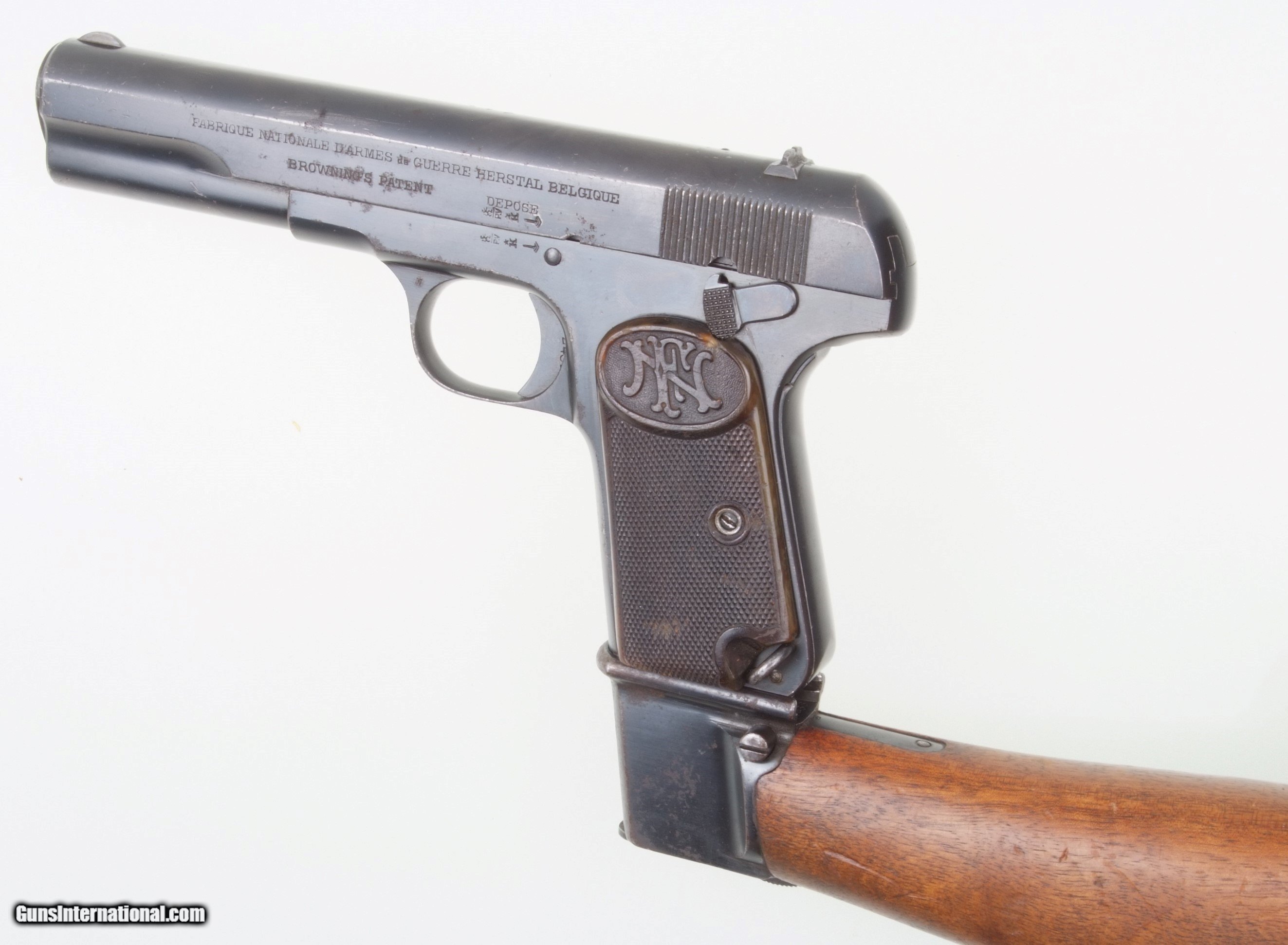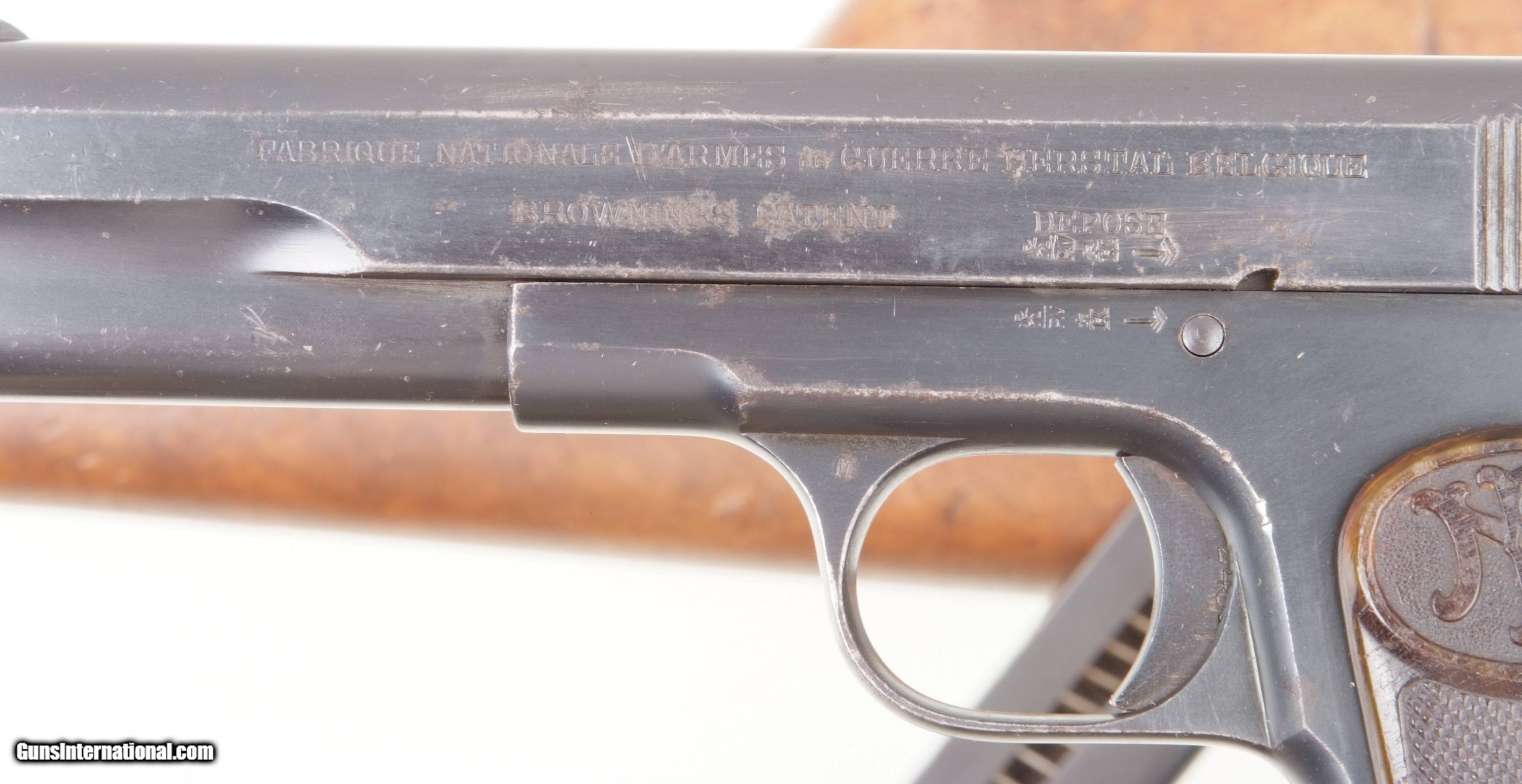 Description: One of very few standard configuration FN 1903 pistols factory slotted at the base to accept uniquely designed hollowed shoulder stock recessed for pistol, extended magazine and no cleaning rod. The stock slides unto the bottom of the pistol, effectively acting as an extension of the frame, the lug providing a fixture through which fits the extended magazine. Pistol has the usual fixed front sight and drift adjustable rear sight. Left side of slide with two line address, large lettering referencing manufacturer in Belgium and Browning’s patent. Belgium proof marks on adjacent slide, repeated on frame and exposed barrel hood. Full serial number on right sight of frame. Fitted with checkered grips, each panel molded with the intertwined FN logo over a finely checkered field. Hollowed shoulder stock has lug #40468. Standard and extended magazines each cut with a single viewing slot on the right side and no markings. Synopsis: Very scarce FN 1903 “War Model” pistol with original shoulder stock and extended magazine. Condition: Very good original rust blue with scattered speckling and wear particularly on the left side of the slide as photographed. Comparable condition grip straps. Original grips with slightly blunted checkering but no discernible cracks. Mirror bore. Perfect manual mechanics. Although the stock is mismatched it is in the same general condition as the pistol, making for a very attractive and rarely encountered ensemble. A HISTORIC INVESTMENT! ~~Insured shipping fee of $155; most packages shipped using FedEx 2nd Day.~~ SOLD Curio/Relic: Yes Manufacturer: FN Serial Number: 52431 Caliber Info: 9 mmBL |