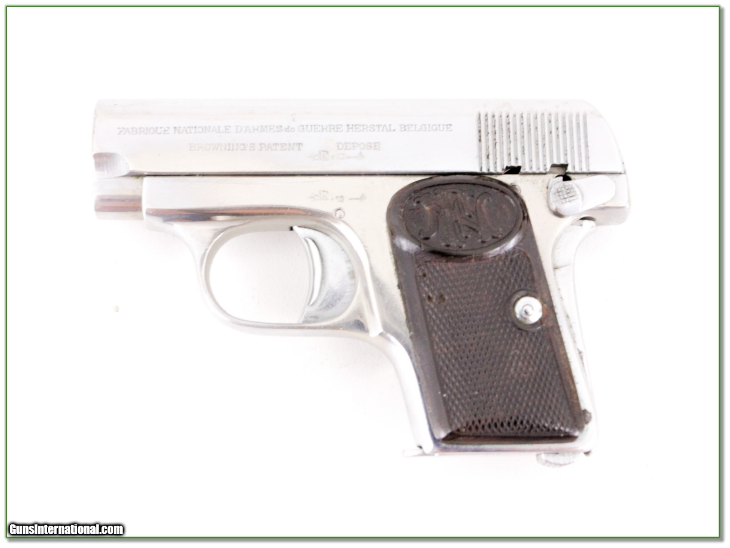 Description: Collectors, this is a hard to find all original FN 25 ACP. It is chrome and similar but not like Baby Browning. These have a grip safety. It will make a fine addition to your collection. I am selling this one on consignment and as such lay-a-way can’t be used. It does of course have the standard 3-day inspection. Shipping with insurance is $39. Please email me with any questions or larger pictures. (Consign your quality firearms with Shooting Investments for only 12%! Let me know if you have any you would like to sell!) 18-1107 Payment: Payment is by Money Order, Cashiers Check or Personal Check. I can now also accept MasterCard and Visa with a 3% convenience fee. PayPal can be used for some items but never firearms. Please let us know if you would like to pay via PayPal. Shipping: The shipping charge will be listed in each description. It is $39 for most long guns and $29 for most handguns. Some heavy guns or those insured for over $2000 will be higher. Shipments to Alaska and Hawaii are higher because air shipment is required. Most firearms are shipped on Tuesday and Thursday and usually in 5 days of receipt of payment. We package all shipments carefully and insure them. For long guns you can purchase a new Plano case for $19. They now cost us $22 when buying 100 at a time. Optics are shipped Priority Mail and most other non-firearm shipments are shipped First Class. Returns: Our return policy is simple. If for any reason you are not pleased with your purchase, you may return your item for a full refund of purchase price. Ammunition cannot be returned. It is important to us that you are happy. Guns cannot be fired or dissembled before returning them and they must be returned in the same condition as received. Notification of a return must occur with-in 3 days of receipt at your dealer. Shipping, convenience and dealer fees are not refundable and are the responsibility of the buyer. Lay-a-way: If needed, we offer a 60 day lay-a-way option on most firearms. It is 1/3 now, 1/3 in 30 days and 1/3 in 60 days. Lay-a-way firearm sales are final and if not completed the first payment cannot be returned. Consigning your firearms with Shooting Investments: We will help you get top dollar for your firearms. While most local guns shops charge 20% or more, our fee is only 12% with a minimum of $75. At your local gun shop it might take months to sell. Selling on-line provides instant access to thousands of interested buyers. You won’t find any other on-line dealer willing to sell your firearms for only 12% or listing every gun on 3 separate s. Selling through an House typically costs the seller 15% and the buyer an addition 15% (so 30%) and you have to wait several months to sell and longer to receive funds. If properly priced, we will sell your firearms in a few weeks. Send us an email or give us a call and we’ll explain how easy it is for you to get top dollar. Trading: Trading for use is really just buying your gun to re-sell. If you have a gun you want to trade, please email a picture and we will let you know what we can give or it. You will always get more if we sell it for you on consignment. Help for California Buyers: We are happy to ship to California. It is the buyer’s responsibility to make sure any item you buy is legal in your state. We are also happy to help with your purchase of a firearm from someone other than us. If you see a gun you would like to buy but the seller can’t or won’t ship to California they can ship to use and we’ll then ship it to your California dealer. The cost for this service is only $30 + shipping. Let us know if we can help! SOLD |