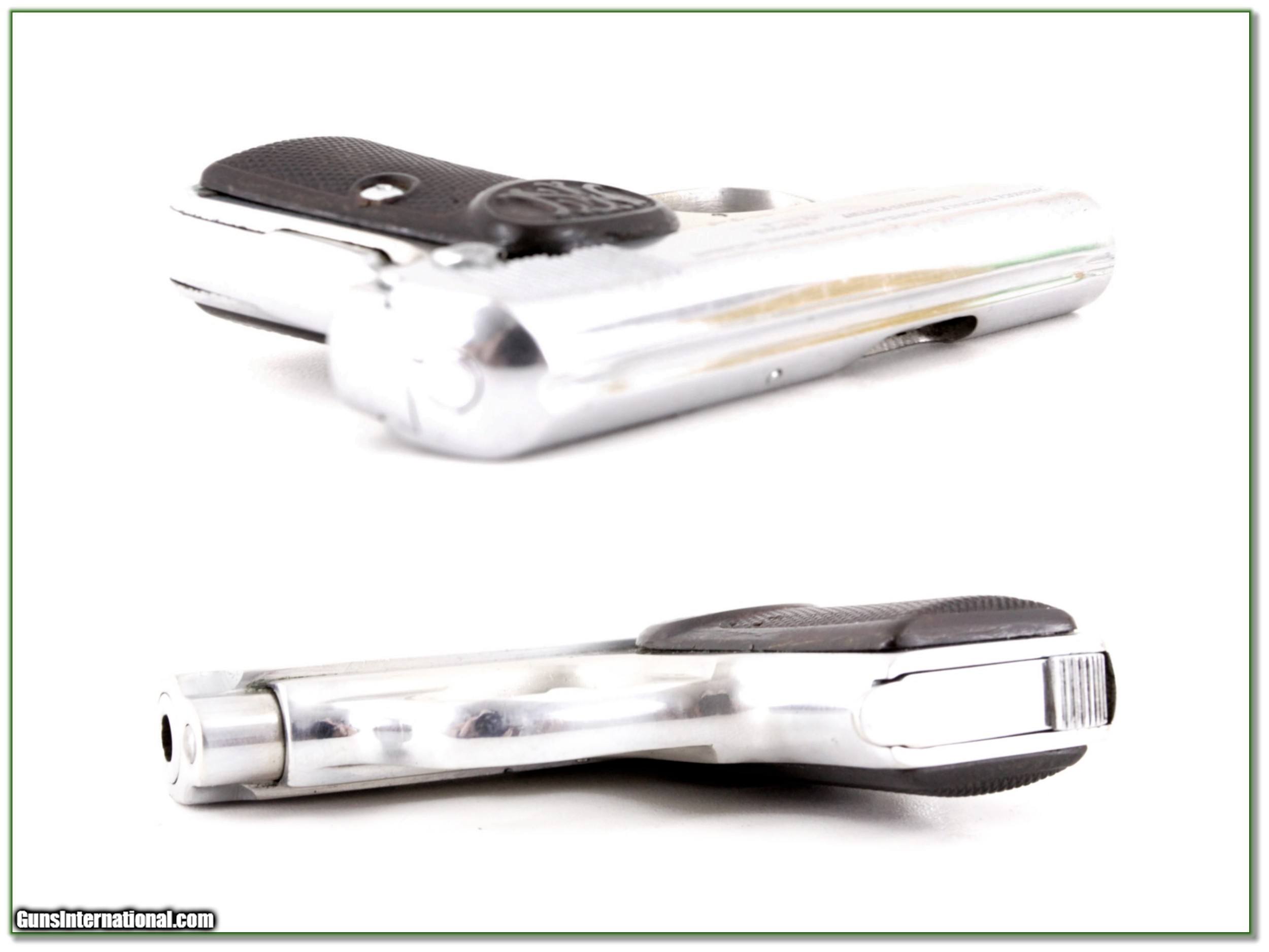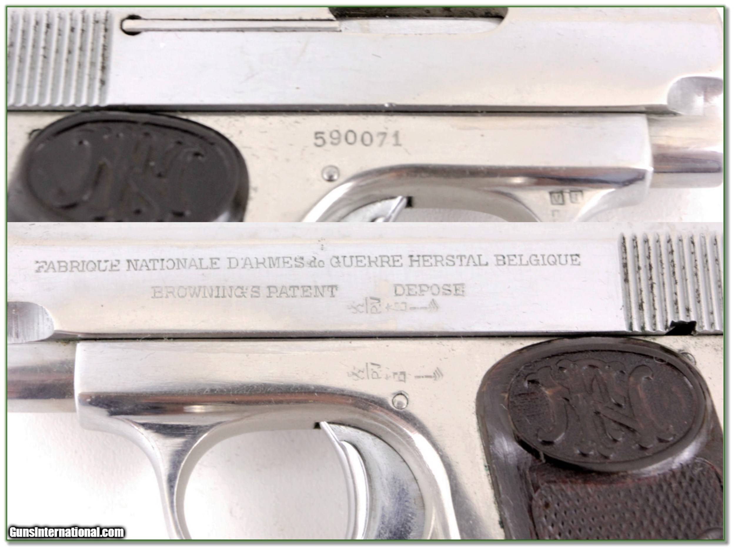 Description: Collectors, this is a hard to find all original FN 25 ACP. It is chrome and similar but not like Baby Browning. These have a grip safety. It will make a fine addition to your collection. I am selling this one on consignment and as such lay-a-way can’t be used. It does of course have the standard 3-day inspection. Shipping with insurance is $39. Please email me with any questions or larger pictures. (Consign your quality firearms with Shooting Investments for only 12%! Let me know if you have any you would like to sell!) 18-1107 Payment: Payment is by Money Order, Cashiers Check or Personal Check. I can now also accept MasterCard and Visa with a 3% convenience fee. PayPal can be used for some items but never firearms. Please let us know if you would like to pay via PayPal. Shipping: The shipping charge will be listed in each description. It is $39 for most long guns and $29 for most handguns. Some heavy guns or those insured for over $2000 will be higher. Shipments to Alaska and Hawaii are higher because air shipment is required. Most firearms are shipped on Tuesday and Thursday and usually in 5 days of receipt of payment. We package all shipments carefully and insure them. For long guns you can purchase a new Plano case for $19. They now cost us $22 when buying 100 at a time. Optics are shipped Priority Mail and most other non-firearm shipments are shipped First Class. Returns: Our return policy is simple. If for any reason you are not pleased with your purchase, you may return your item for a full refund of purchase price. Ammunition cannot be returned. It is important to us that you are happy. Guns cannot be fired or dissembled before returning them and they must be returned in the same condition as received. Notification of a return must occur with-in 3 days of receipt at your dealer. Shipping, convenience and dealer fees are not refundable and are the responsibility of the buyer. Lay-a-way: If needed, we offer a 60 day lay-a-way option on most firearms. It is 1/3 now, 1/3 in 30 days and 1/3 in 60 days. Lay-a-way firearm sales are final and if not completed the first payment cannot be returned. Consigning your firearms with Shooting Investments: We will help you get top dollar for your firearms. While most local guns shops charge 20% or more, our fee is only 12% with a minimum of $75. At your local gun shop it might take months to sell. Selling on-line provides instant access to thousands of interested buyers. You won’t find any other on-line dealer willing to sell your firearms for only 12% or listing every gun on 3 separate s. Selling through an House typically costs the seller 15% and the buyer an addition 15% (so 30%) and you have to wait several months to sell and longer to receive funds. If properly priced, we will sell your firearms in a few weeks. Send us an email or give us a call and we’ll explain how easy it is for you to get top dollar. Trading: Trading for use is really just buying your gun to re-sell. If you have a gun you want to trade, please email a picture and we will let you know what we can give or it. You will always get more if we sell it for you on consignment. Help for California Buyers: We are happy to ship to California. It is the buyer’s responsibility to make sure any item you buy is legal in your state. We are also happy to help with your purchase of a firearm from someone other than us. If you see a gun you would like to buy but the seller can’t or won’t ship to California they can ship to use and we’ll then ship it to your California dealer. The cost for this service is only $30 + shipping. Let us know if we can help! SOLD |