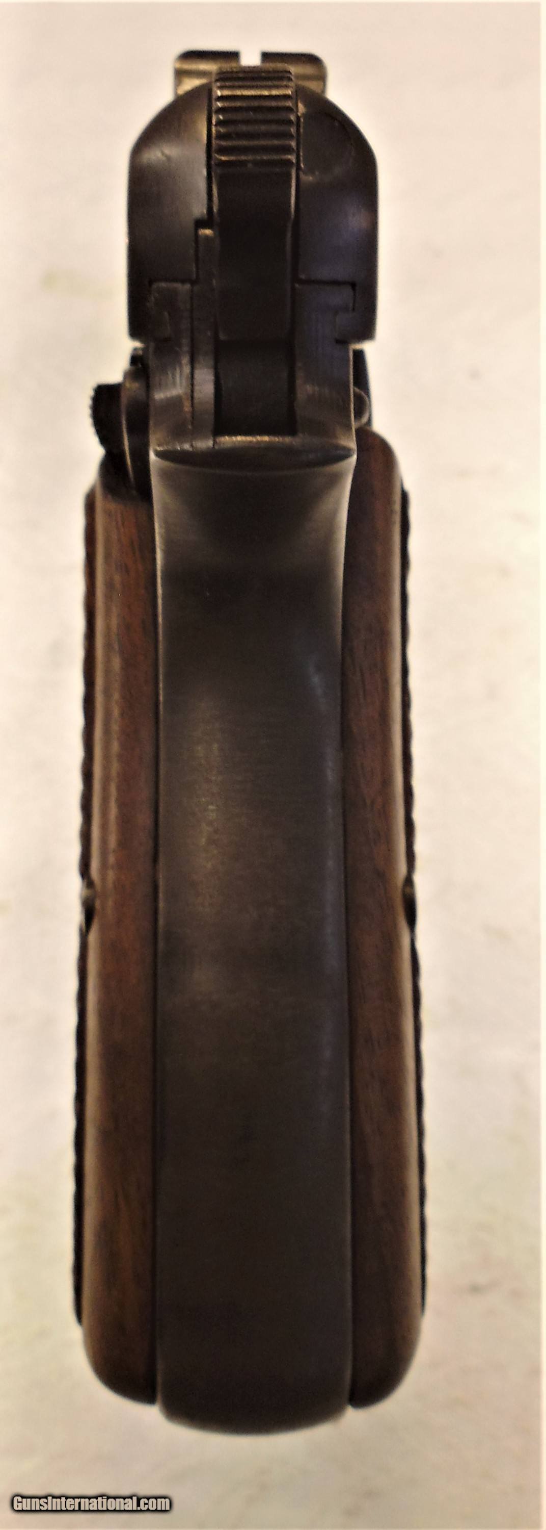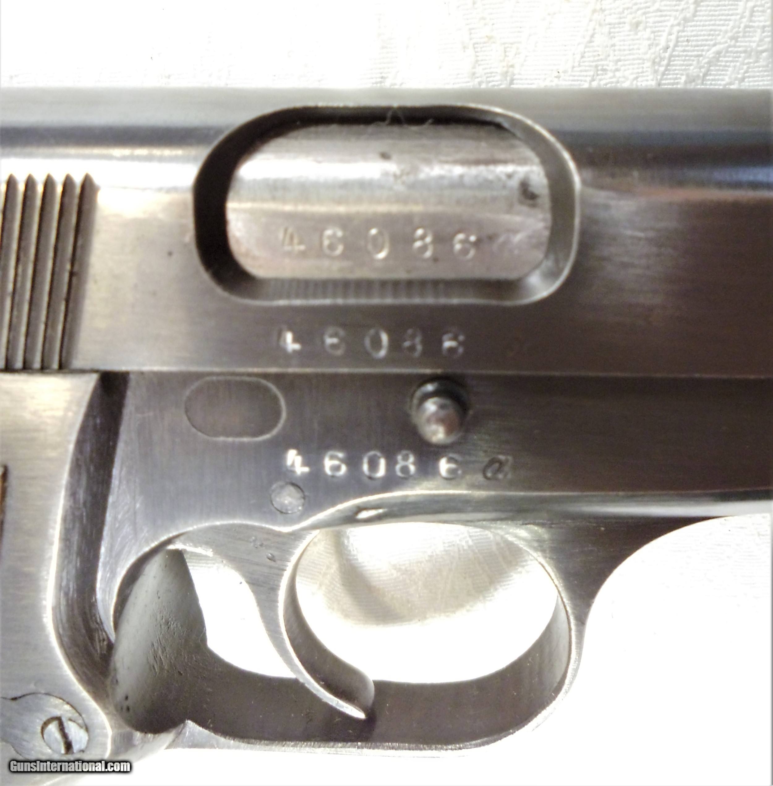 Description: FN (Browning) Hi Power. alpha serial #. All numbers match. Nazi marked on all relevant parts. 2 magazines. Split tail but not marked. Holster with proper marks. Front and back of grip show discoloration. Otherwise in very good condition. SOLD Manufacturer: Fabrique Nationale Model: P35 Serial Number: 46080a Caliber Info: 9mm |