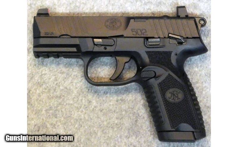 Description: FN ~ 502 ~ Chambered in .22 Long Rifle. Is a small double action hammer fire rimfire pistol with an optimization on training and recreational plinking. Features a 4" barrel paired with iron sights, and a sleek black finish. Comes with factory box and a single 10 + 1 capacity magazine. .22 Long Rifle SOLD Chambers: .22 Long Rifle. Metal Condition: Very good condition. Bore Condition: Good condition. Triggers: 5 pounds. Weight: 1.5 pounds Sights: Iron sights. Item Location: Acworth, GA |
