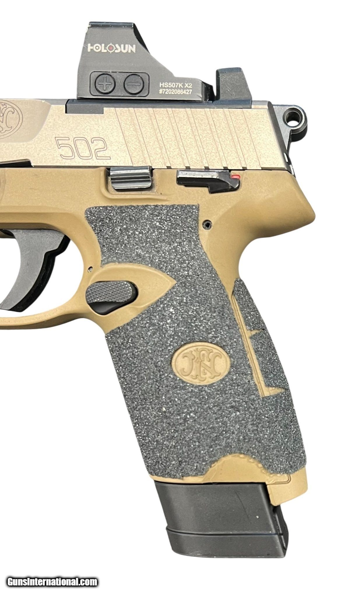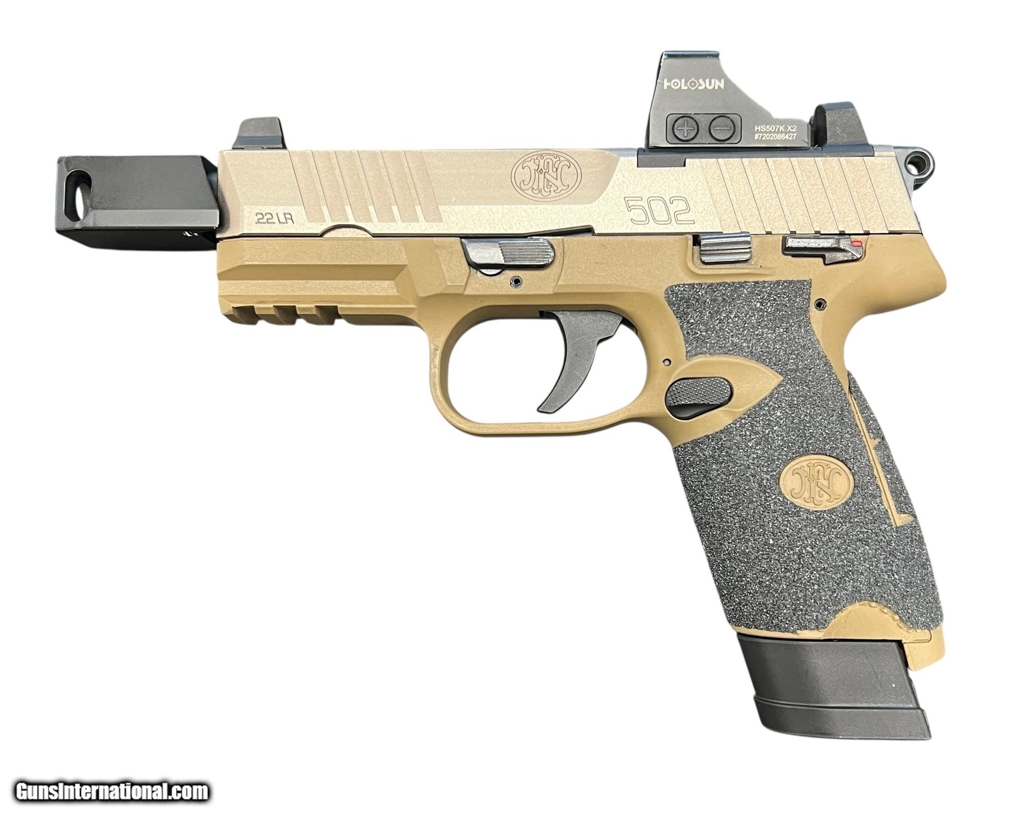Description: Guns Listing ID: 548351 Manufacturer: FNH Importer: FNH Model: 502 Type: Handgun Action Type: Semi-Automatic Caliber / Gauge: .22 LR Finish: Flat Dark Earth Barrel Type: Single Grip Type: Polymer Barrel Length: 5\" Magazine Capacity: 10 Magazine Quantity: 2 Case Type: Case - Hard Condition: Used Notes: Includes Original Case, Holosun Red-Dot, Grip Tape, Cable Gun Lock and Owner‚s Manuel 1x10rd Mag + 1x15 Rd Mag SOLD Manufacturer: FN Model: 502 Caliber Info: .22 LR Condition: Used - Non-Certified Barrels: 5 BARREL Action: SEMI AUTOMATIC Finish: Flat Dark Earth |