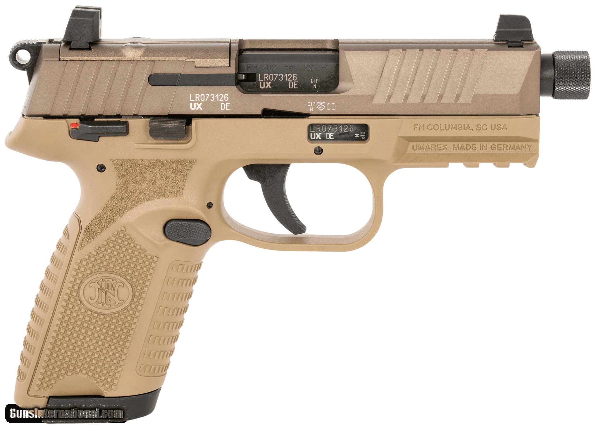 Description: Guns Listing ID: 376251 FN 502 Tactical Optic Ready .22LR FDE 4.6\" Threaded Barrel 5 Mag Bundle with 1-10+1 & 4-15+1 SOLD Manufacturer: FN Model: 502 TACTICAL Caliber Info: .22 LR Condition: new Barrels: 4.5 BARREL Action: SEMI AUTOMATIC Finish: FLAT DARK EARTH |