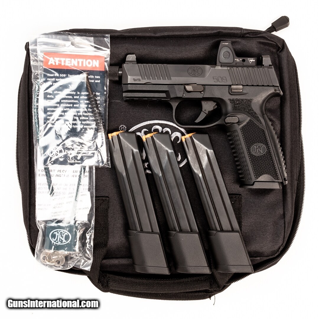 Description: Guns Listing ID: 869790 The FN 509 is built on the proven architecture of the FNS Compact. FN made changes internally and externally to meet the rigorous performance standards of the MHS requirements and, with the help of industry experts, further developed the platform into the FN 509. Over the course of development, the platform has been tested extensively for reliability, ammunition compatibility, and durability – totaling more than one million rounds. Well-equipped for self-defense and tactical applications, this 509 features night sights and a red dot. Purchase includes the original soft case, one 17-round magazine, and three 24-round magazines. Get the best bang for your buck when you get a Certified Used Firearm . When you see the Certified Used stamp on any of our firearms, you can be confident that you’re getting exactly what you want – a gun only in very good to excellent condition and held to the highest quality standard. All Certified Used Guns come with a ‘no questions asked’ return policy . PLUS, ALL CERTIFIED USED GUNS SHIP FREE! SOLD Manufacturer: FN Model: 509 Caliber Info: 9MM LUGER (9X19 PARA) Condition: Used - Non-Certified Barrels: 4.5 BARREL Finish: BLACK |