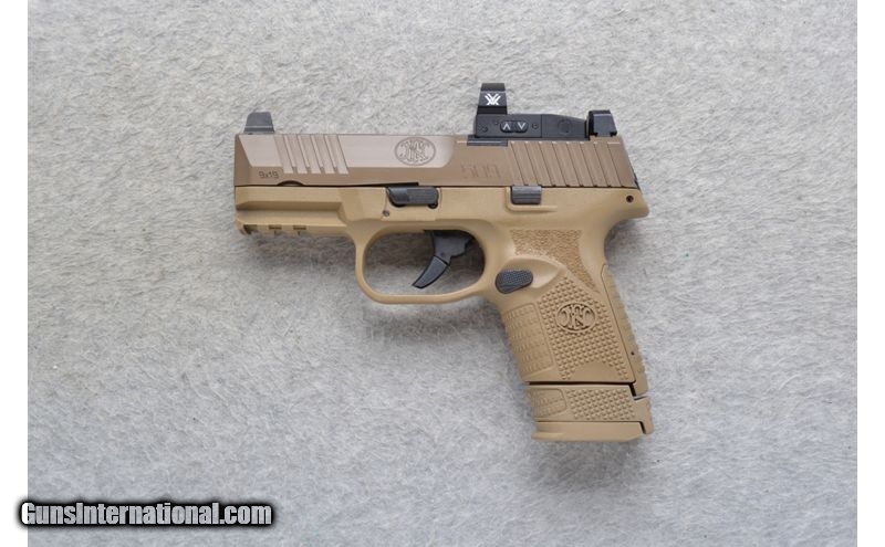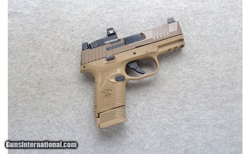 Description: This FN Model 509 is a right hand semi-auto pistol in 9mm Cal. It has a 3.5 inch barrel with a front and rear serrated FDE slide. A blade front, notch rear and Vortex Venom 6MOA red dot sight. The grip is a deep cut checkered tan polymer. It has a lower accessory rail. 9mm Parabellum SOLD Chambers: Semi-Auto 15 round magazine. Metal Condition: Excellent. Bore Condition: Excellent. Barrels: 3.5 inch barrel with a front and rear serrated slide. Weight: 24 oz. Sights: Blade front. Notch rear. Vortex Venom 6MOA red dot sight. Item Location: Richfield, WI |