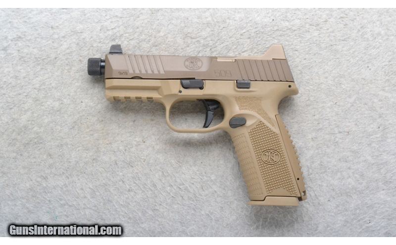 Description: This FN Model 509 is a right hand semi-auto pistol in 9mm Cal. It has a 4.5 inch threaded end barrel and with a front and rear serrated slide. A blade front sight and notch rear sight with 3 luminous sight dots. The grip is a deep checkered tan polymer. It has a lower accessory rail. 9mm Parabellum SOLD Chambers: (1) 17 round magazine. (2) 24 round magazines. Metal Condition: Excellent. Bore Condition: Excellent. Barrels: 4.5 inch barrel with a threaded end and a front and rear serrated slide. Weight: 30 Oz. Sights: Blade front. Notch rear. 3 luminous sight dots. Item Location: Richfield, WI |