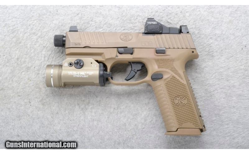 Description: This FN Model 509 is a right hand semi-auto pistol in 9mm Cal. It has a 4.5 inch threaded end barrel and with a front and rear serrated slide. A blade front sight and notch rear sight with 3 luminous sight dots. It is outfitted with a Vortex viper red dot sight. The grip is a checkered polymer. It has a lower accessory rail with a Streamlight TLR-1 HL white LED light. 9mm Parabellum SOLD Chambers: 17 round magazine. Metal Condition: Good. Has light handling/use marks. Bore Condition: Excellent. Barrels: 4.5 inch threaded end barrel with a front and rear serrated slide. Weight: 34 oz. Sights: Blade front. Notch rear. 3 luminous sight dots. Vortex Viper red dot sight. Streamlight white LED. Item Location: Richfield, WI |